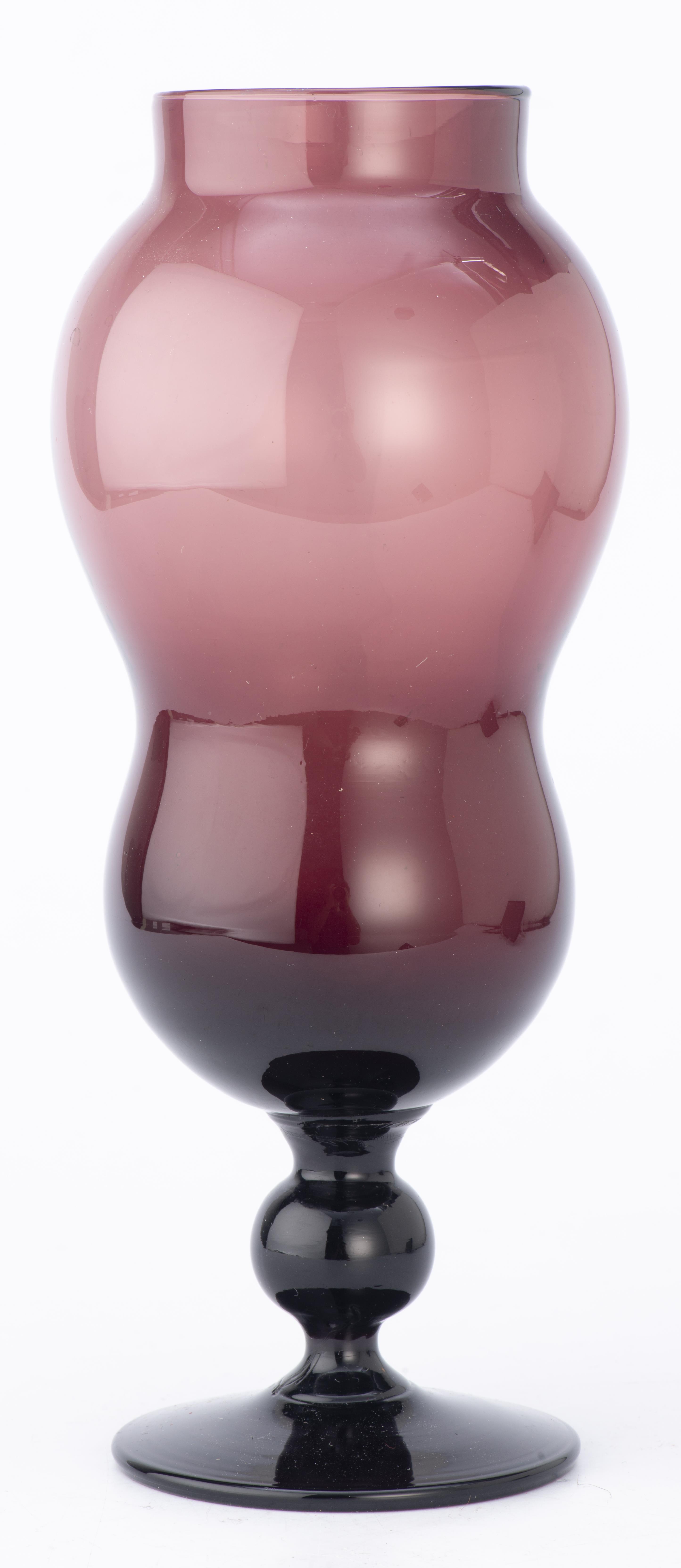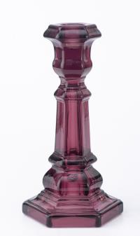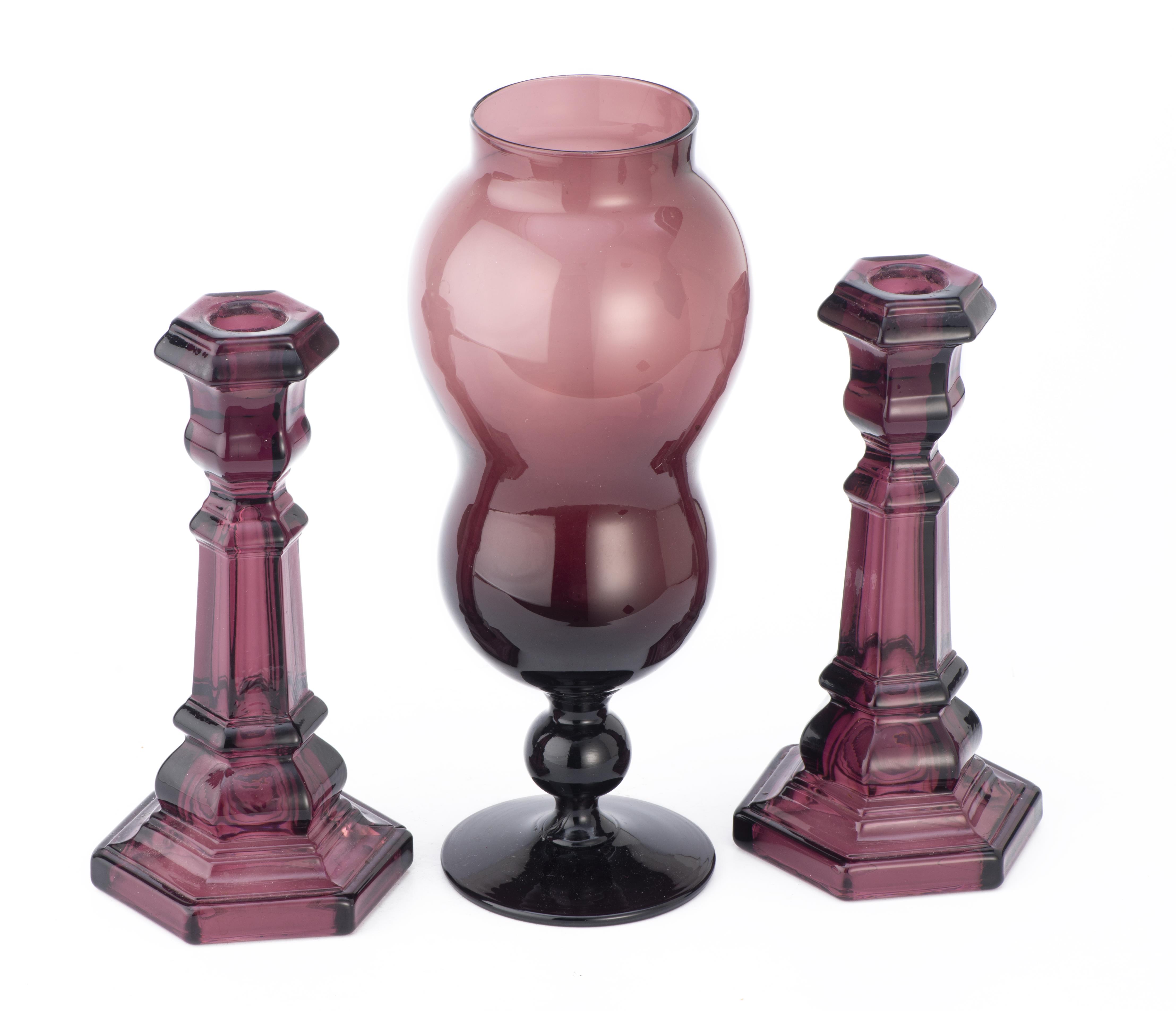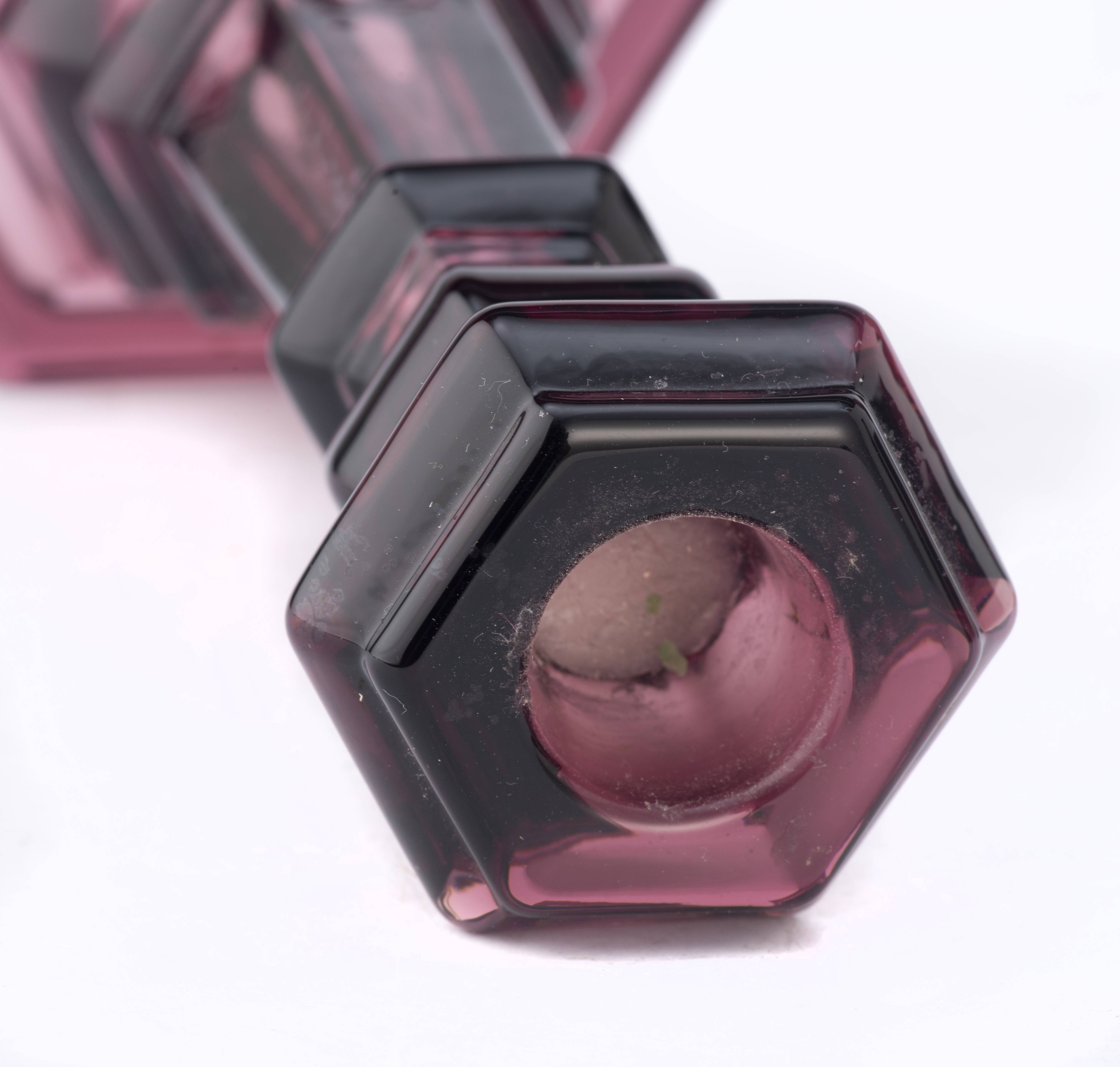 Garniture en verre violet comprenant une paire de bougeoirs en verre moulé inscrit sous la base MMA et une bonbonnière sur piédouche.