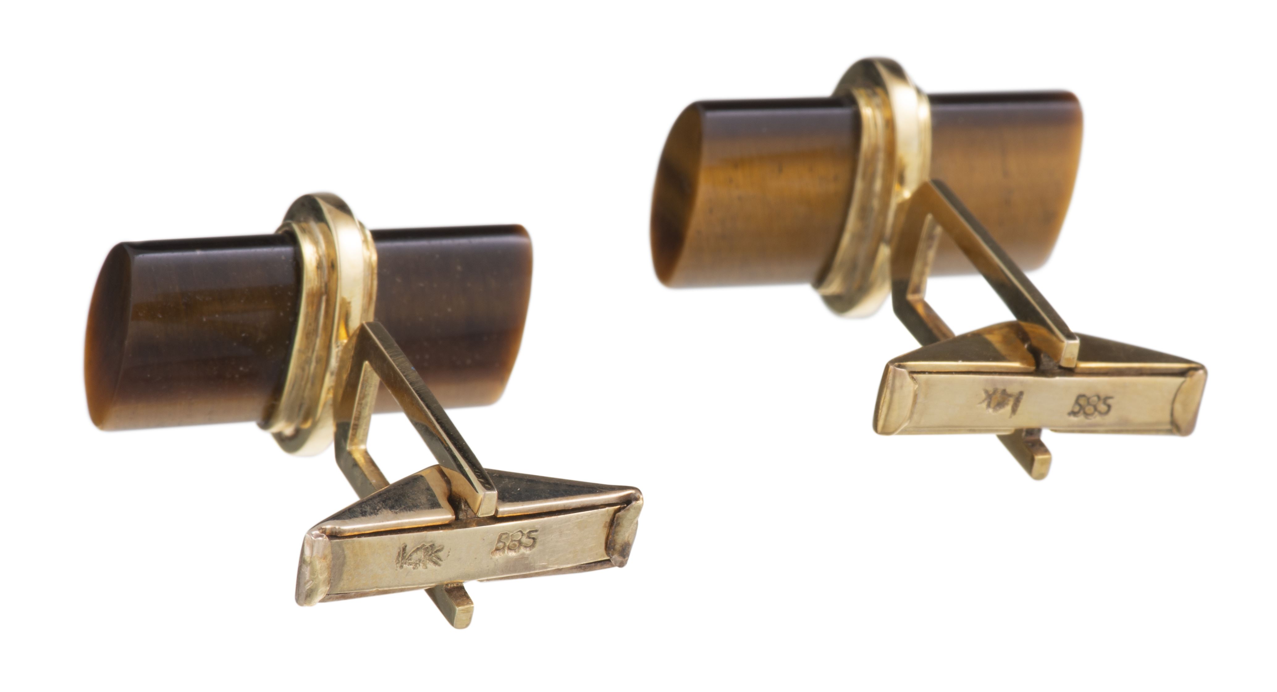Paire de boutons de manchettes en œil de tigre retenus par des liens en or jaune .585.