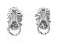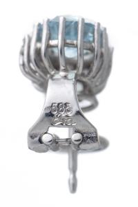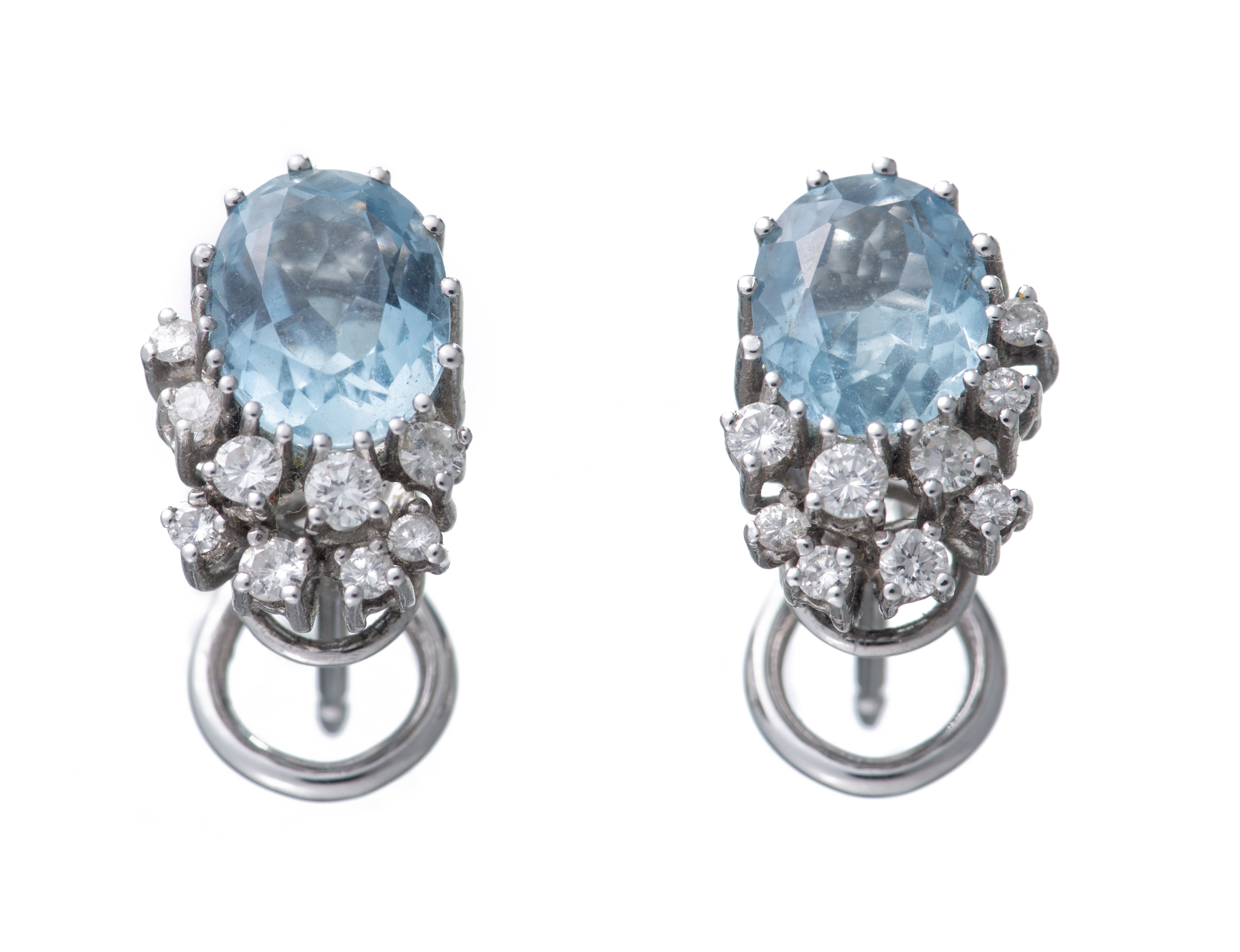 Paire de clous d'oreille en or gris .750 avec 2 aigues-marines de taille ovale de 1.5 ct pour un total de 3 cts surmontée de 9 diamants pour un total de .40 ct.
