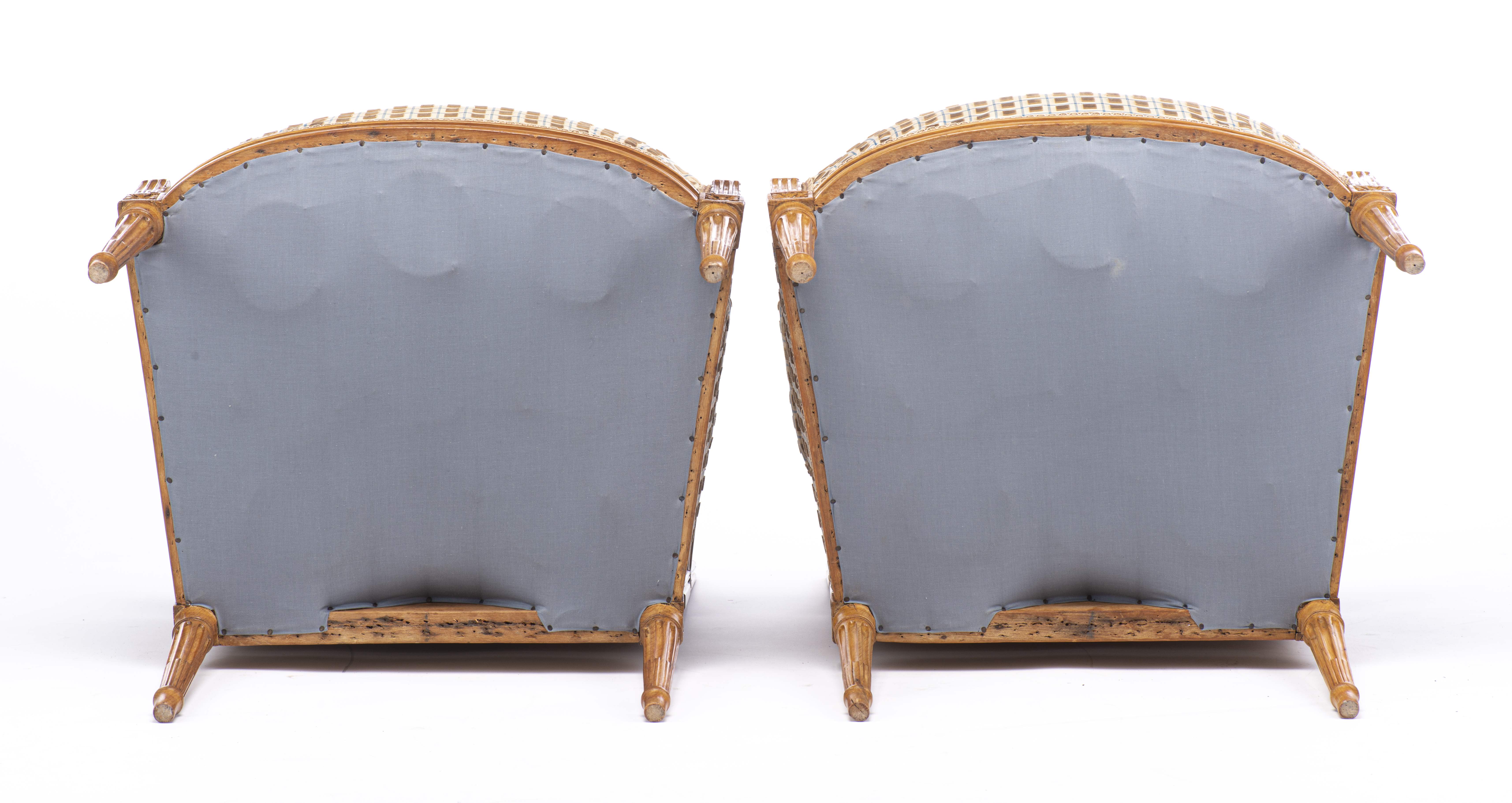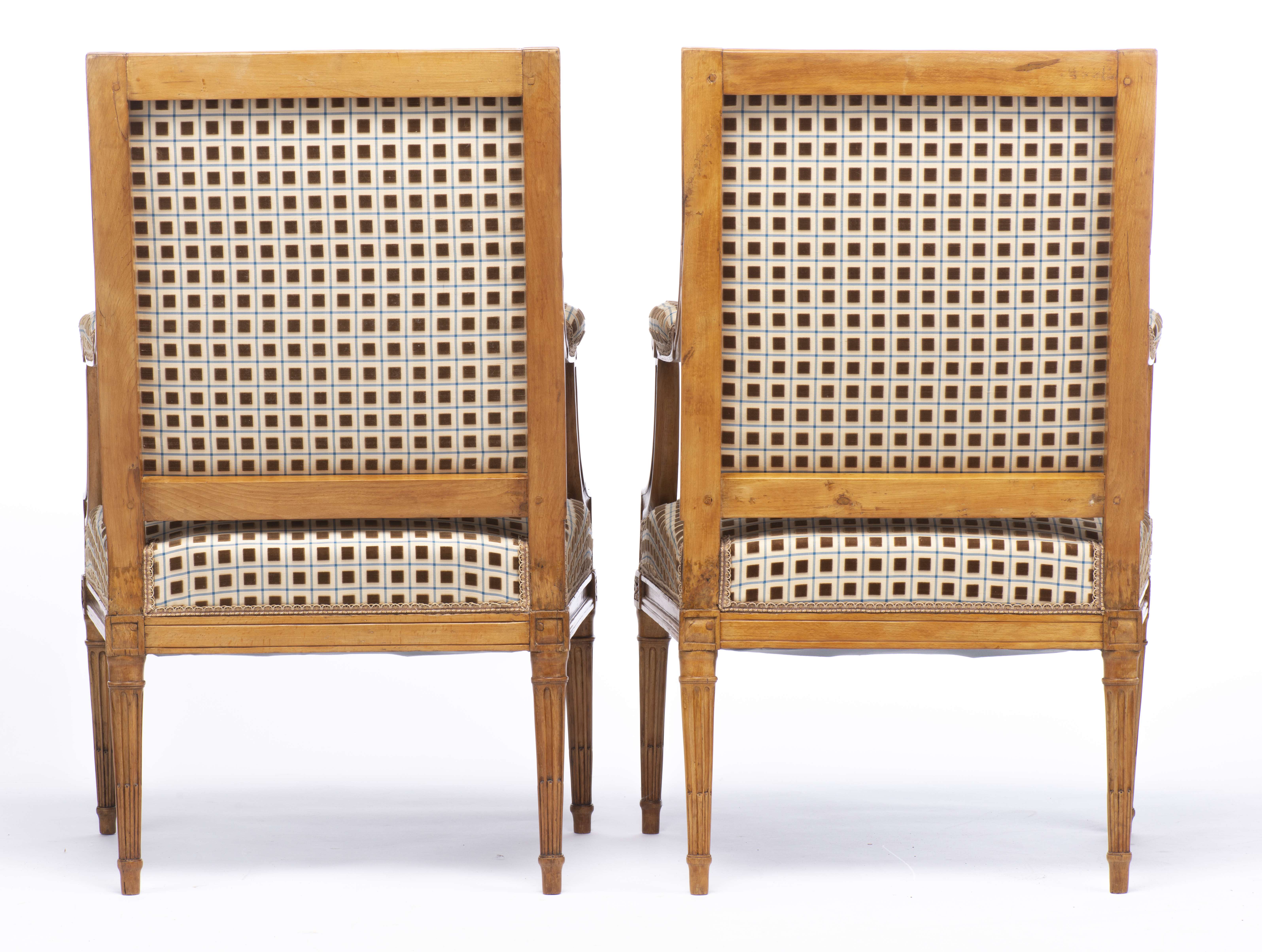 Paire de fauteuils à dossier plat Louis XVI recouverts de tissu jaune à motifs de carrés bruns en velours encadrés de d'une bande bleue. XVIIIe Paris.