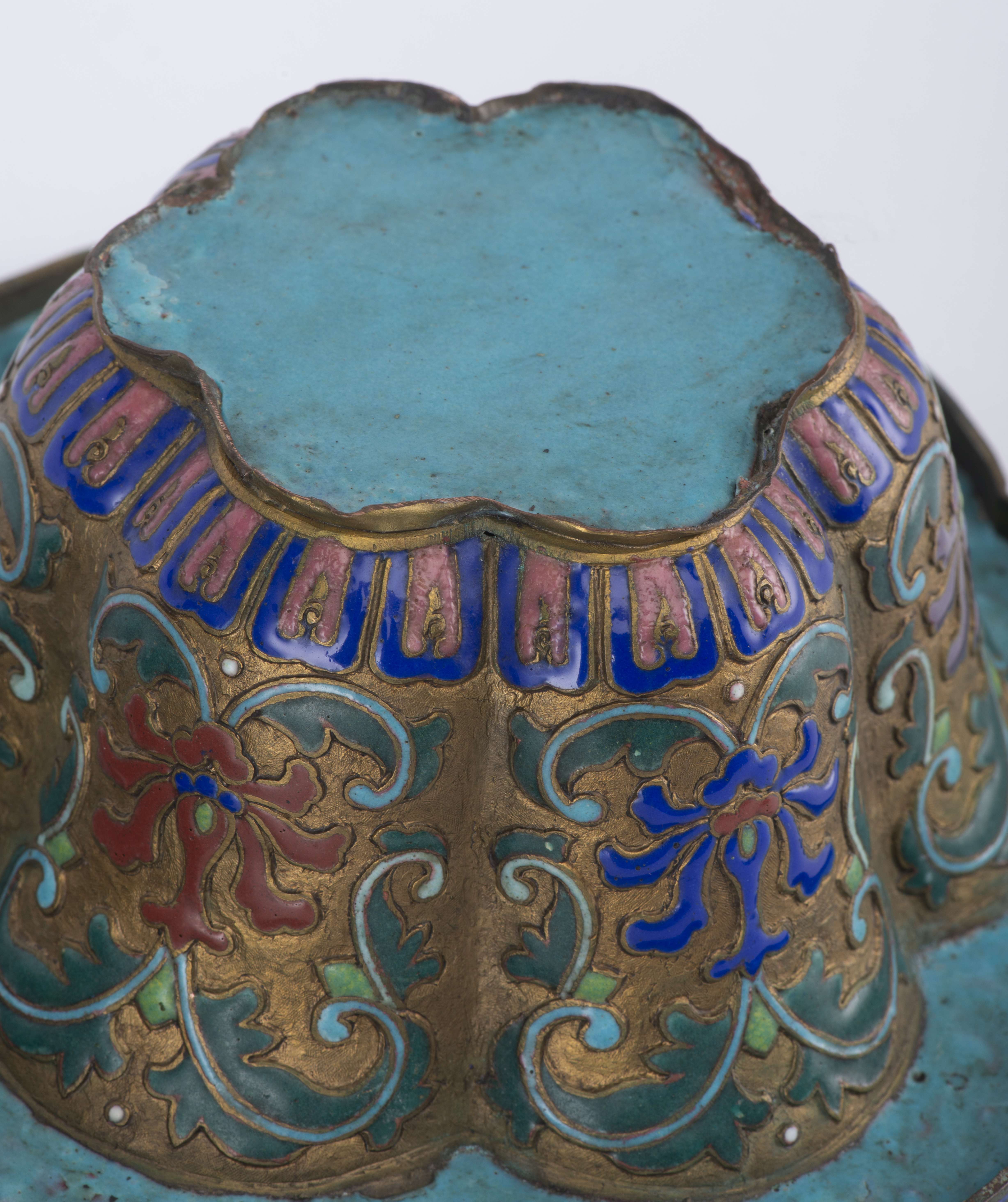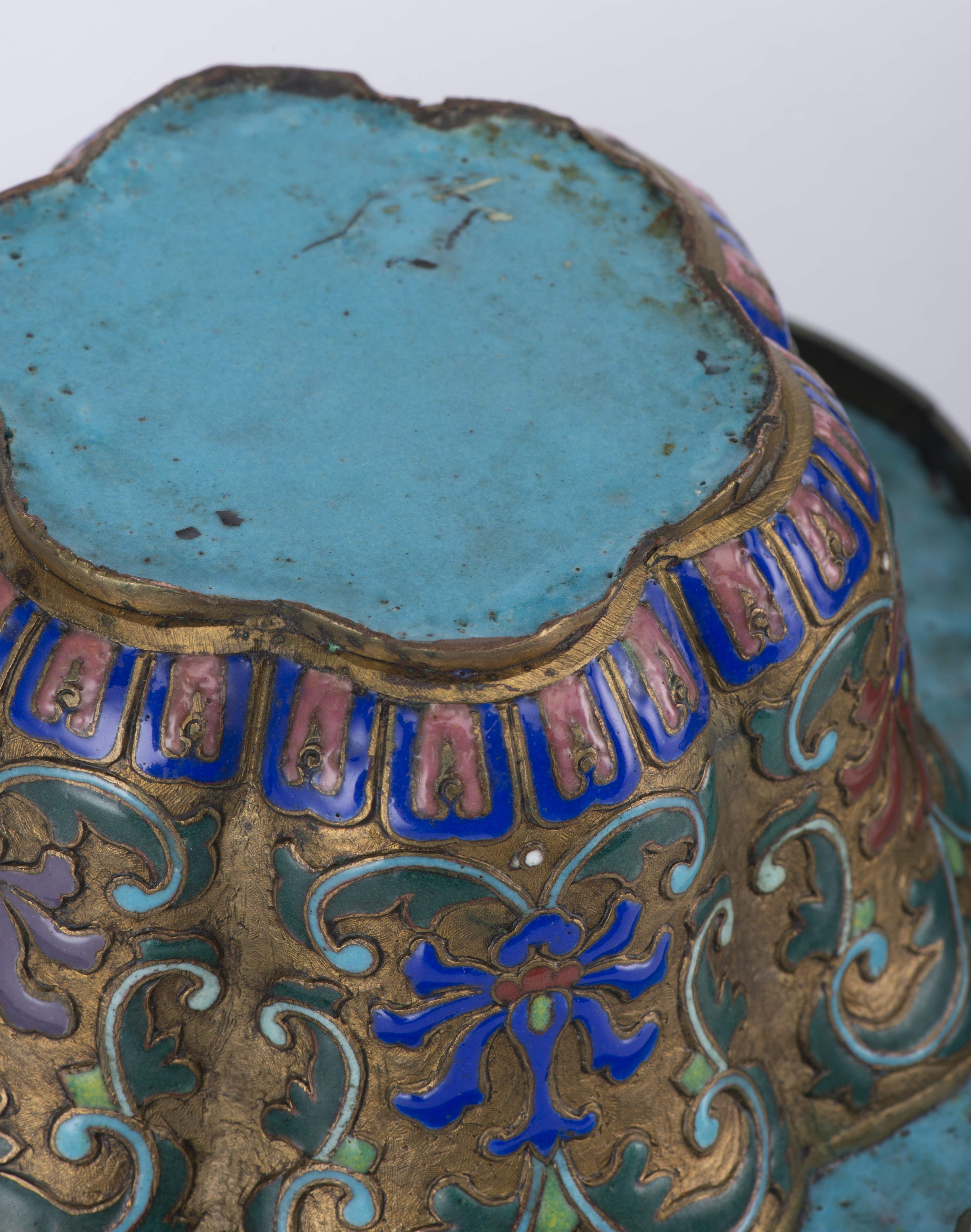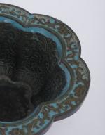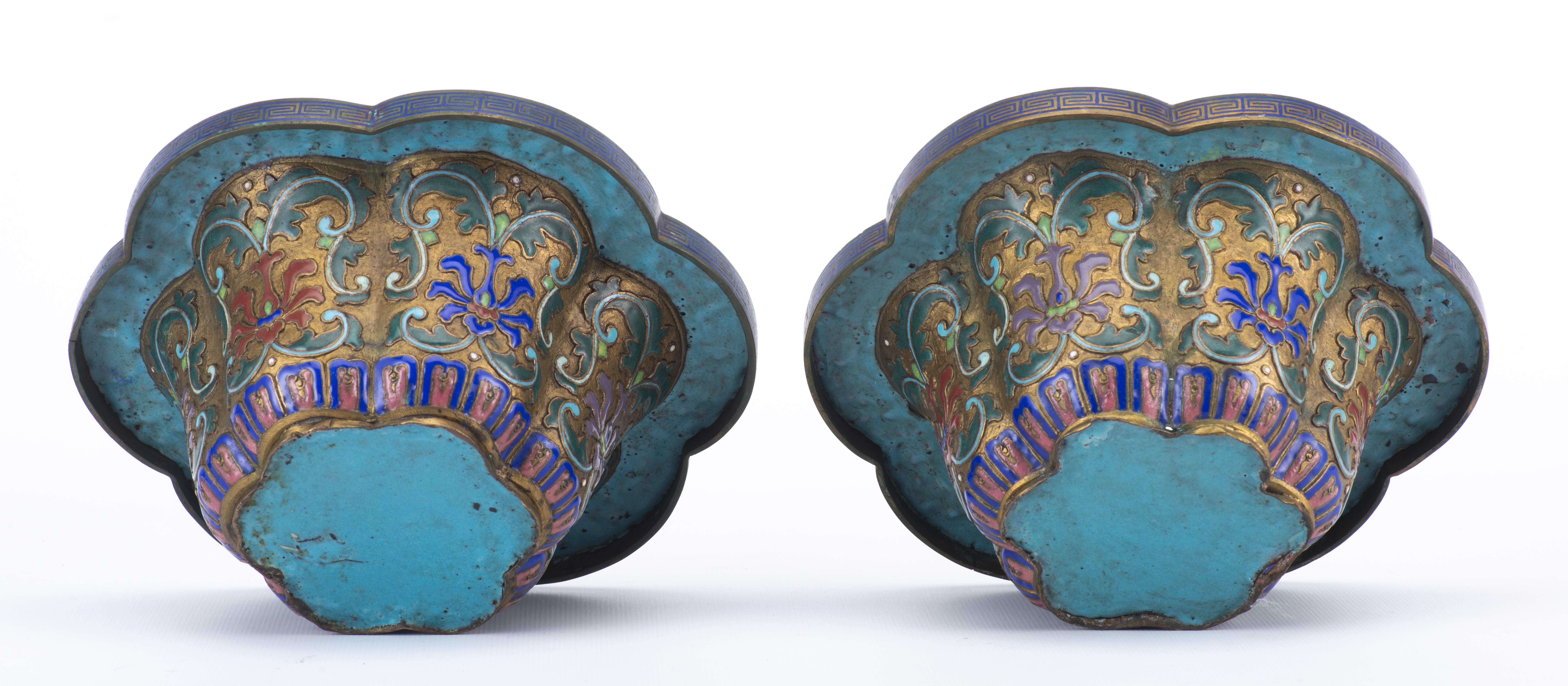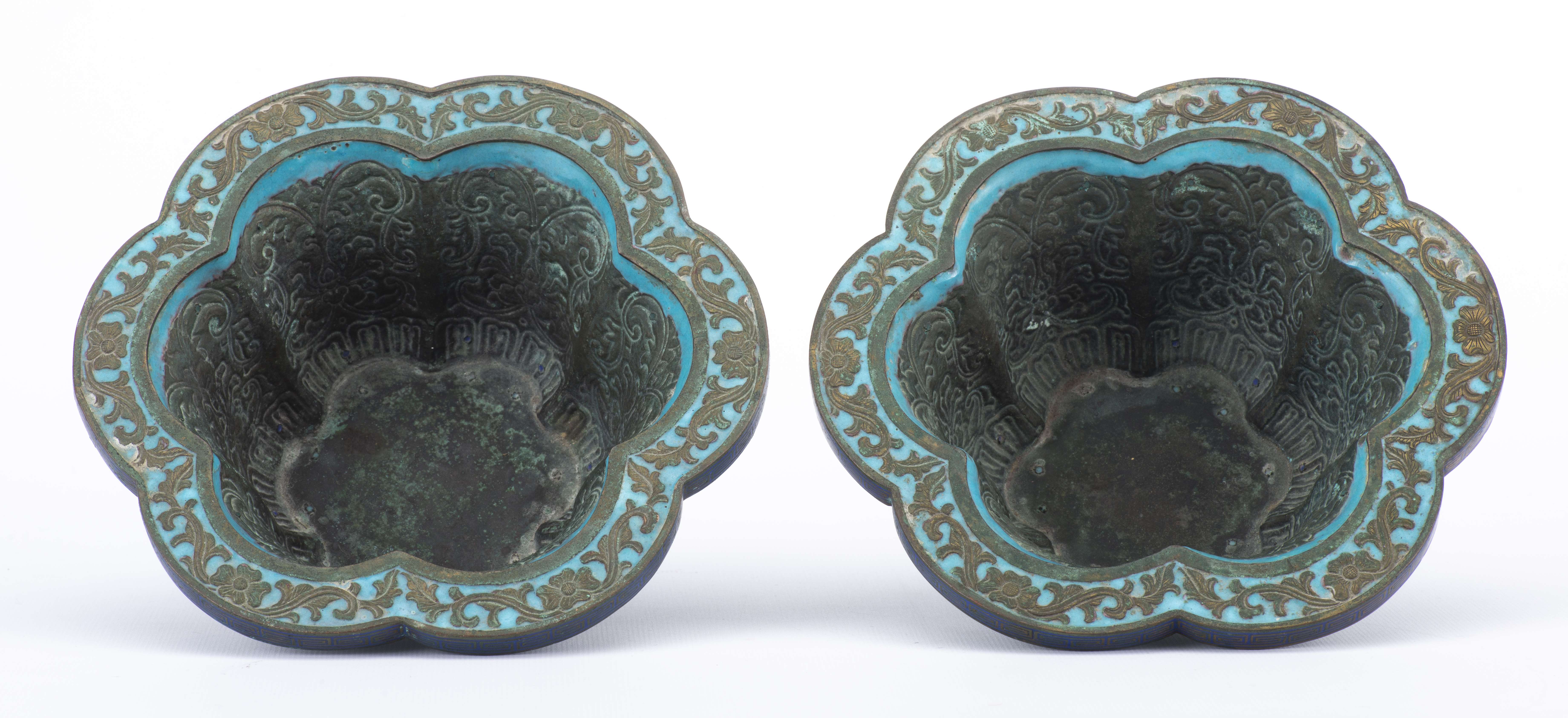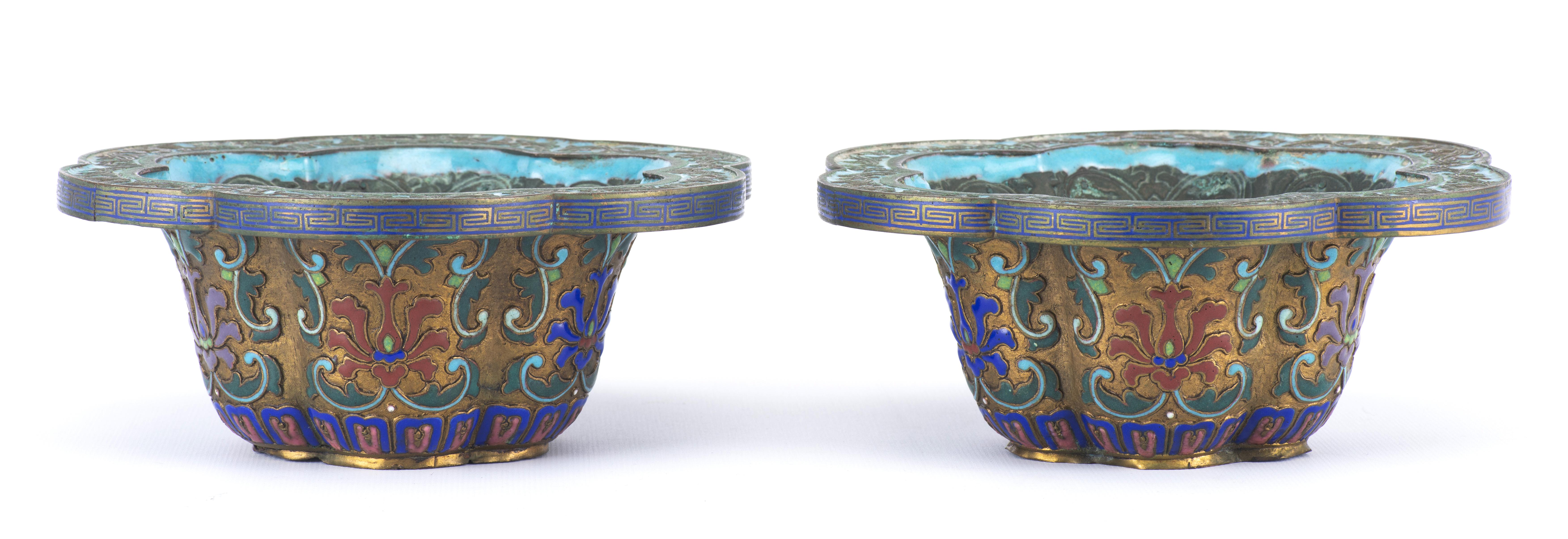 Paire de jardinières en champlevé à décor de fleurs de lotus, bordure hexalobée.