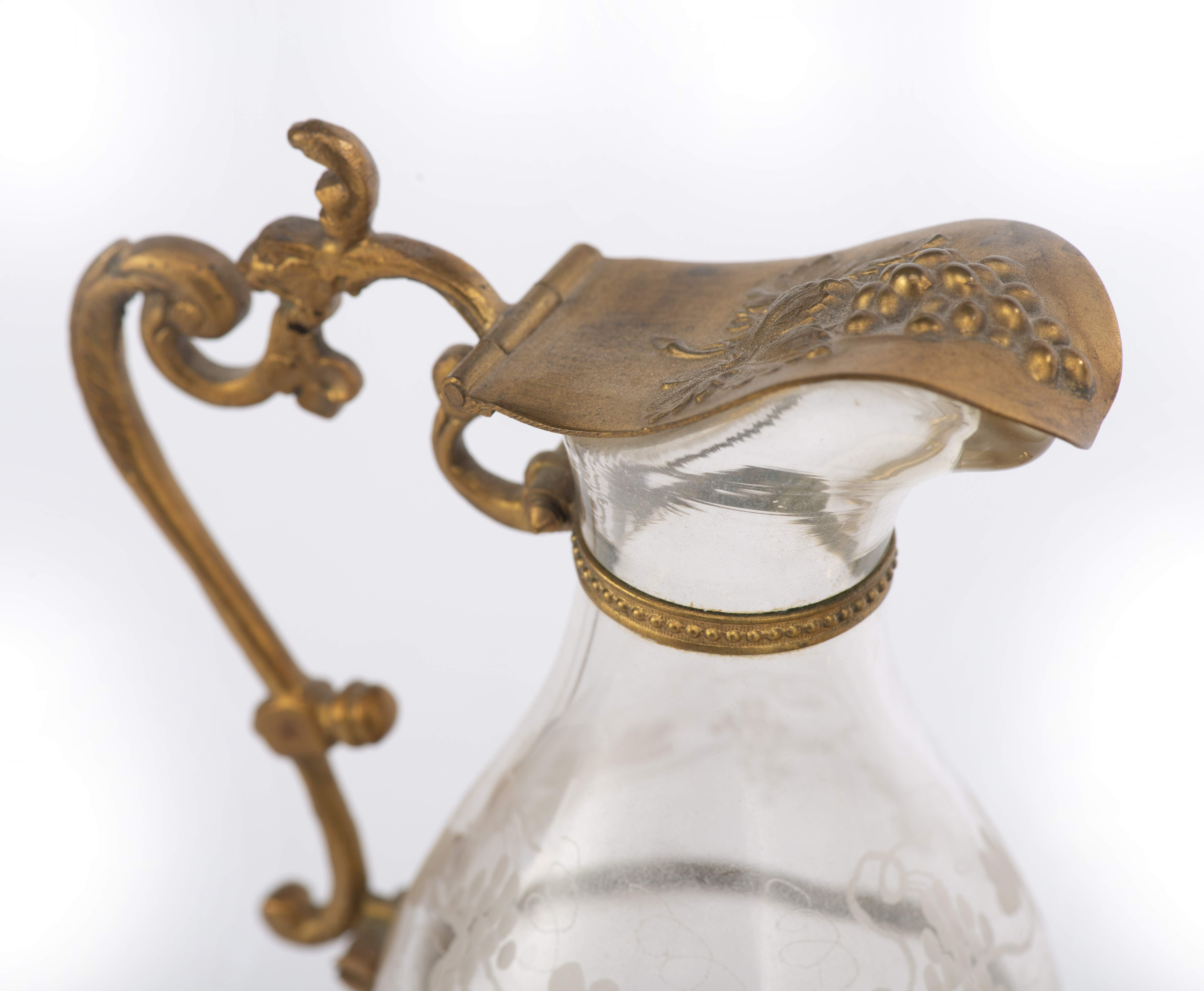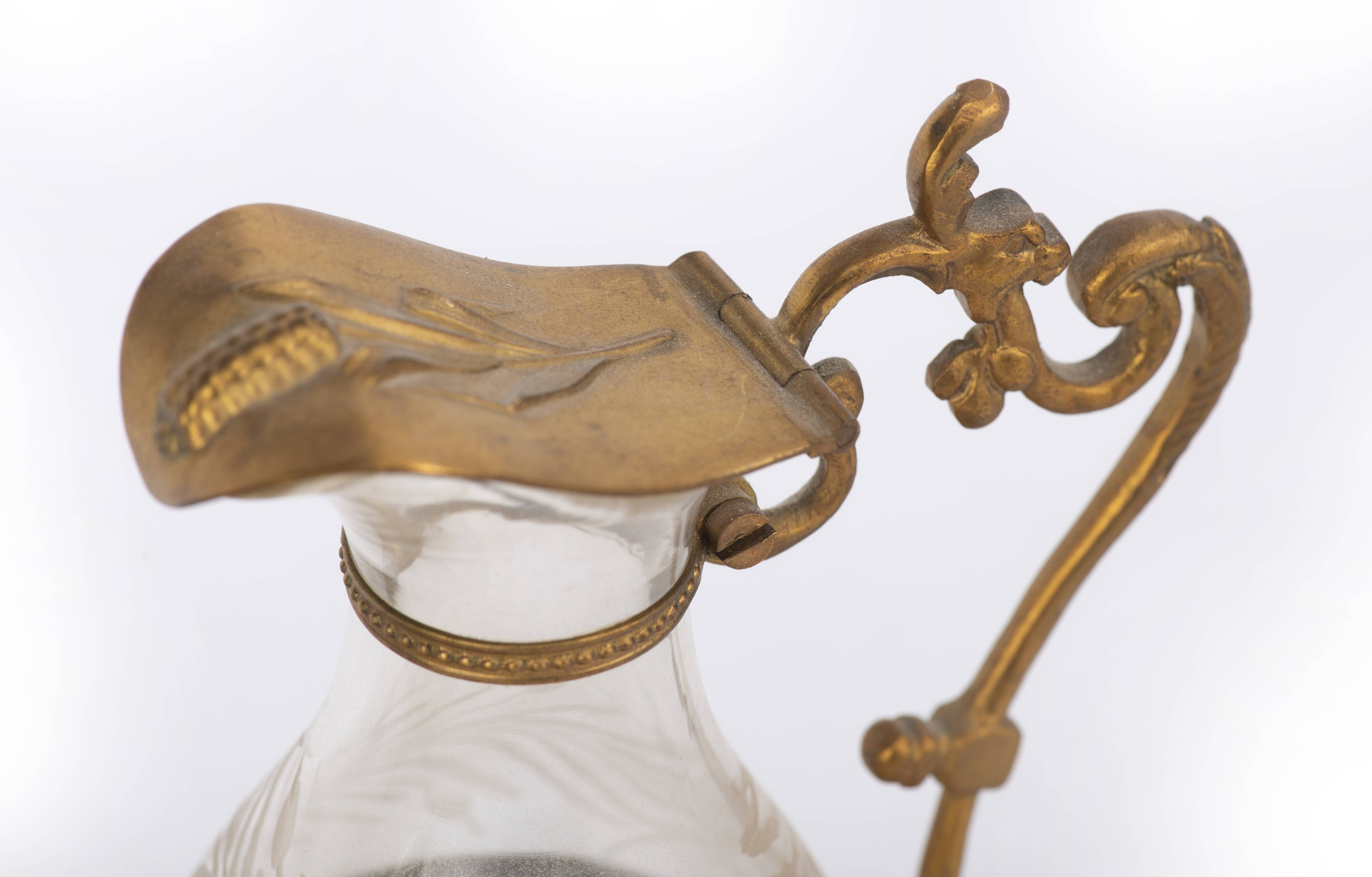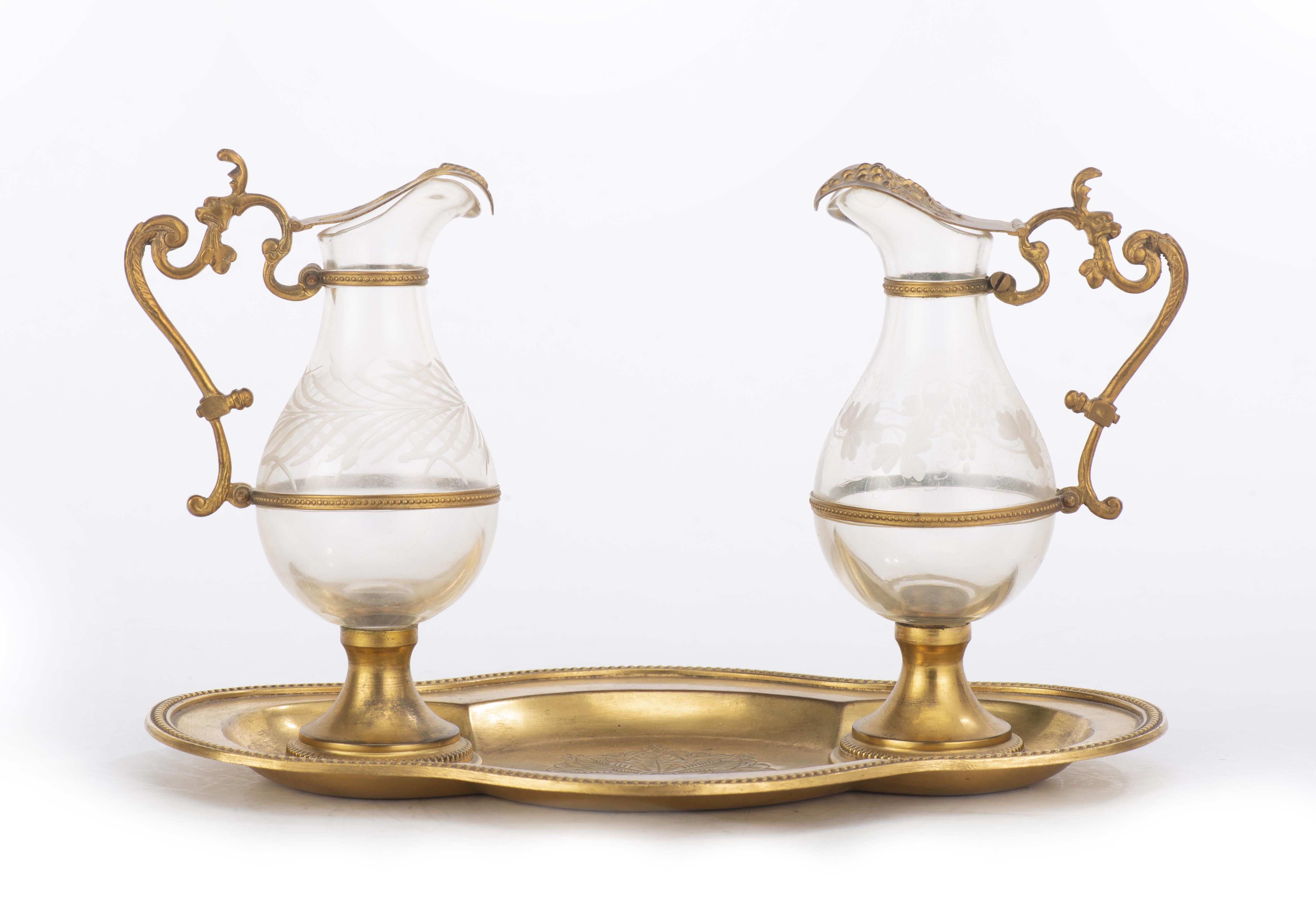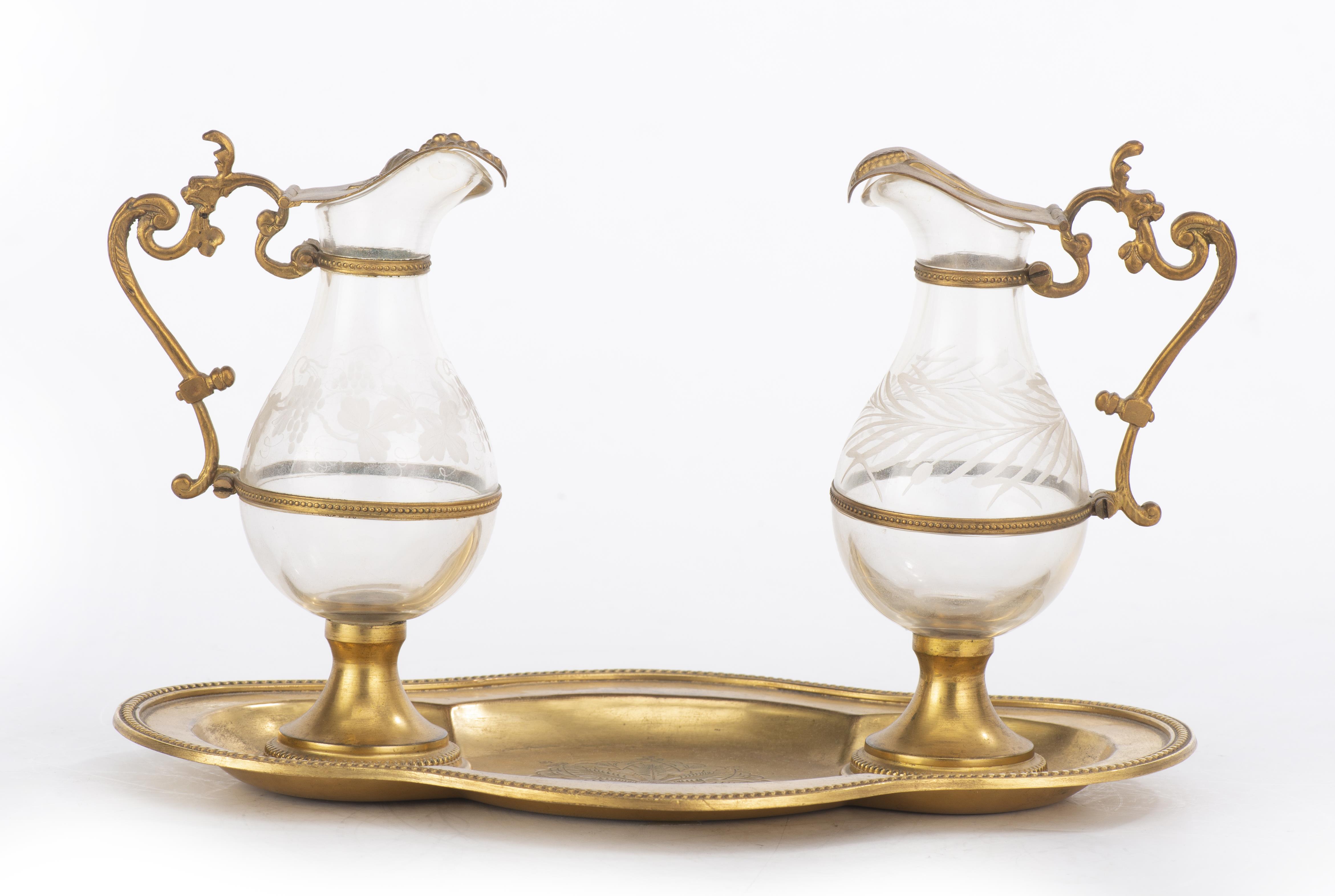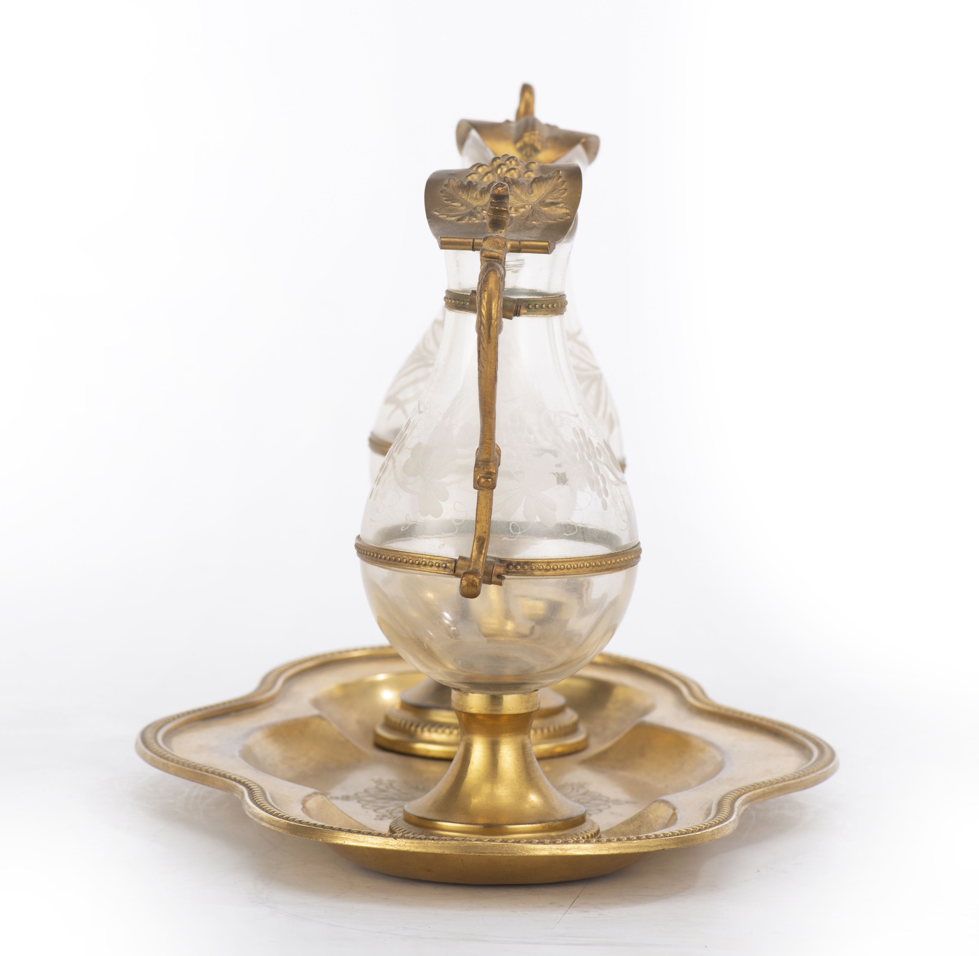 Paire de petites verseuses en verre gravé avec couvercle, anse et présentoir en tombac (cuivre doré) d'époque Nap. III.