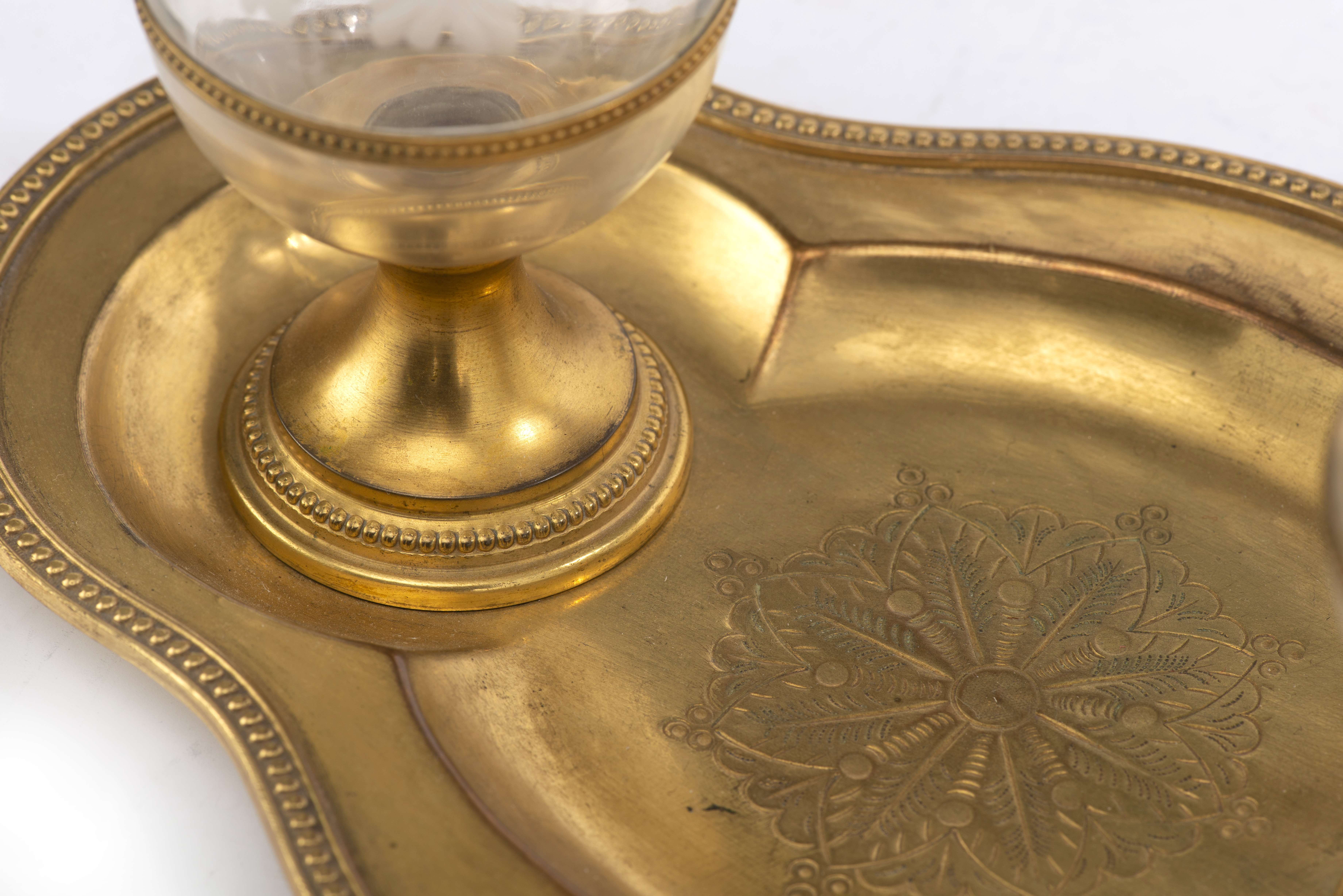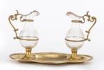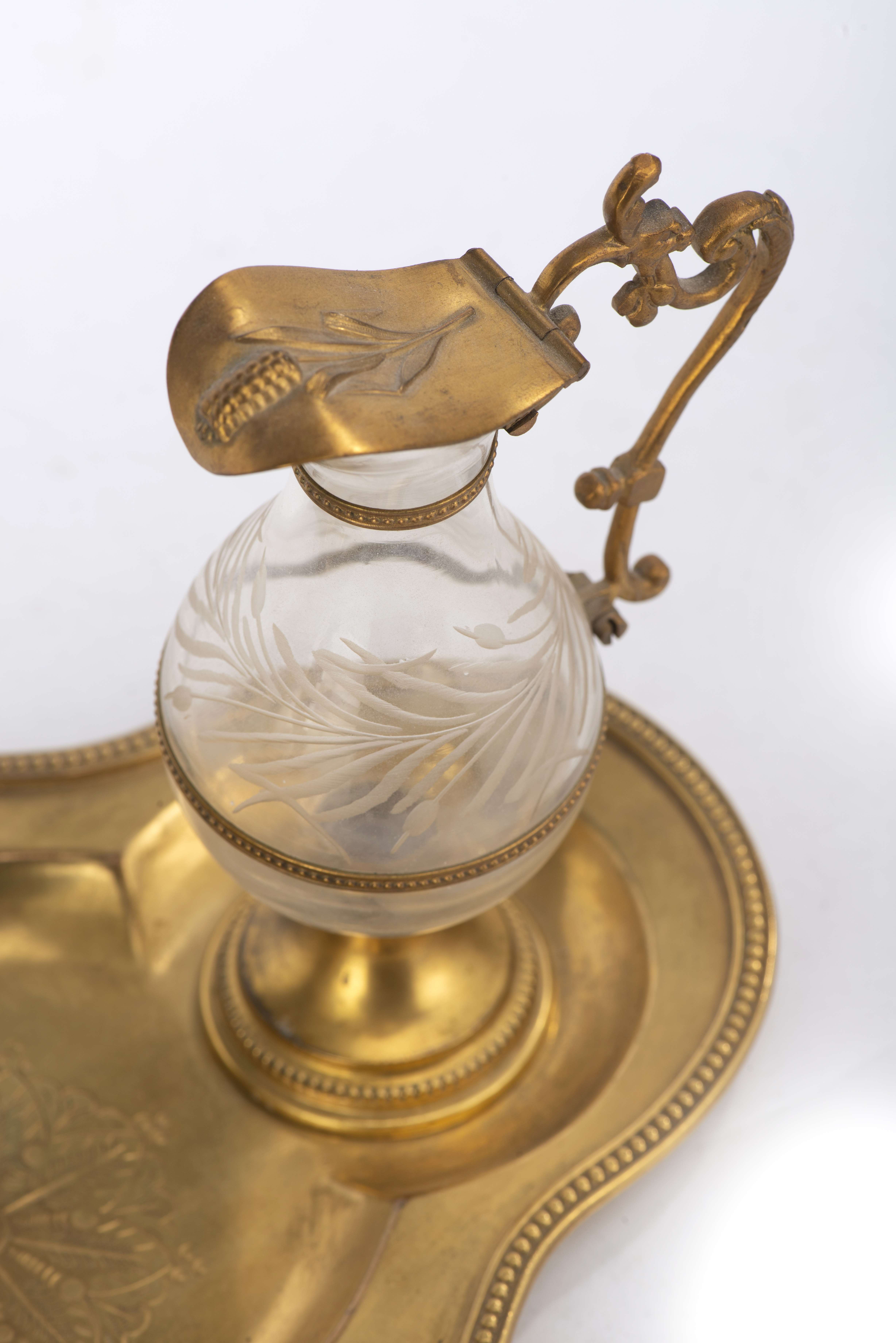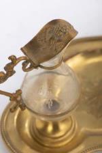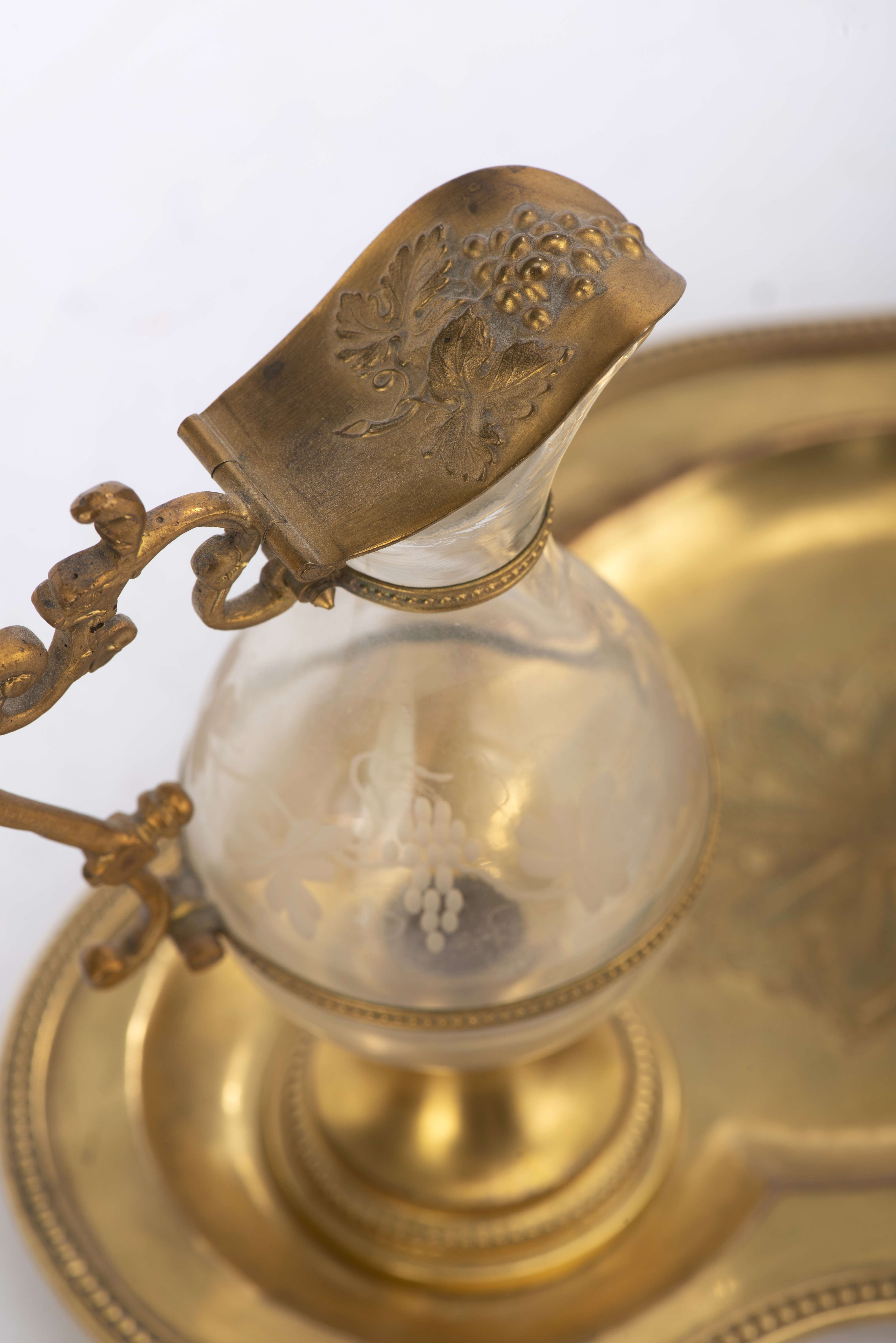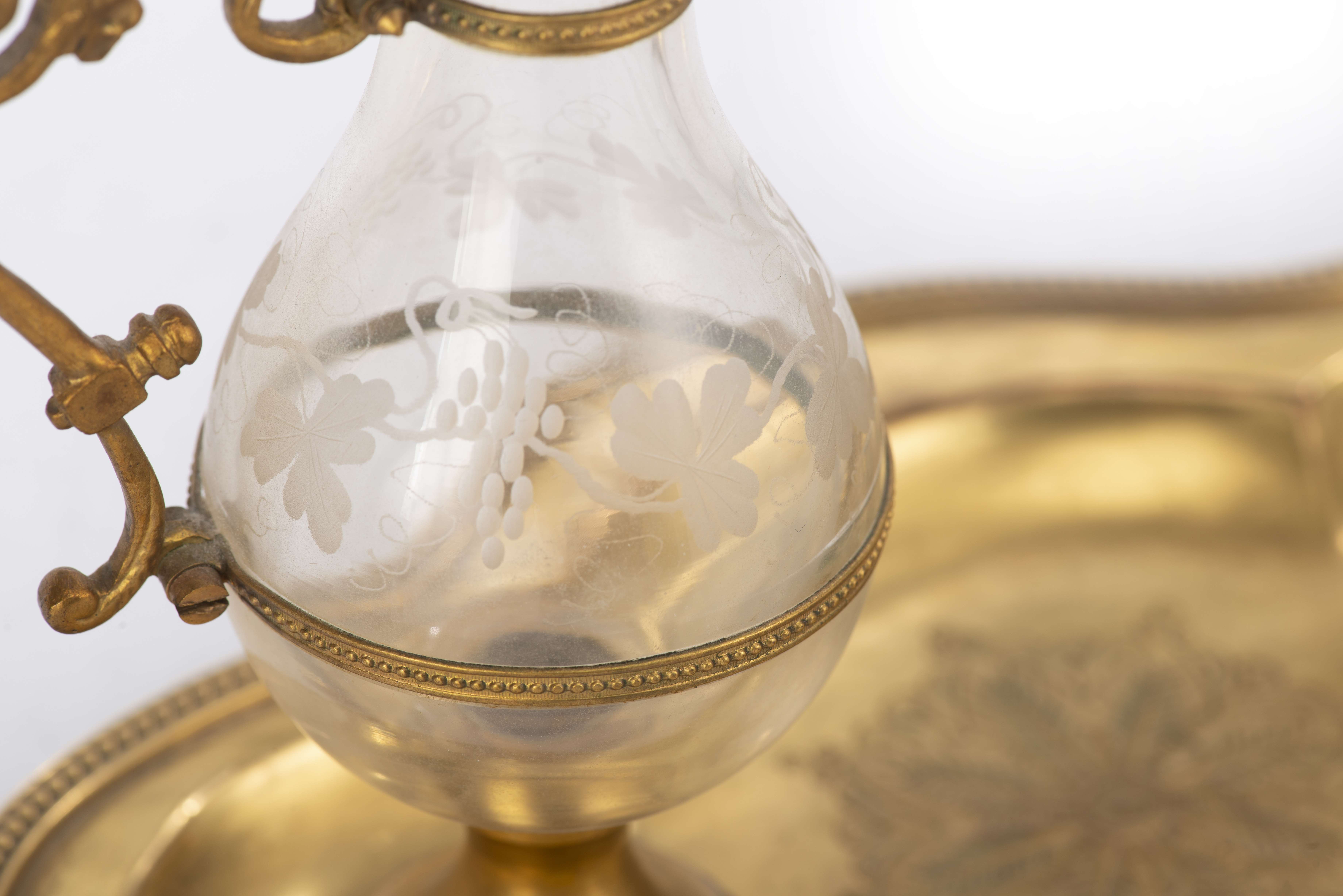 Paire de petites verseuses en verre gravé avec couvercle, anse et présentoir en tombac (cuivre doré) d'époque Nap. III.