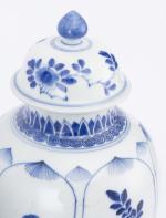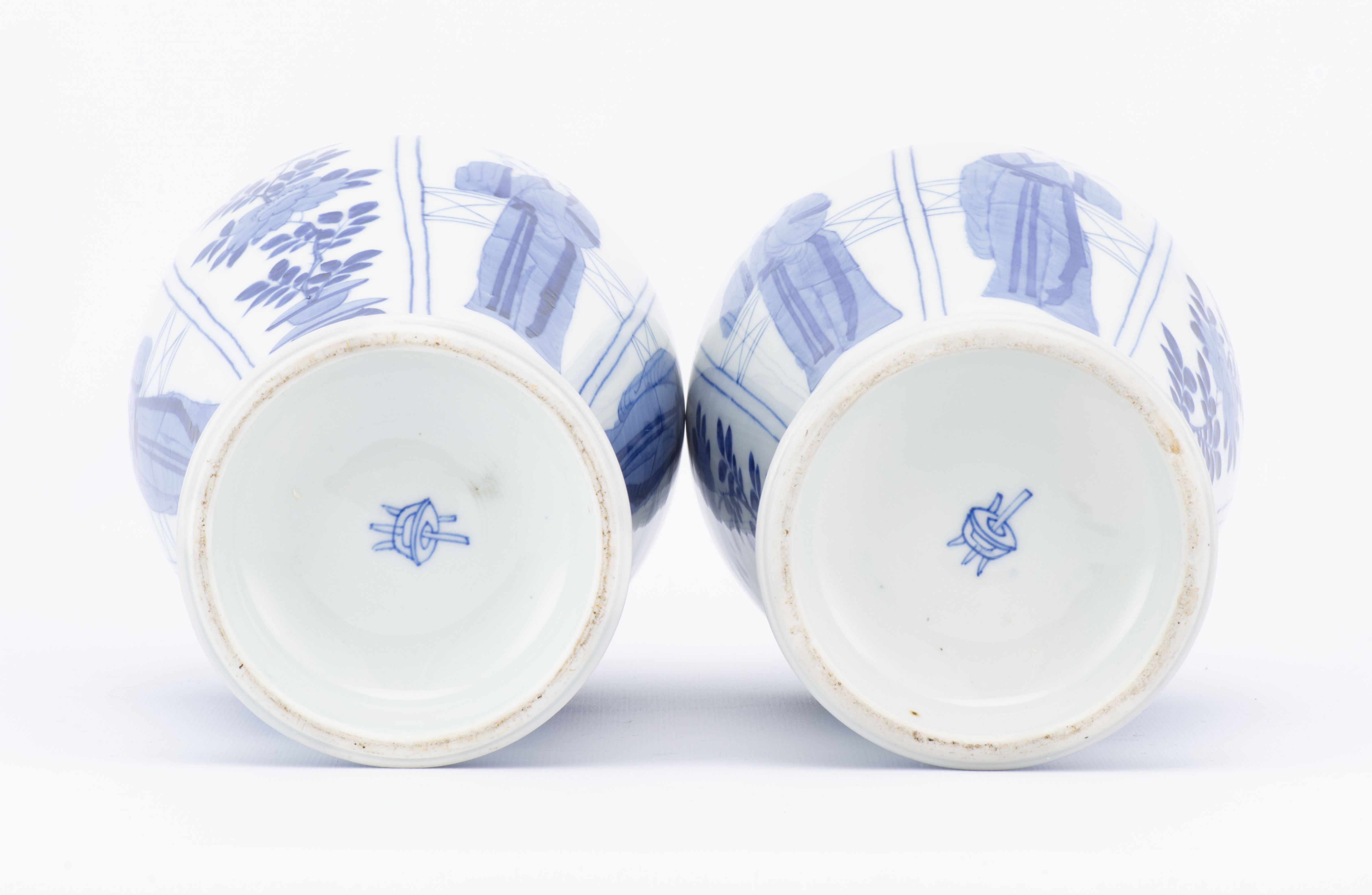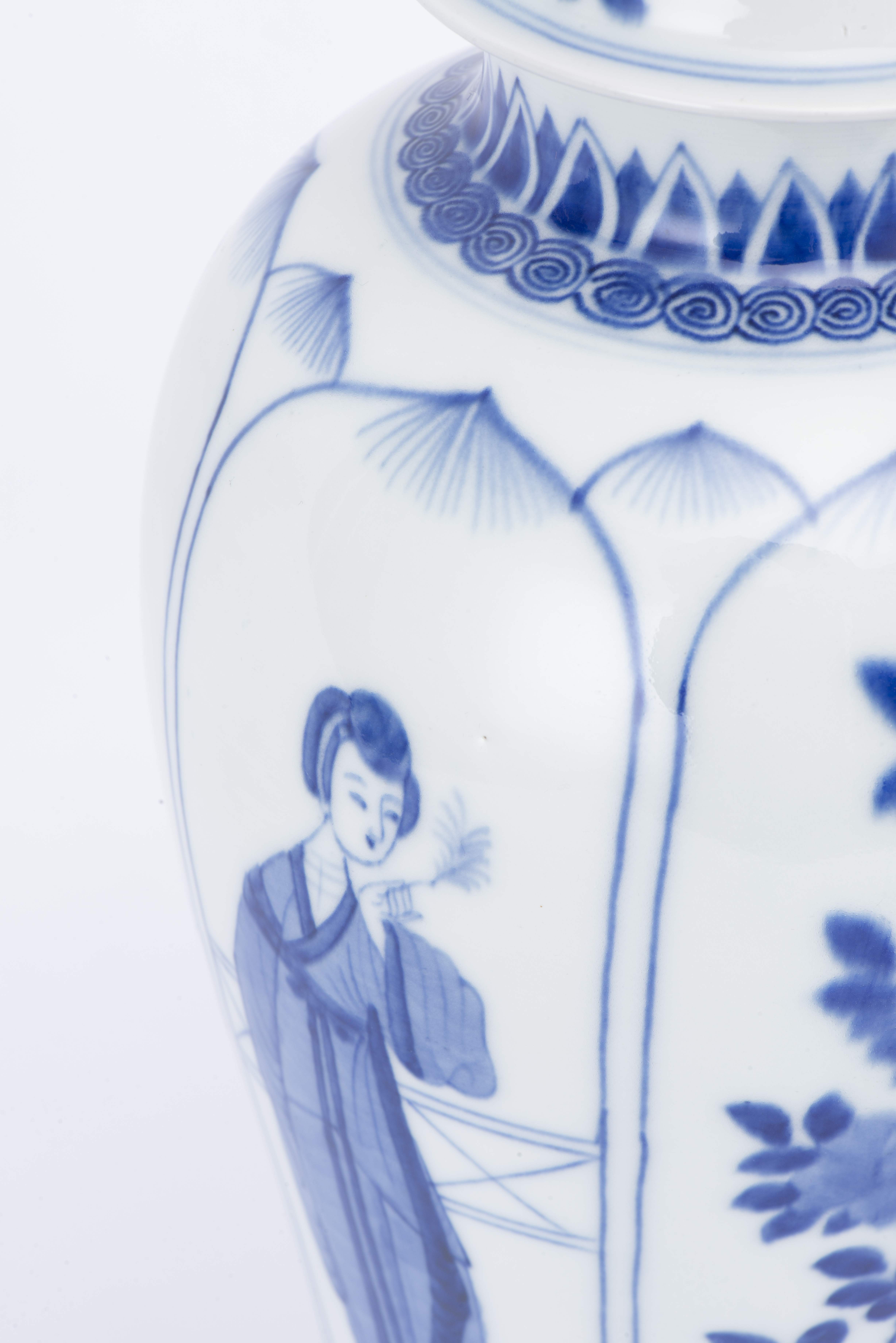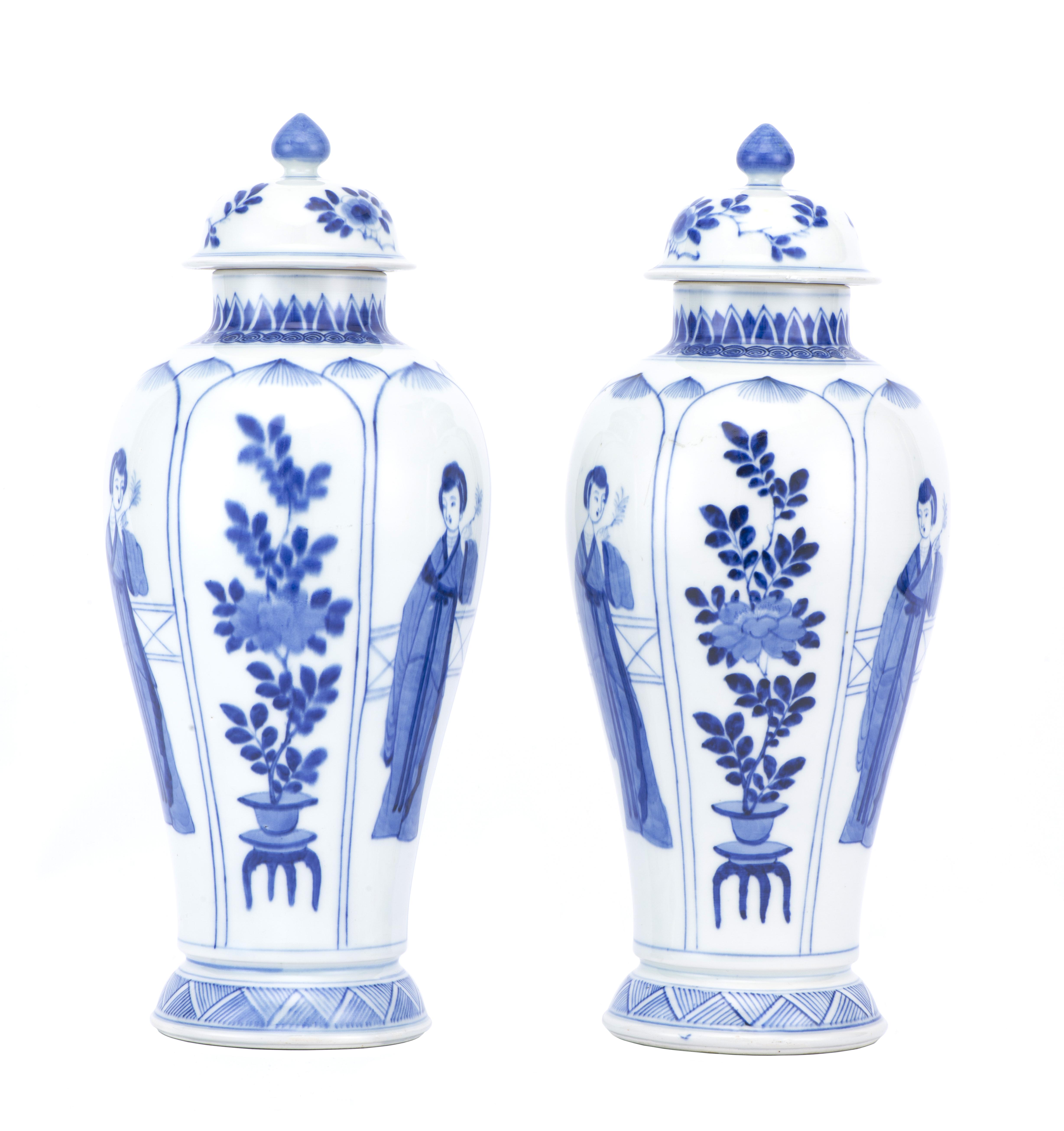 Paire de potiches en porcelaine de Chine à décor central sur la panse en bleu & blanc de jeunes femmes dans des médaillons en forme de pétales, alternés par des plantes en pot. Marque au chaudron sous la base.