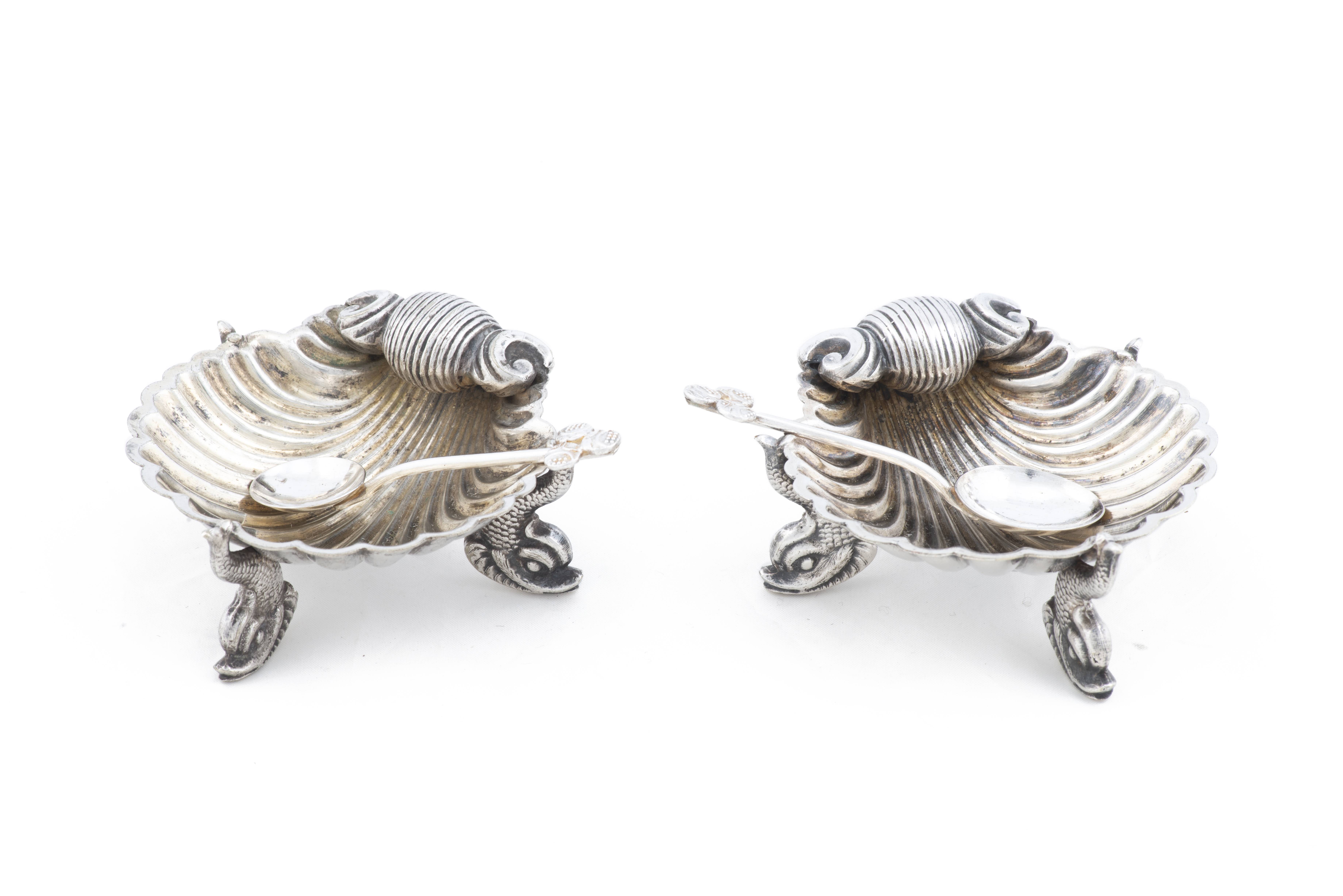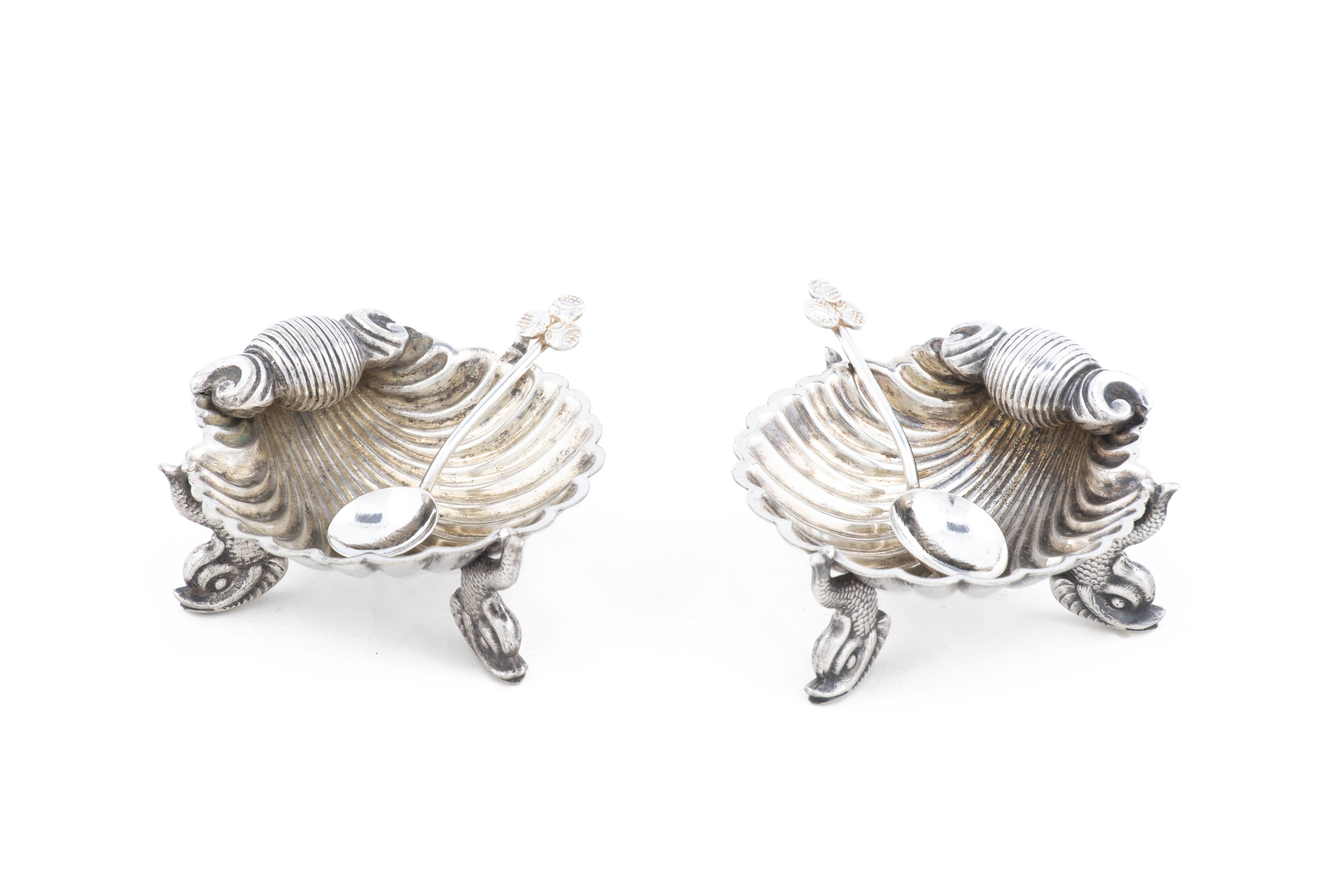 Deux salières en métal argenté en forme de coquille supportées par 3 pieds en forme de carpes ou dauphins.