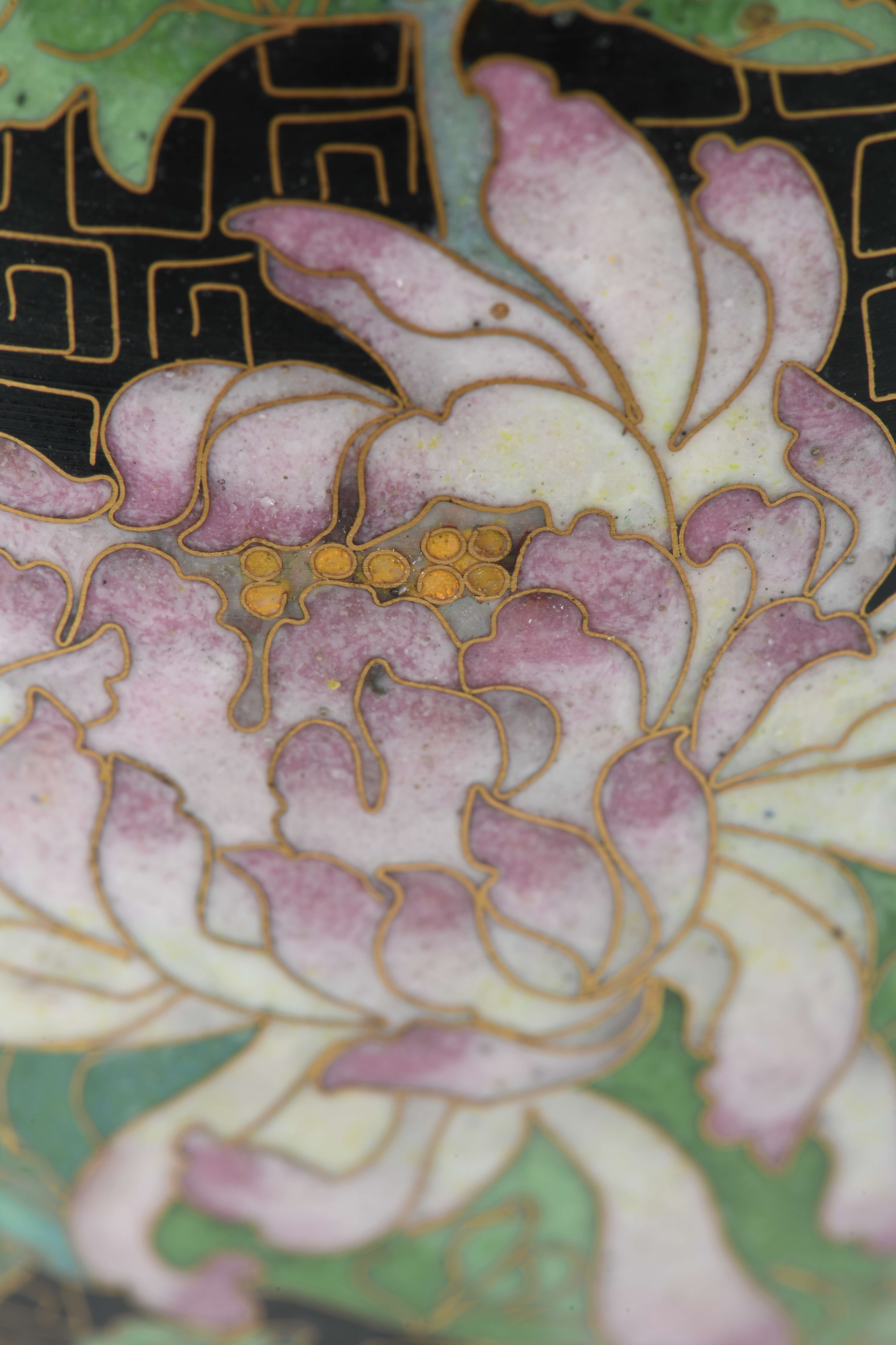 Paire de vases balustres en cloisonné de Chine à décor de chrysanthèmes sur champ noir.