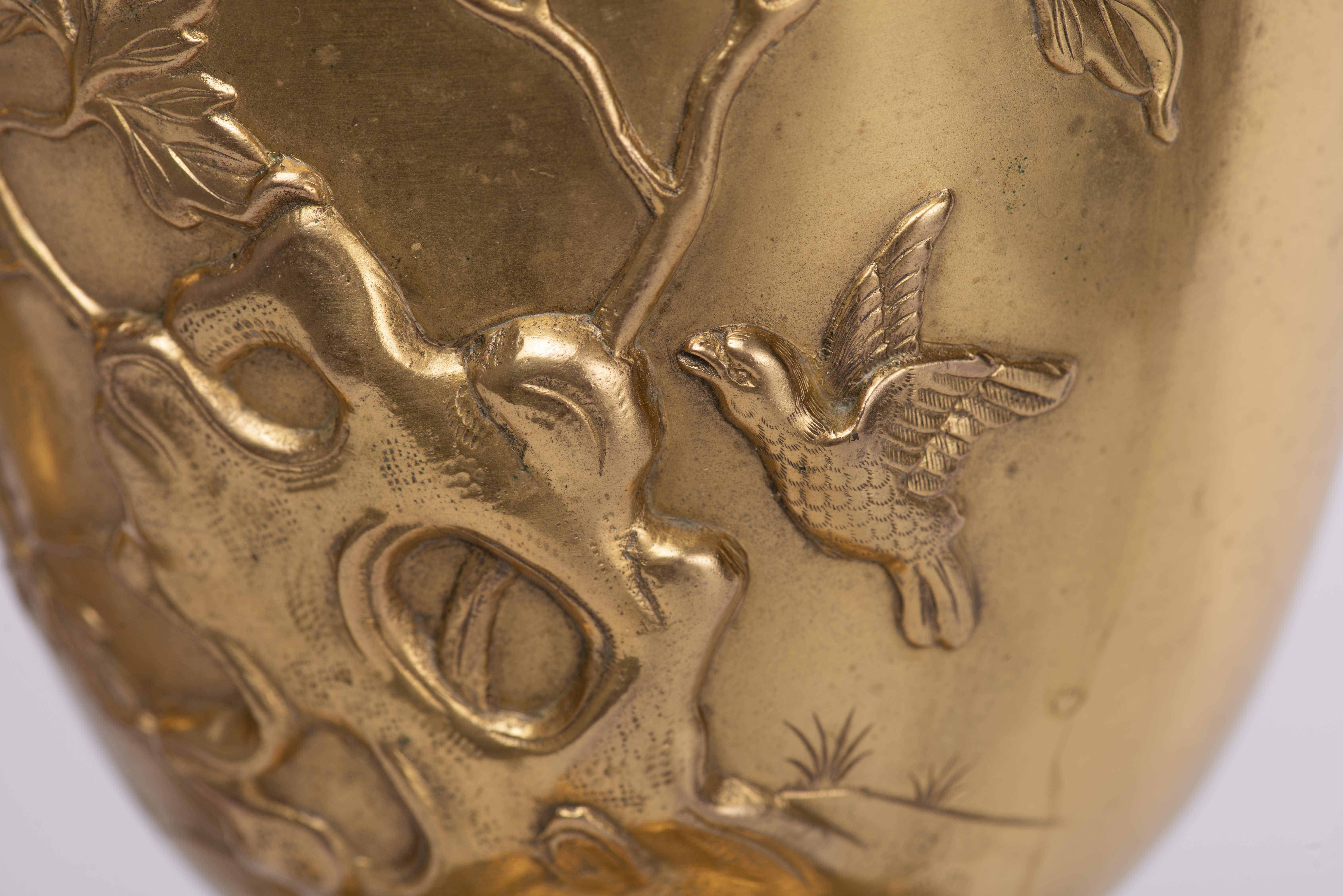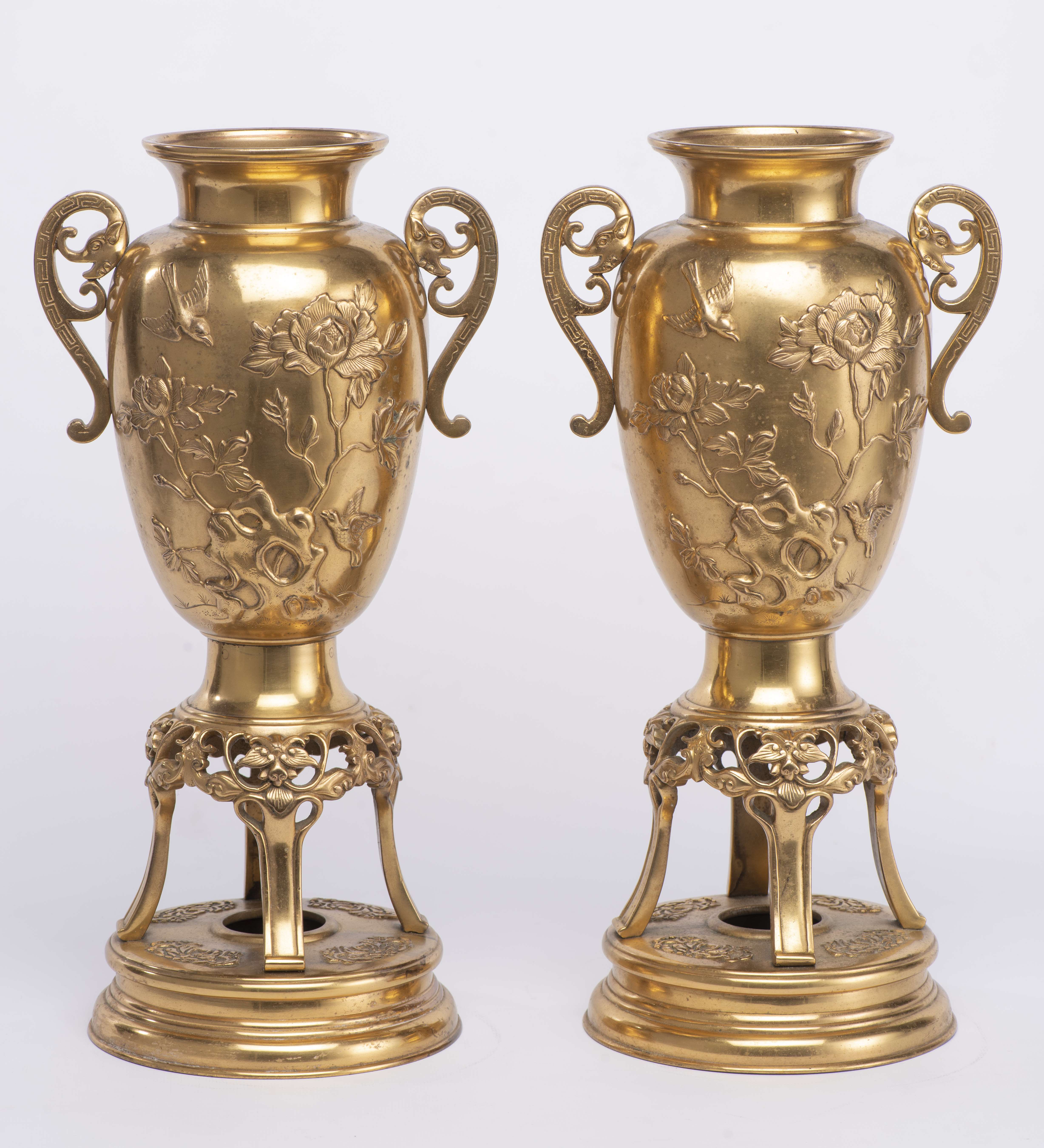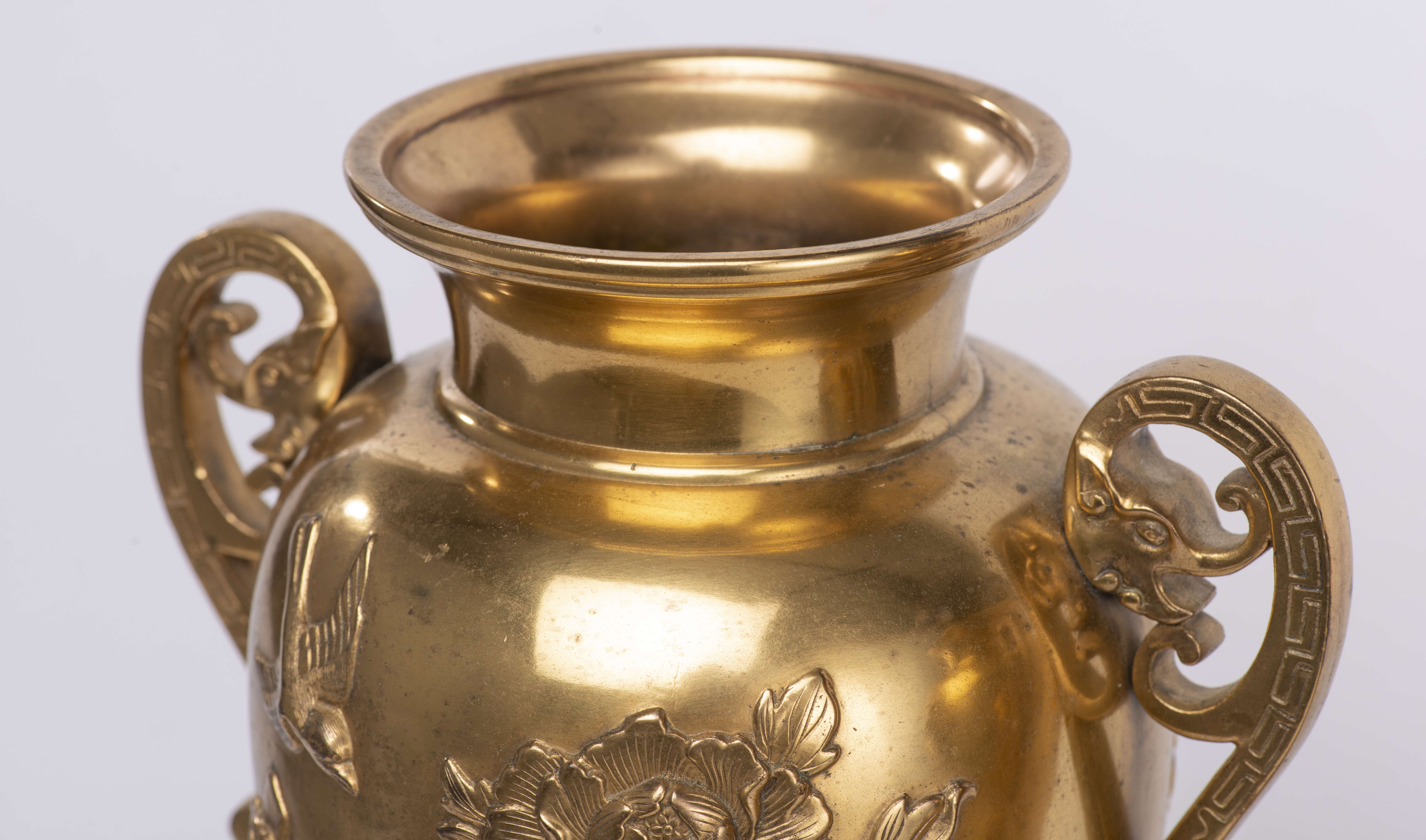 Paire de vases en bronze de Chine à patine dorée et décor en léger relief d'oiseaux et chrysanthèmes et rochers du Taihu. Deux anses en forme de Chilong.