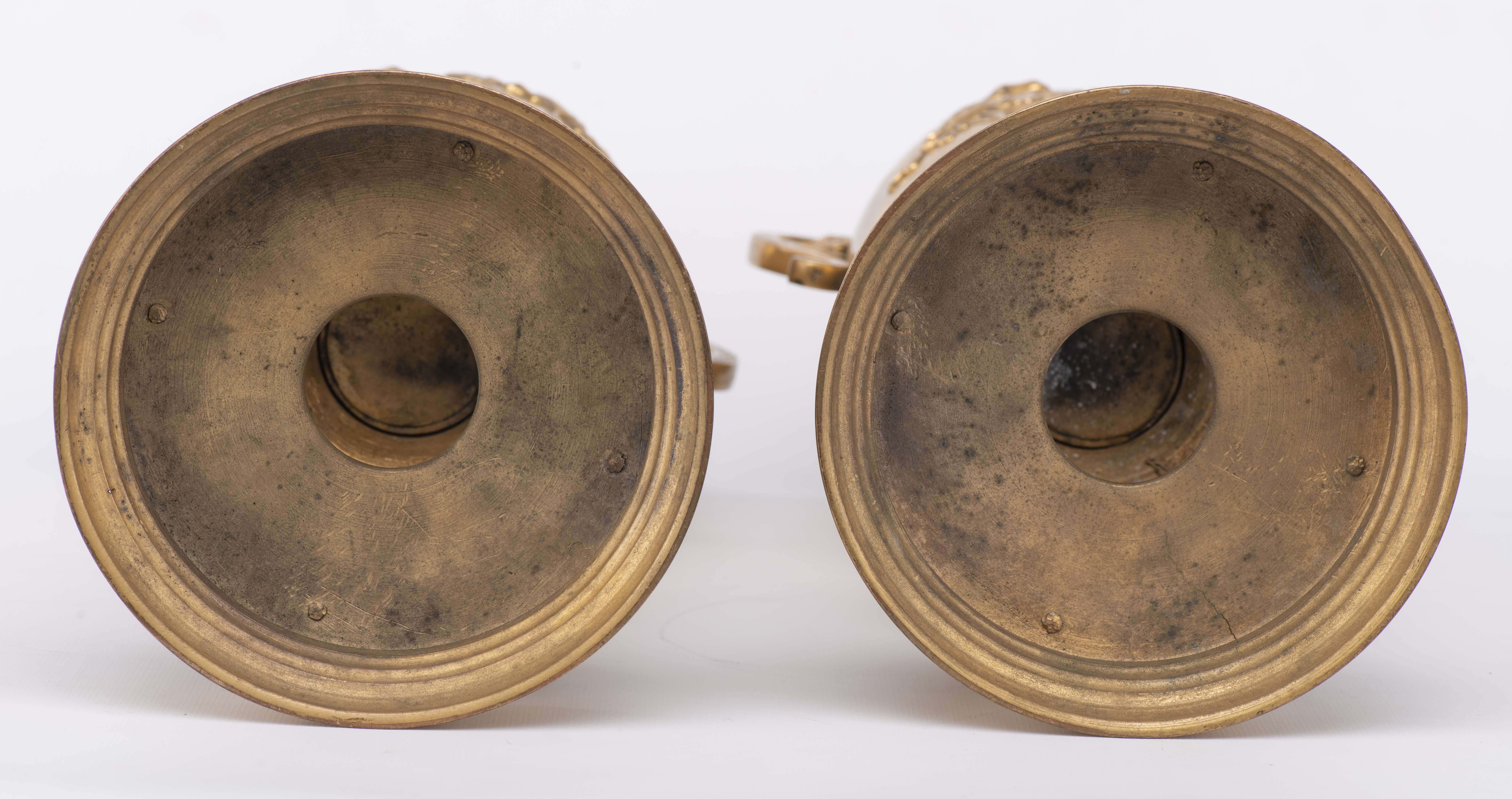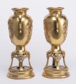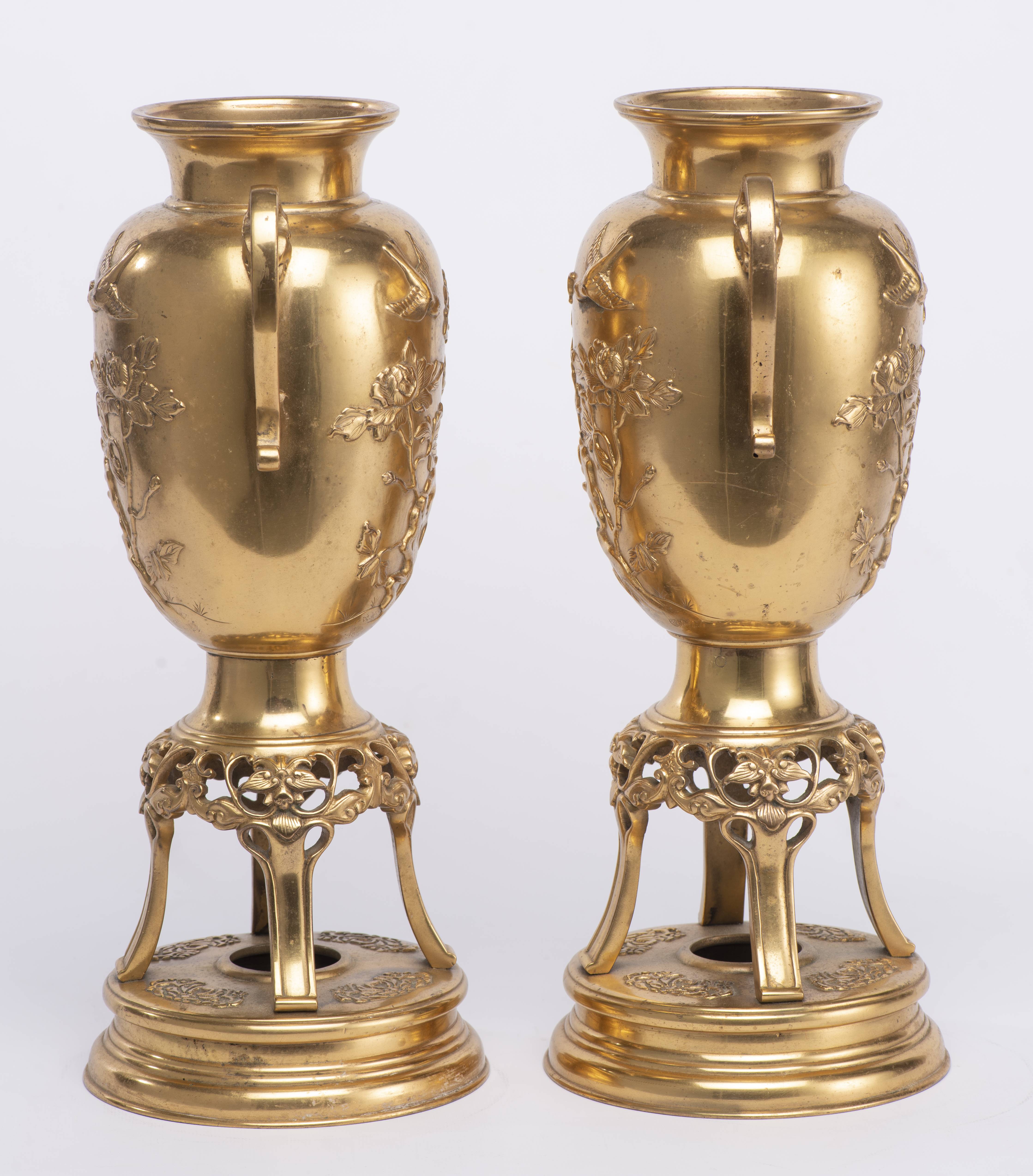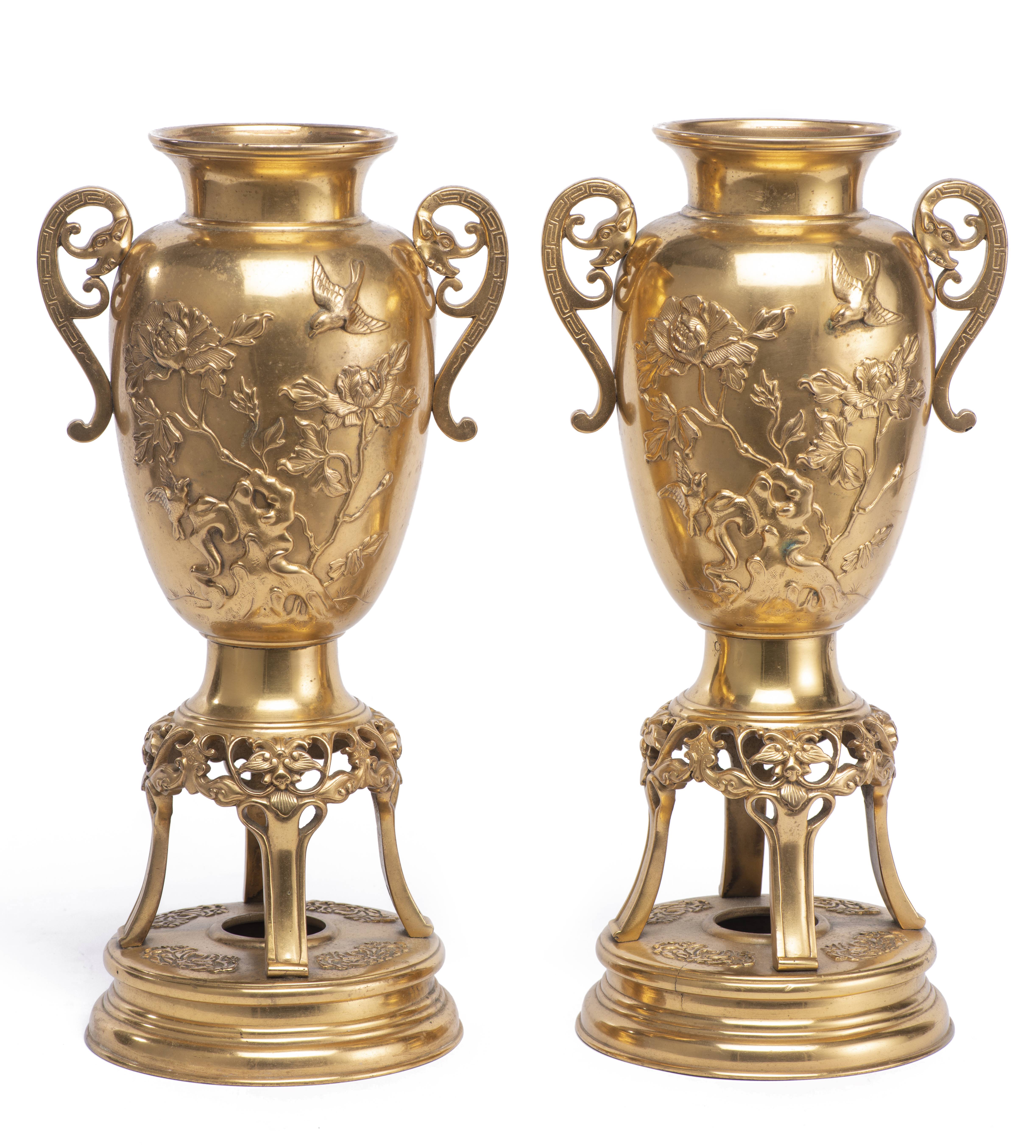 Paire de vases en bronze de Chine à patine dorée et décor en léger relief d'oiseaux et chrysanthèmes et rochers du Taihu. Deux anses en forme de Chilong.