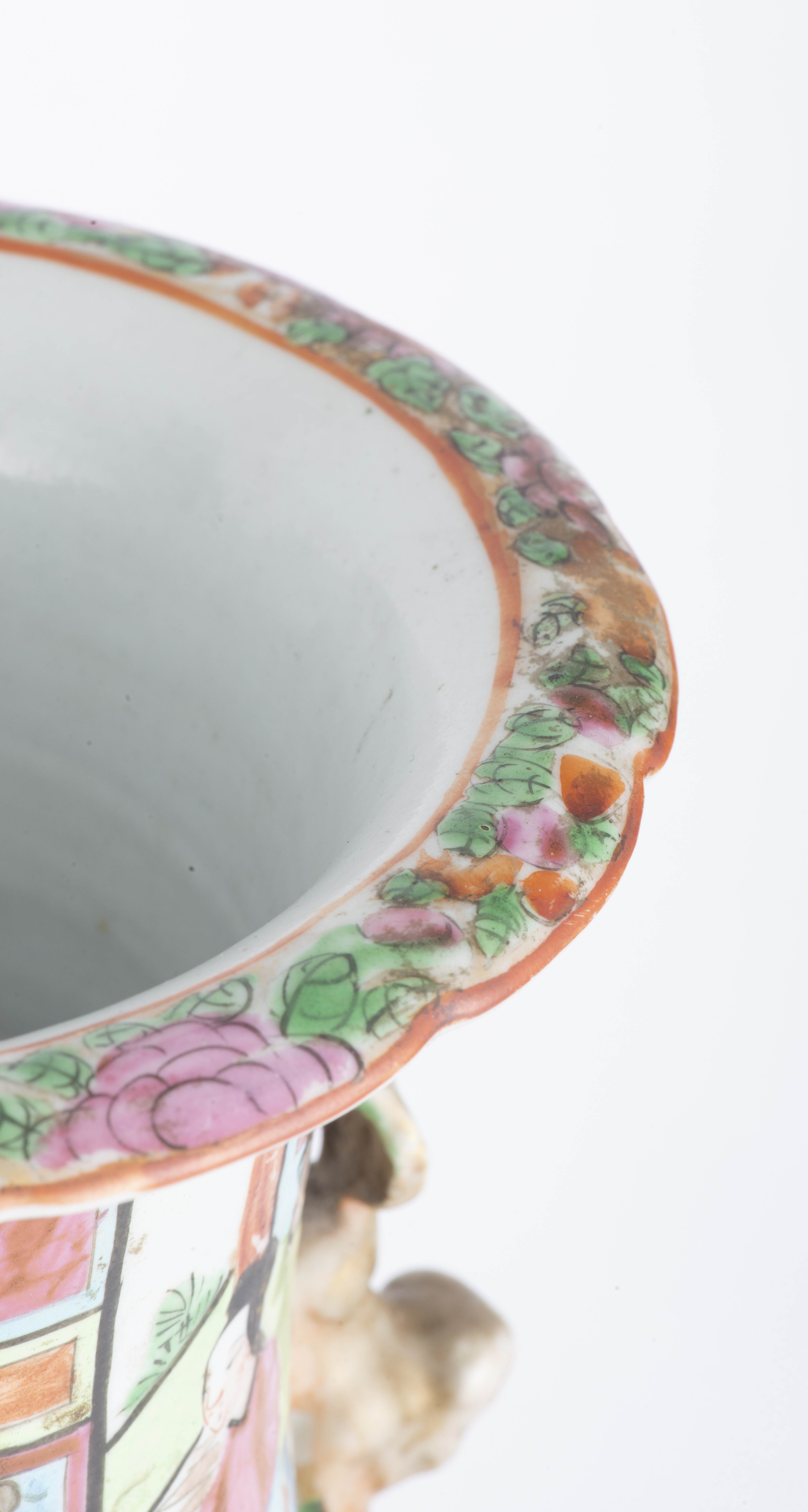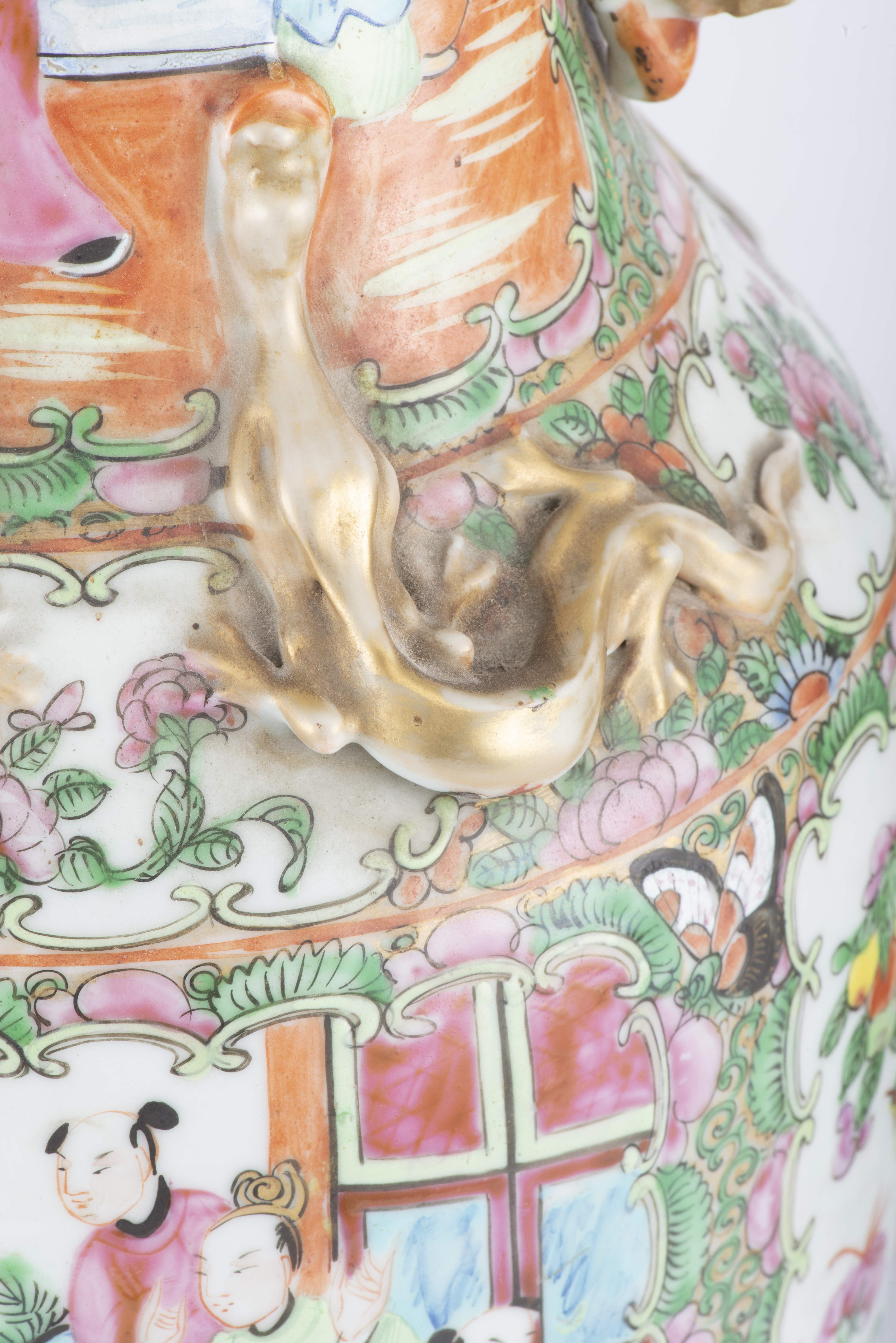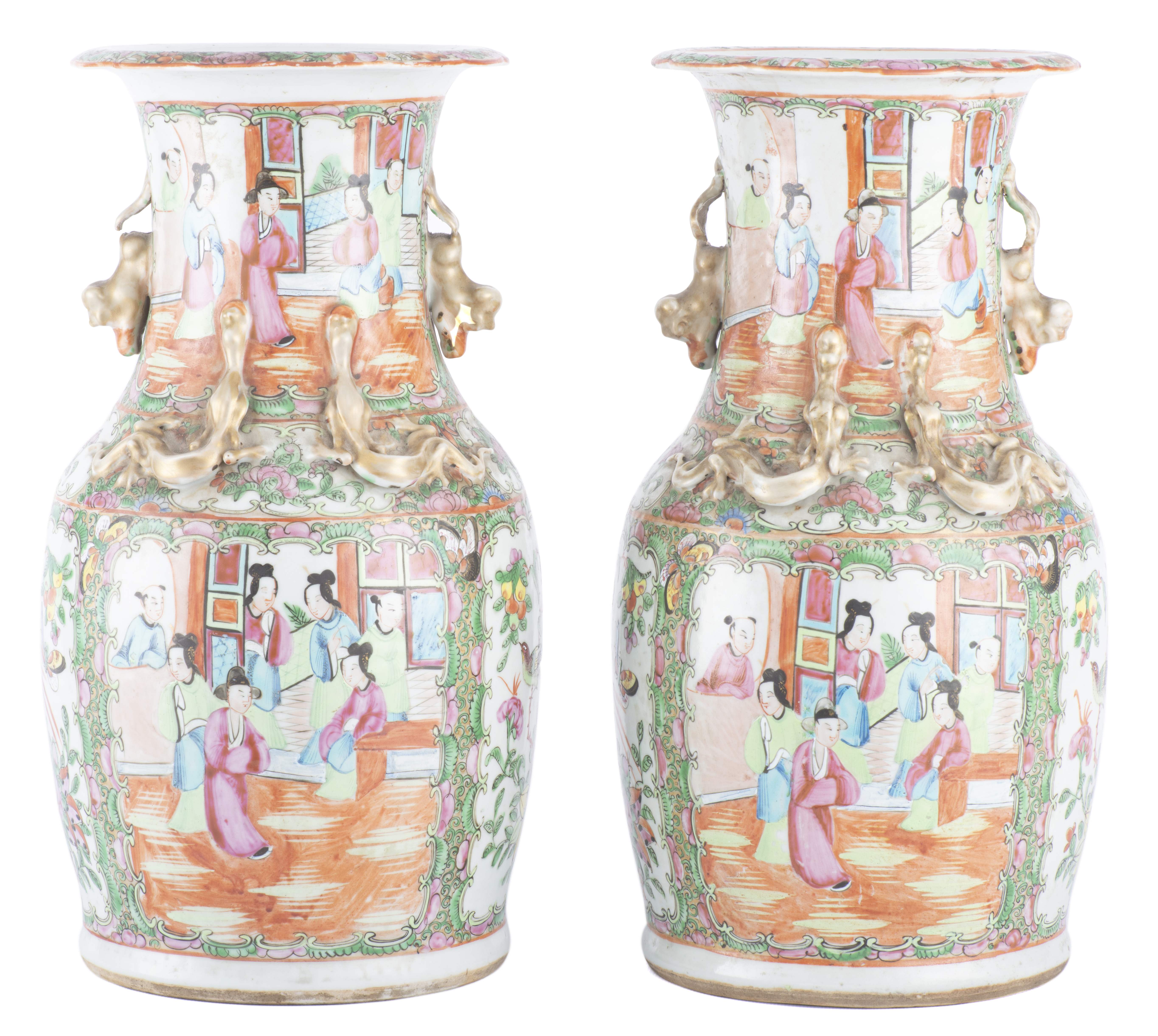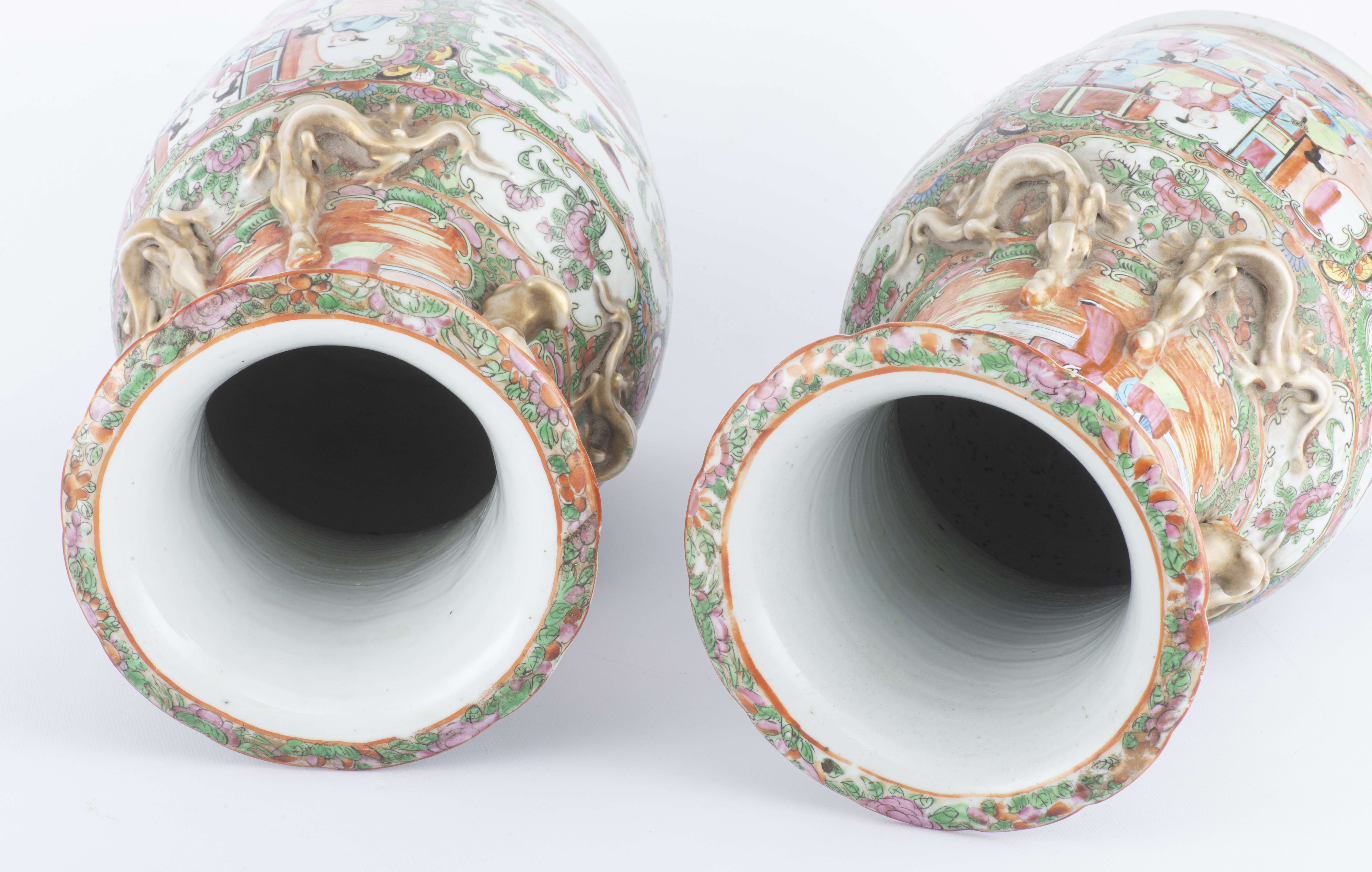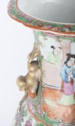 Paire de vases en porcelaine de Canton vers 1820 à décor en médaillons en famille rose de personnages sur un perron et de fleurs, fruits et oiseaux, épaule à décor de salamandres dorées, col à anses en forme de shishi dorés, lèvre intérieure à frise florale.