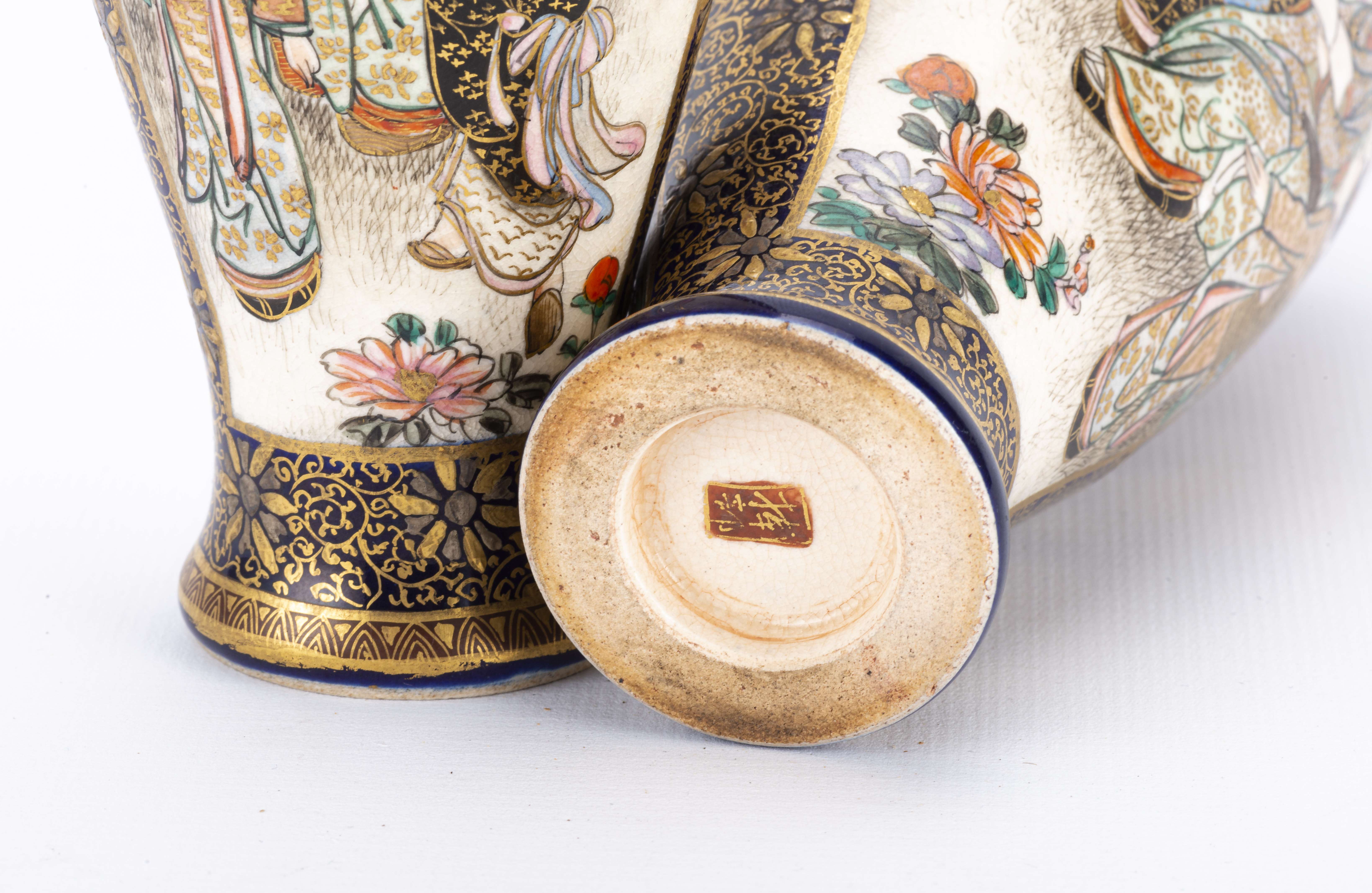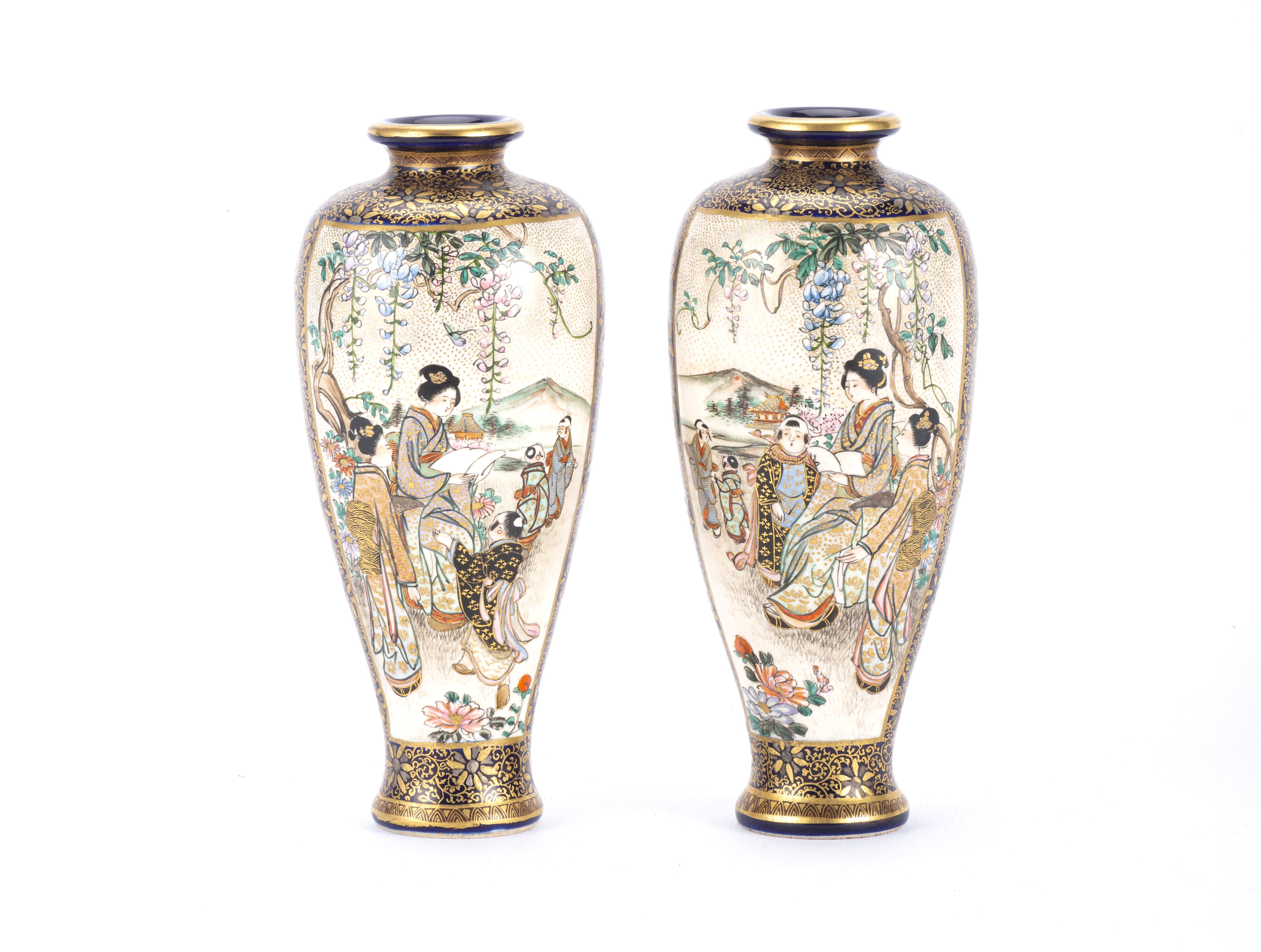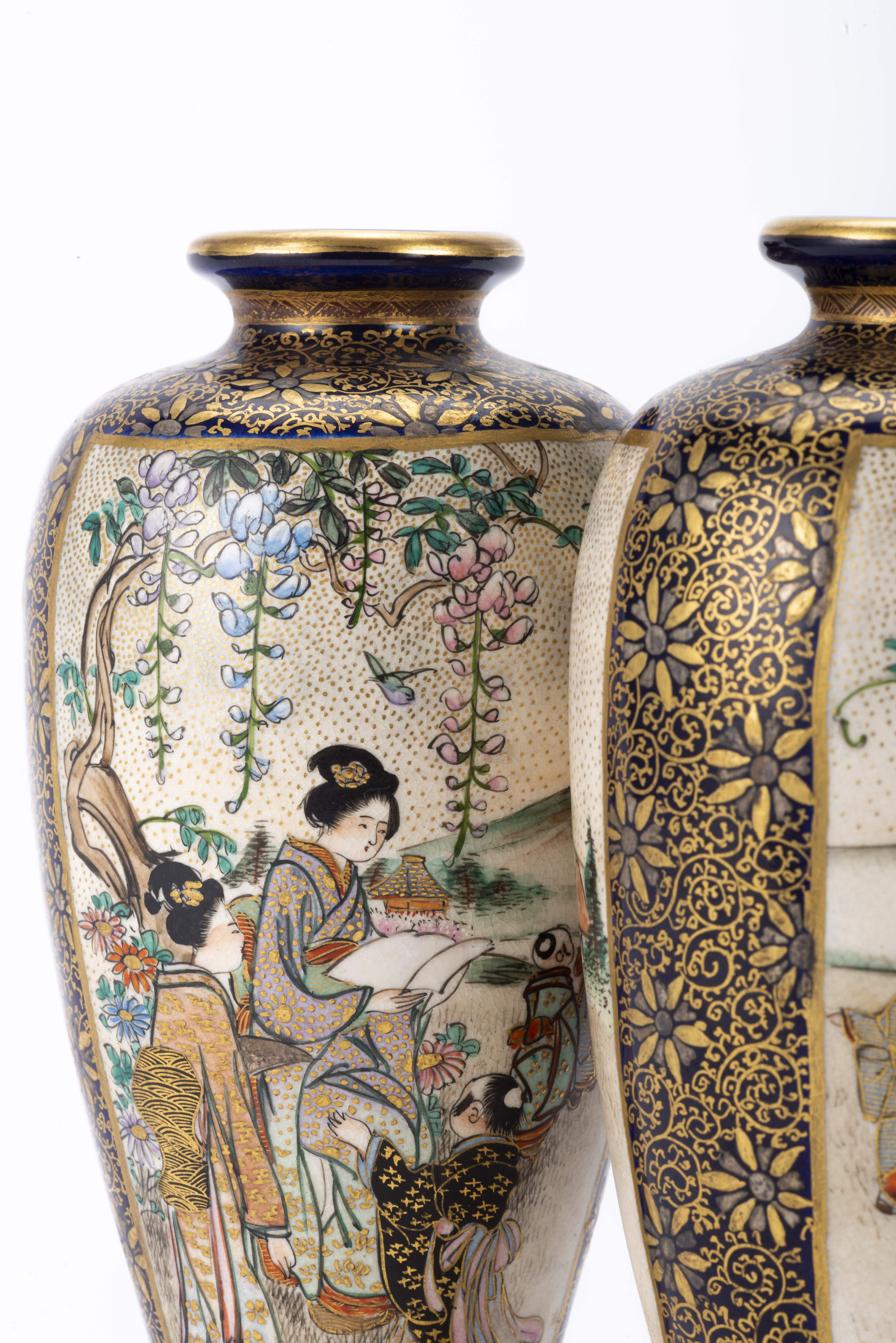 Paire de vases en porcelaine de Satsuma Japon époque Taisho à décor de jeunes femmes dans des paysages en médaillons sur champ bleu et or.
