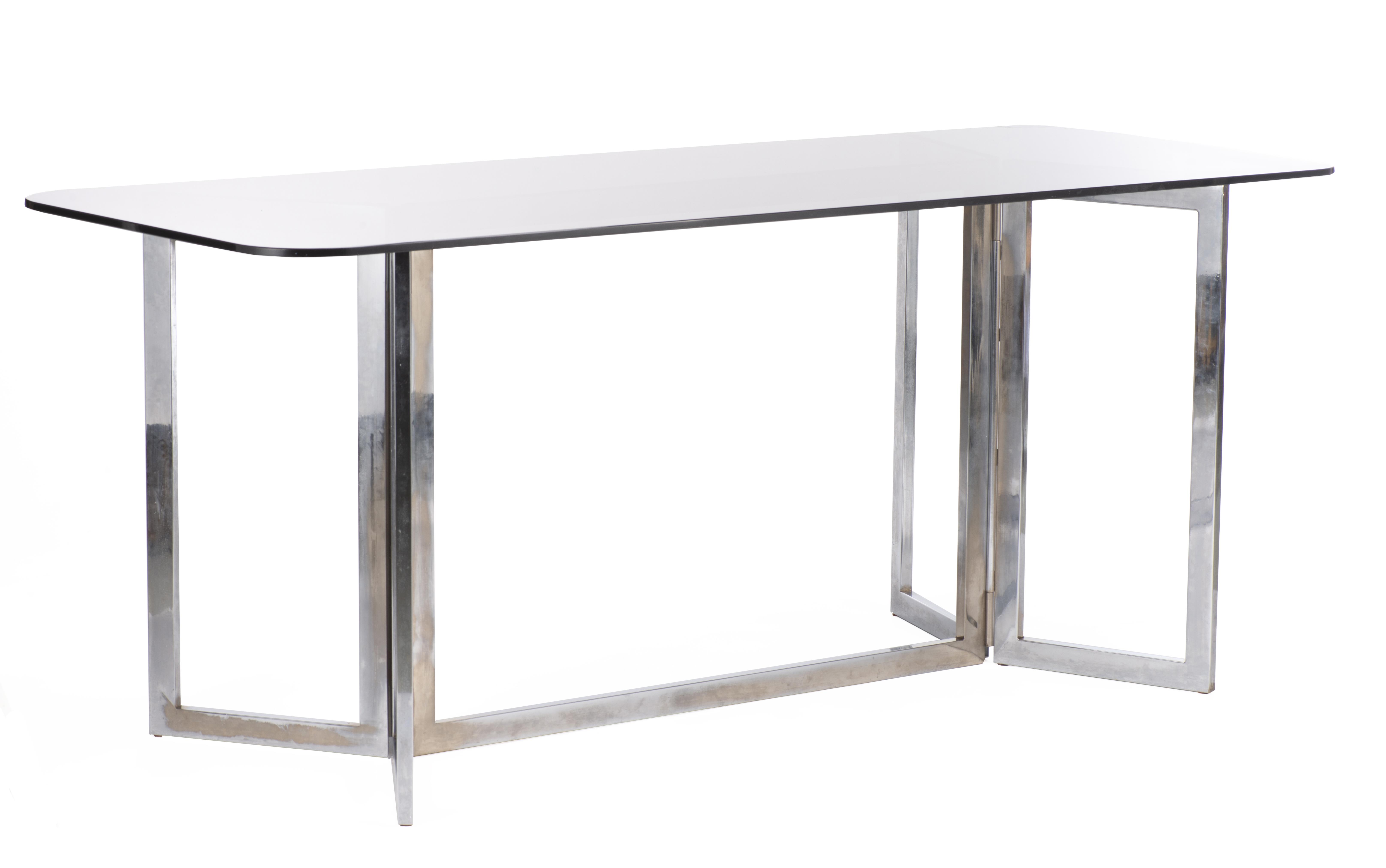 Paul LEGEARD (XXe), dans le goût, table ou bureau des années 70, piètement pliable en acier chromé, dessous en verre fumé aux bords arrondis.