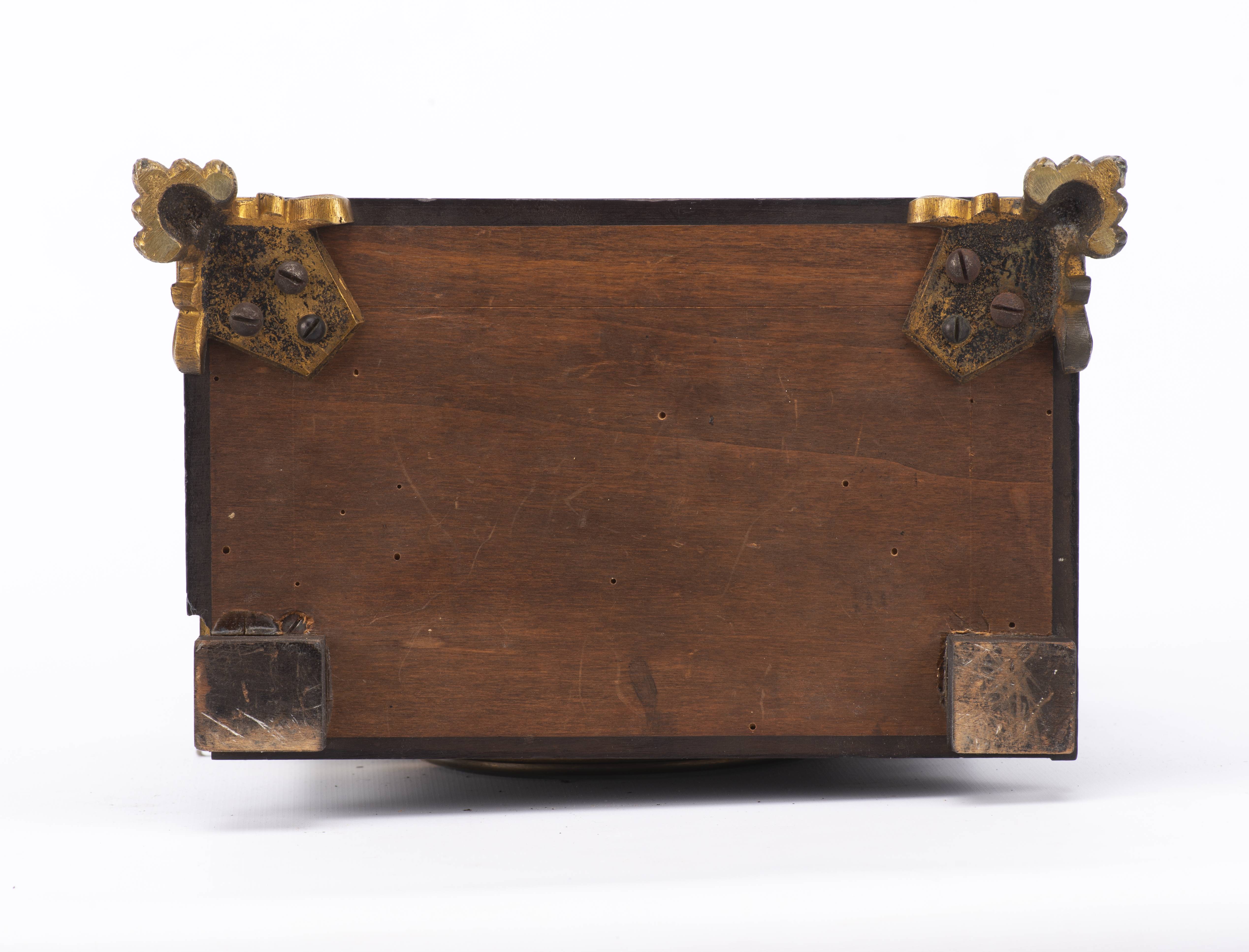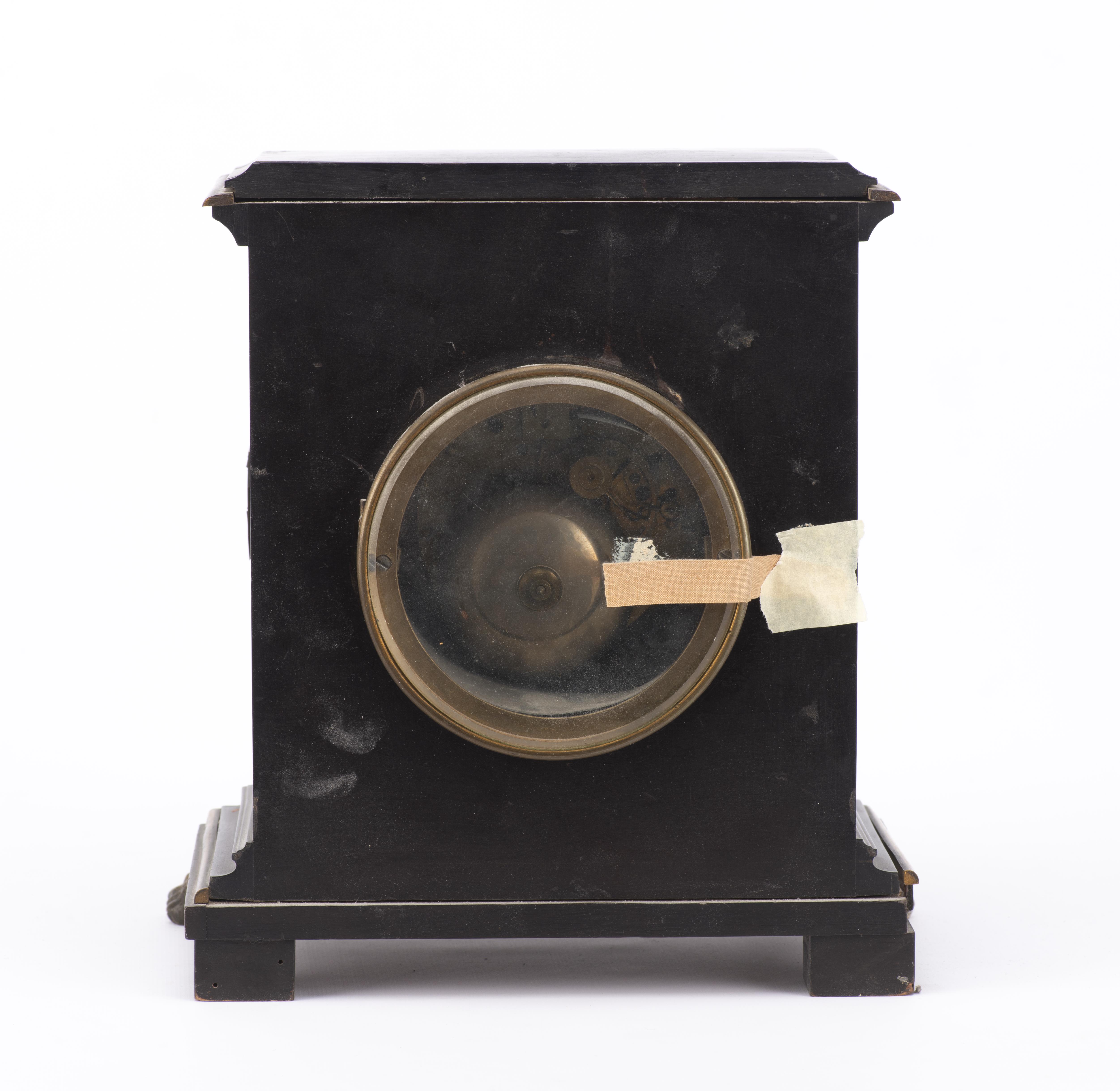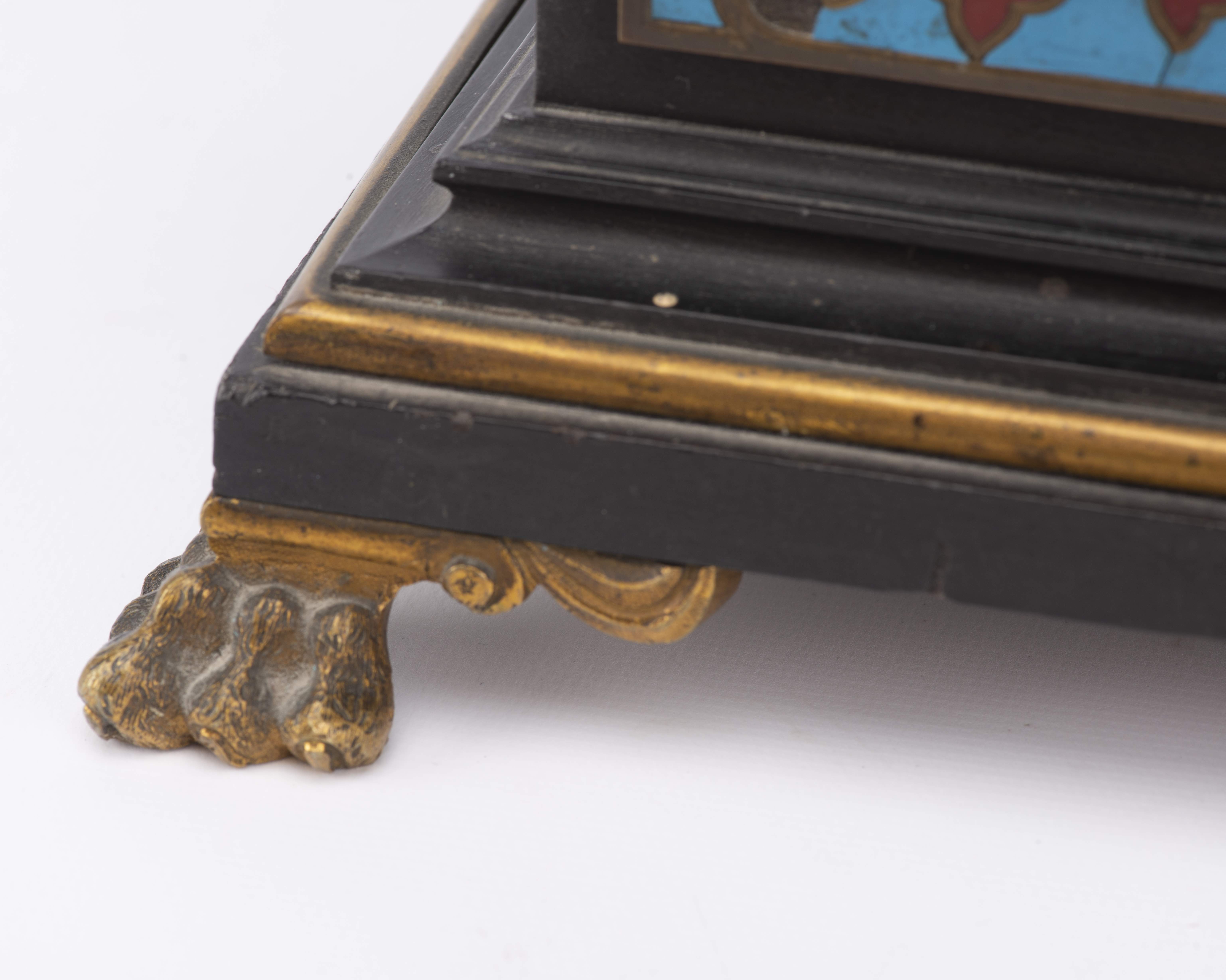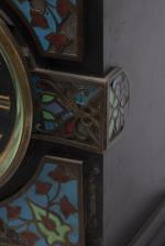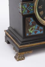 Pendule de cheminée en bois noir et émail, cadran en marbre noir signé Lay à Paris à chiffres romains gravés dorés, mouvement signé Lay Fnt Pge Jouffroy 26 286 29 /1982. Epoque Nap. III.