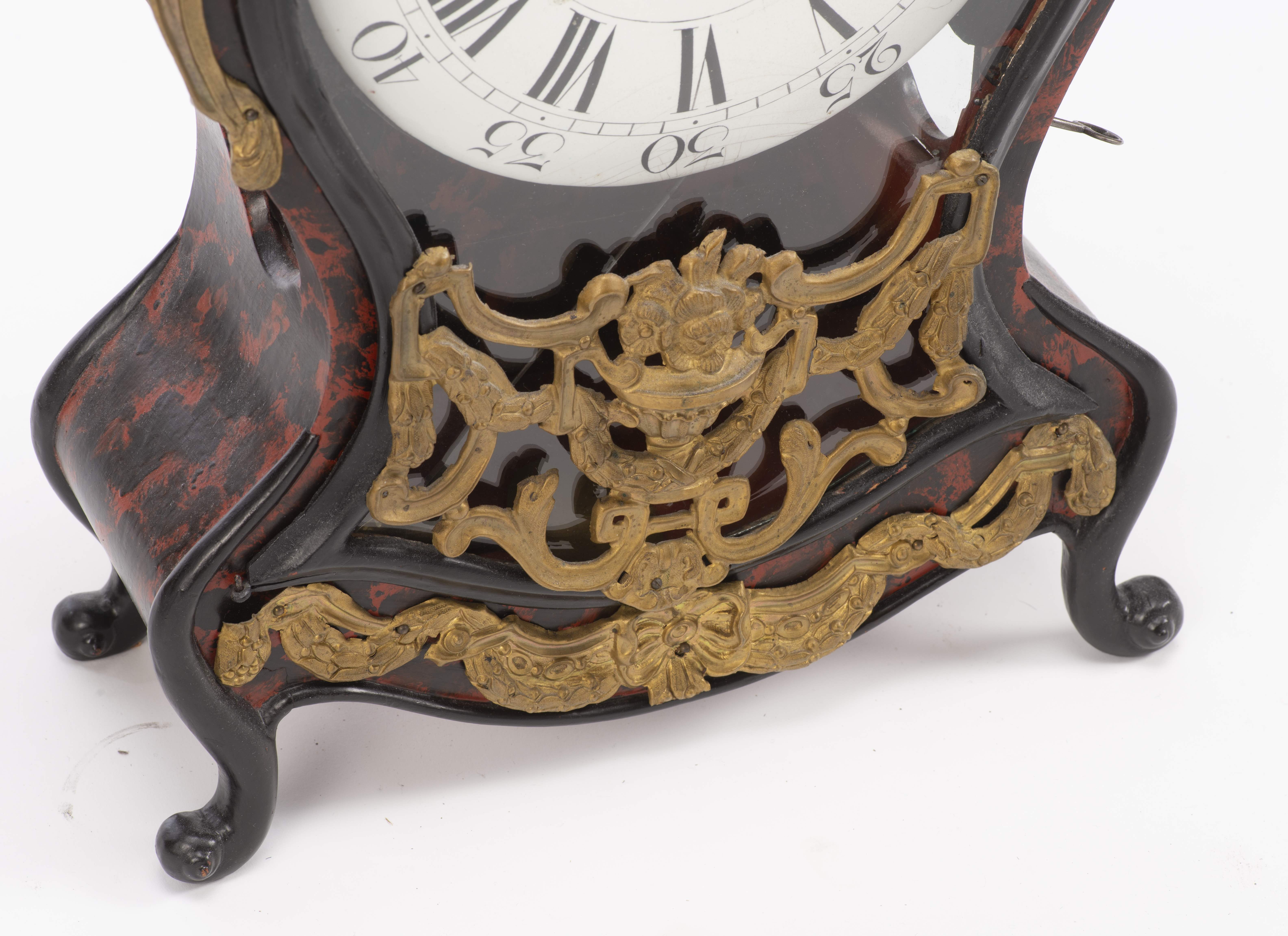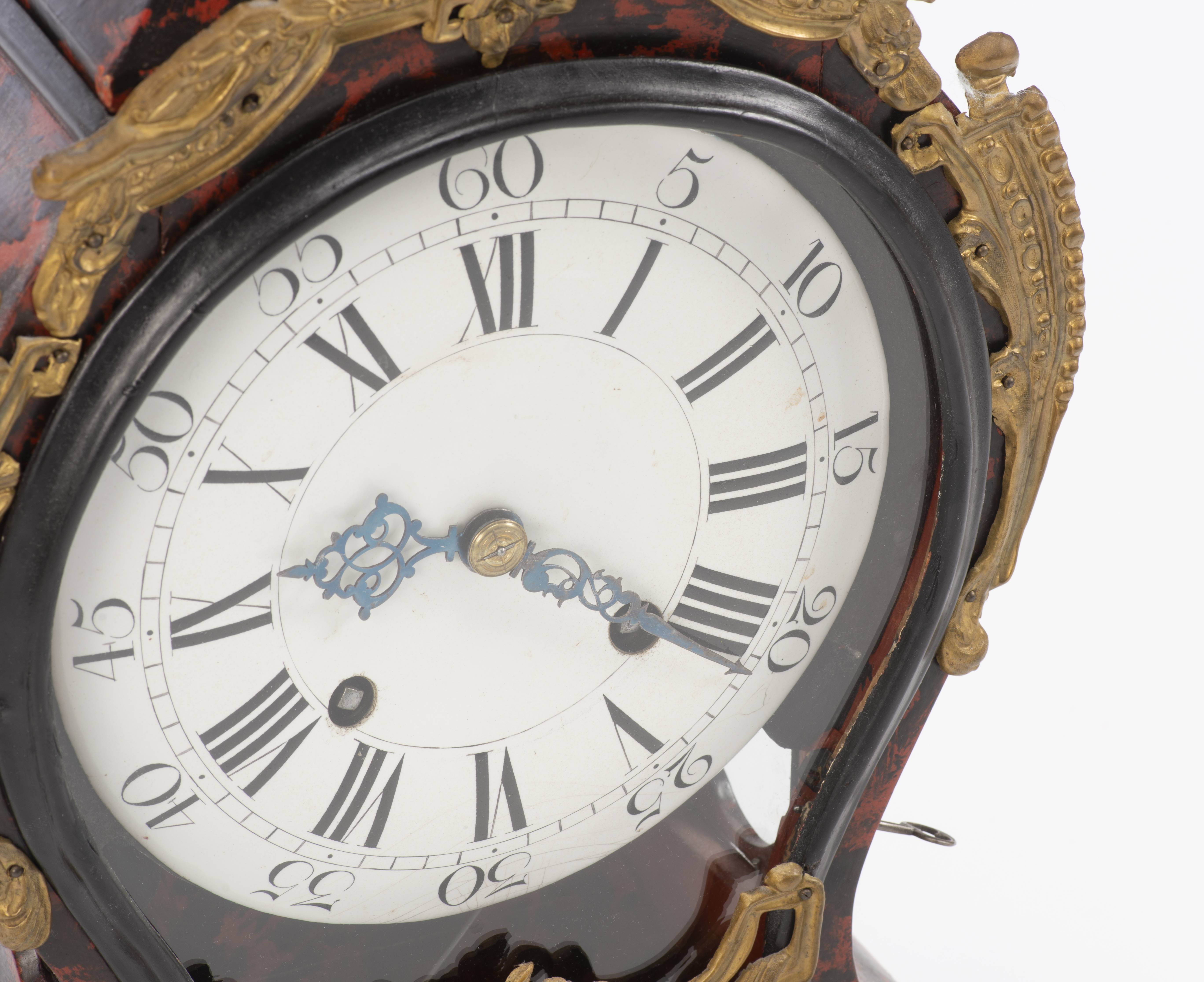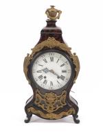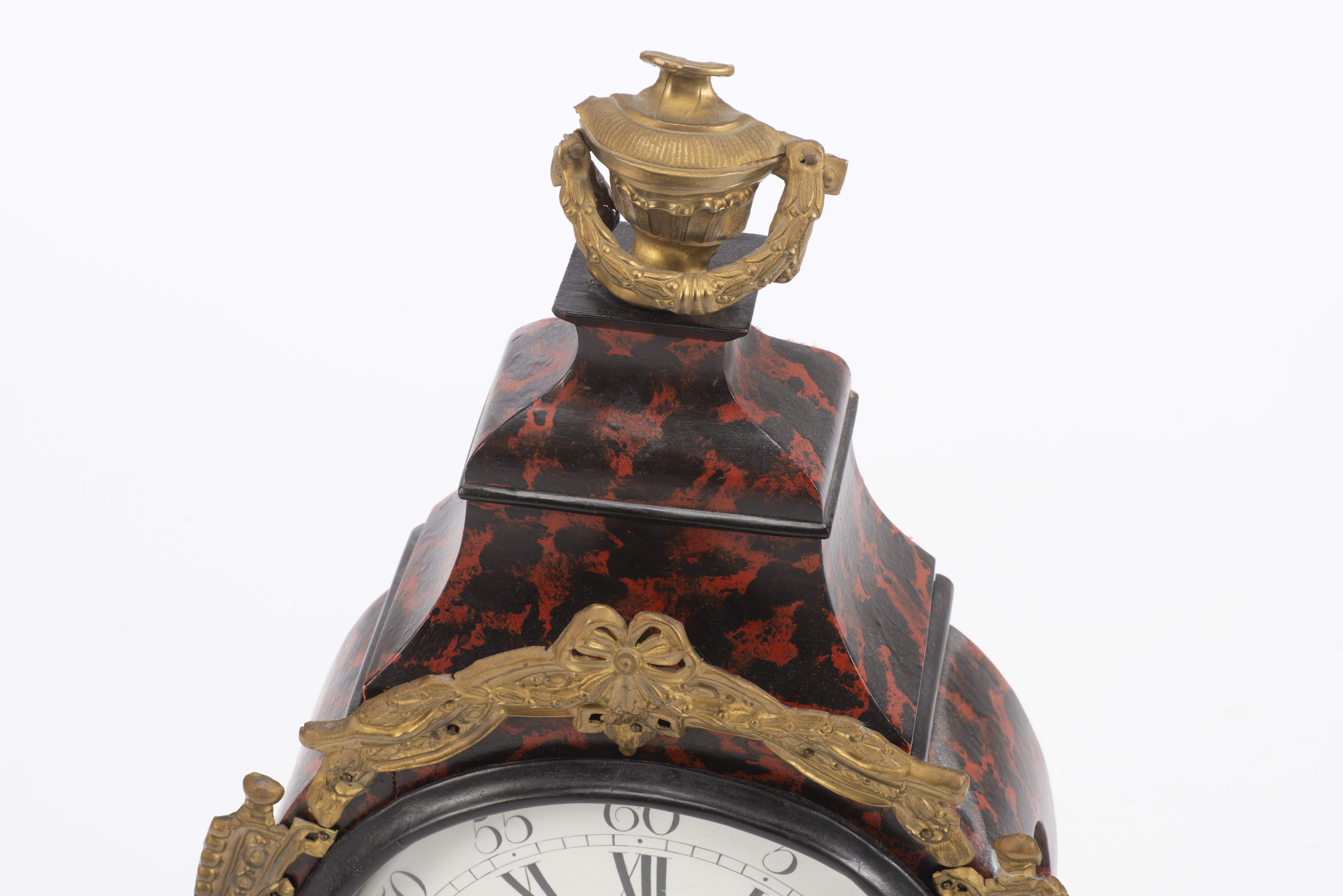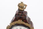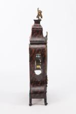 Pendule en partie d'époque Louis XV, caisse en bois imitant l'écaille de torture, ornements en métal doré à décor de nœuds, urnes et rubans, cadran à cuvette en émail, chiffres romains et arabes, aiguilles bleuïes.