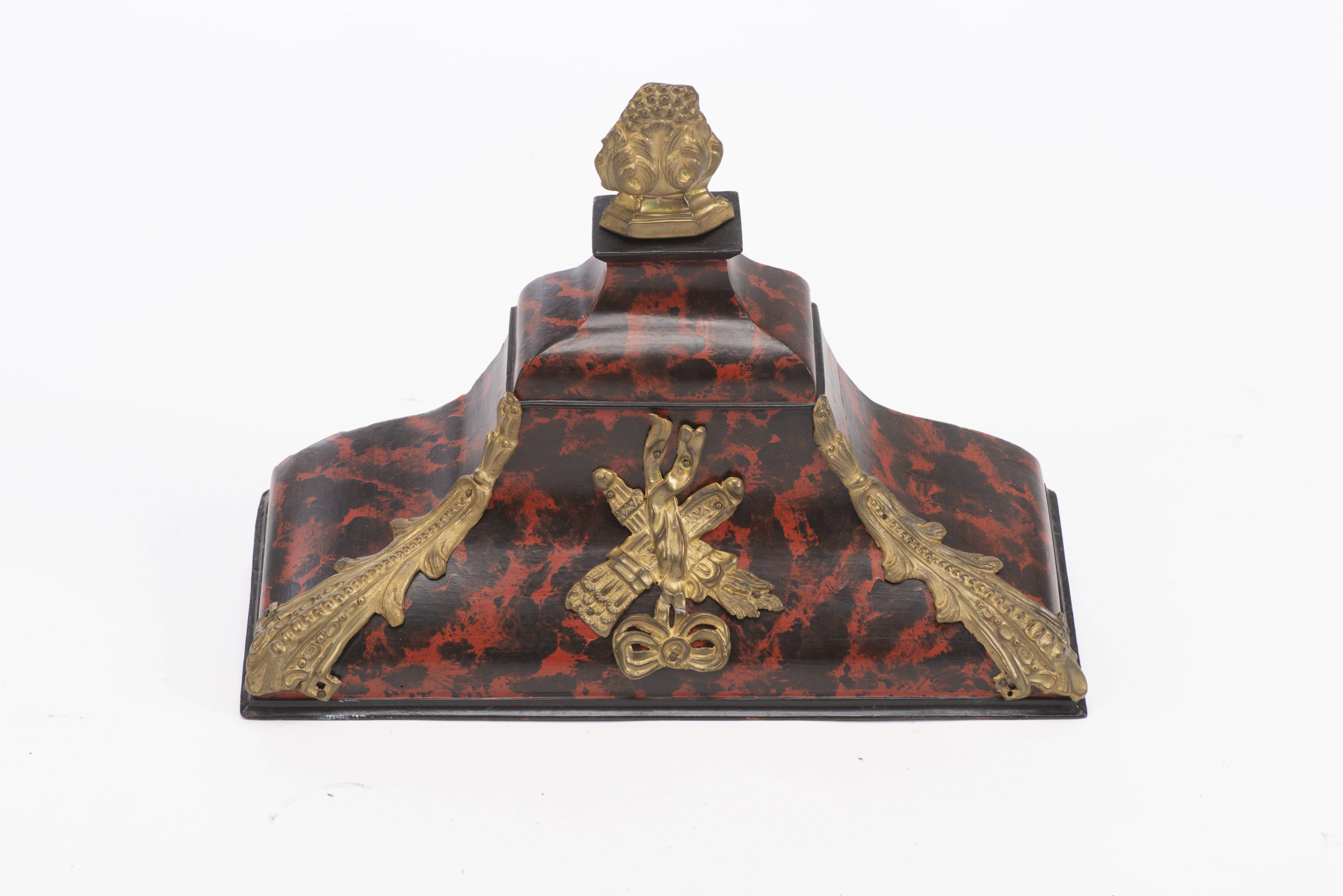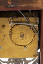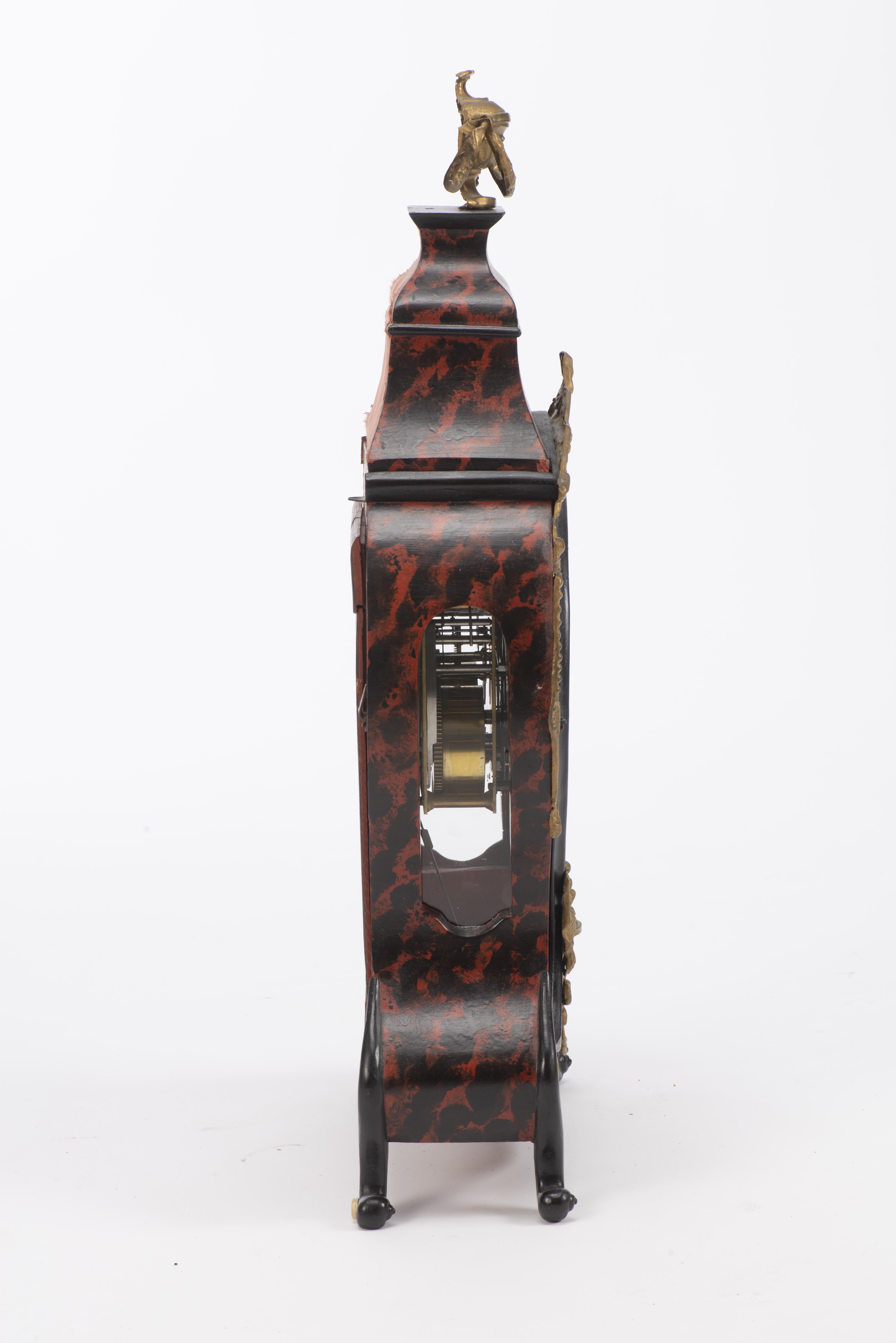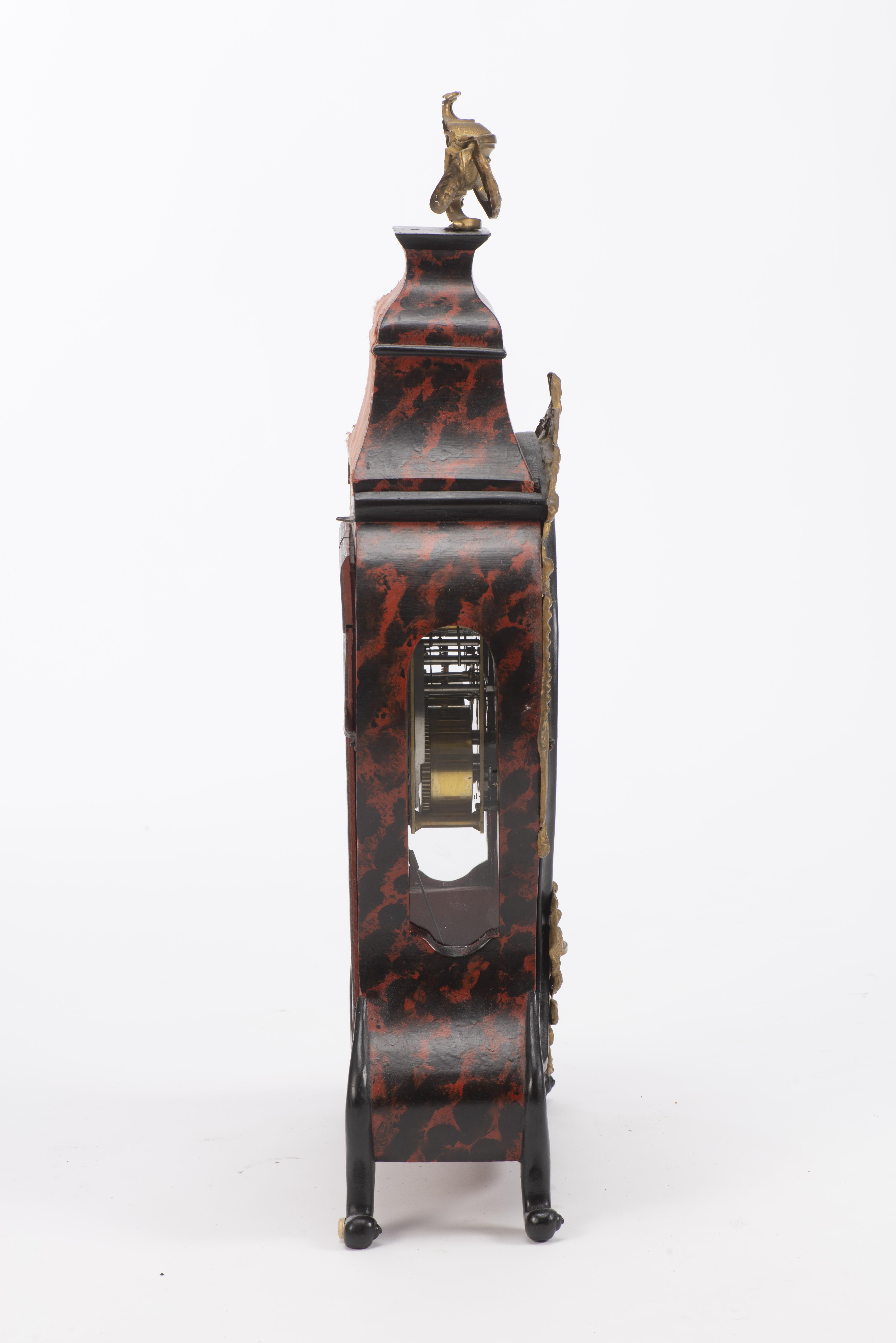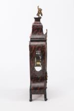 Pendule en partie d'époque Louis XV, caisse en bois imitant l'écaille de torture, ornements en métal doré à décor de nœuds, urnes et rubans, cadran à cuvette en émail, chiffres romains et arabes, aiguilles bleuïes.