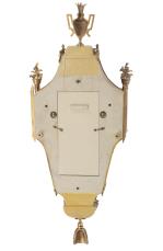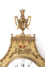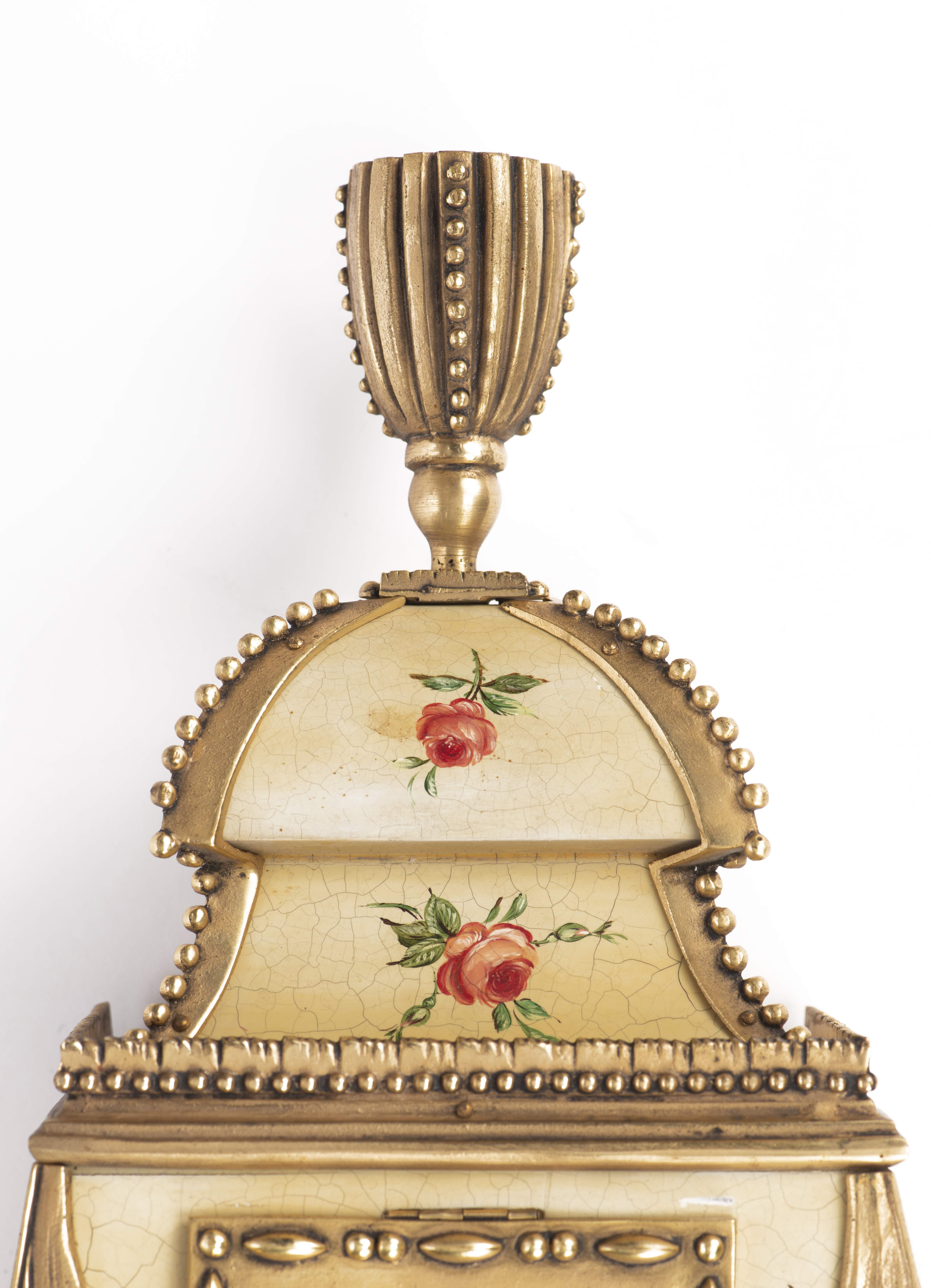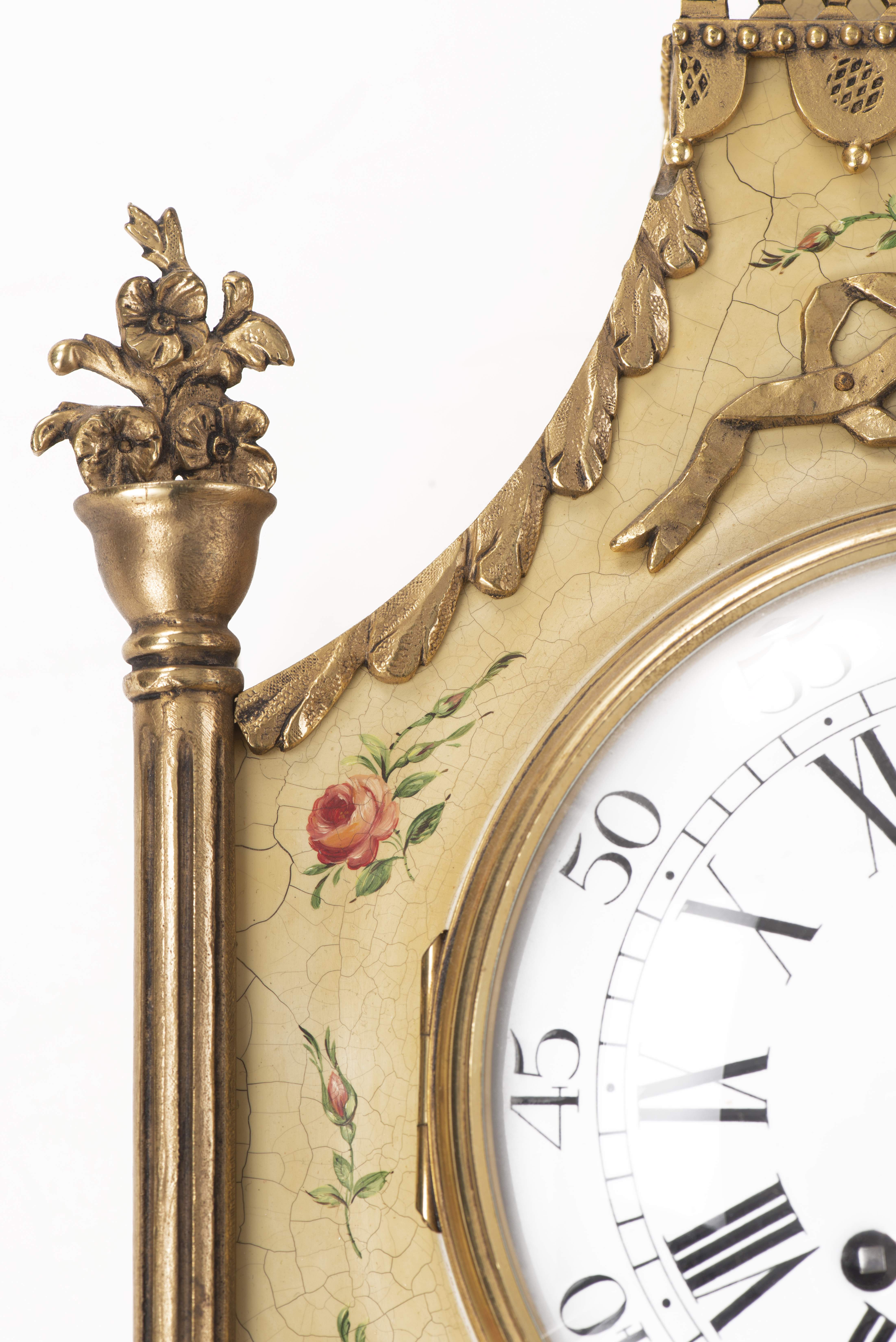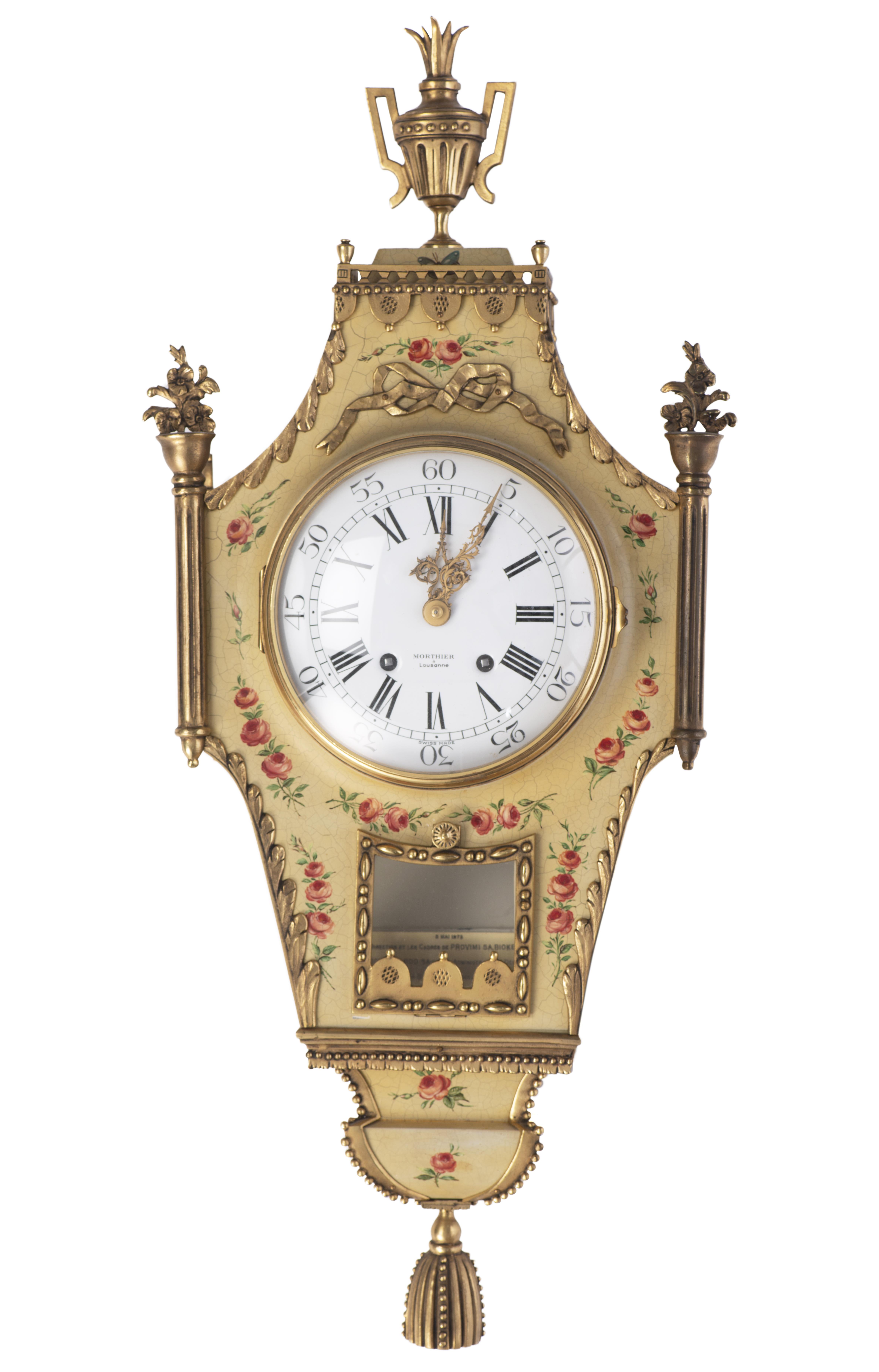 Pendule murale par Morthier à Lausanne, réplica d'une pendule Louis XVI à bâti en vernis martin à décor de roses sur fond vieux vert, surmonté d'une galerie présentant un vase à anses fleuri et flanqué sur les côtés de deux colonnes surmontées de pots fleuris. Avec mouvement Zenith 511-11.
