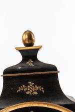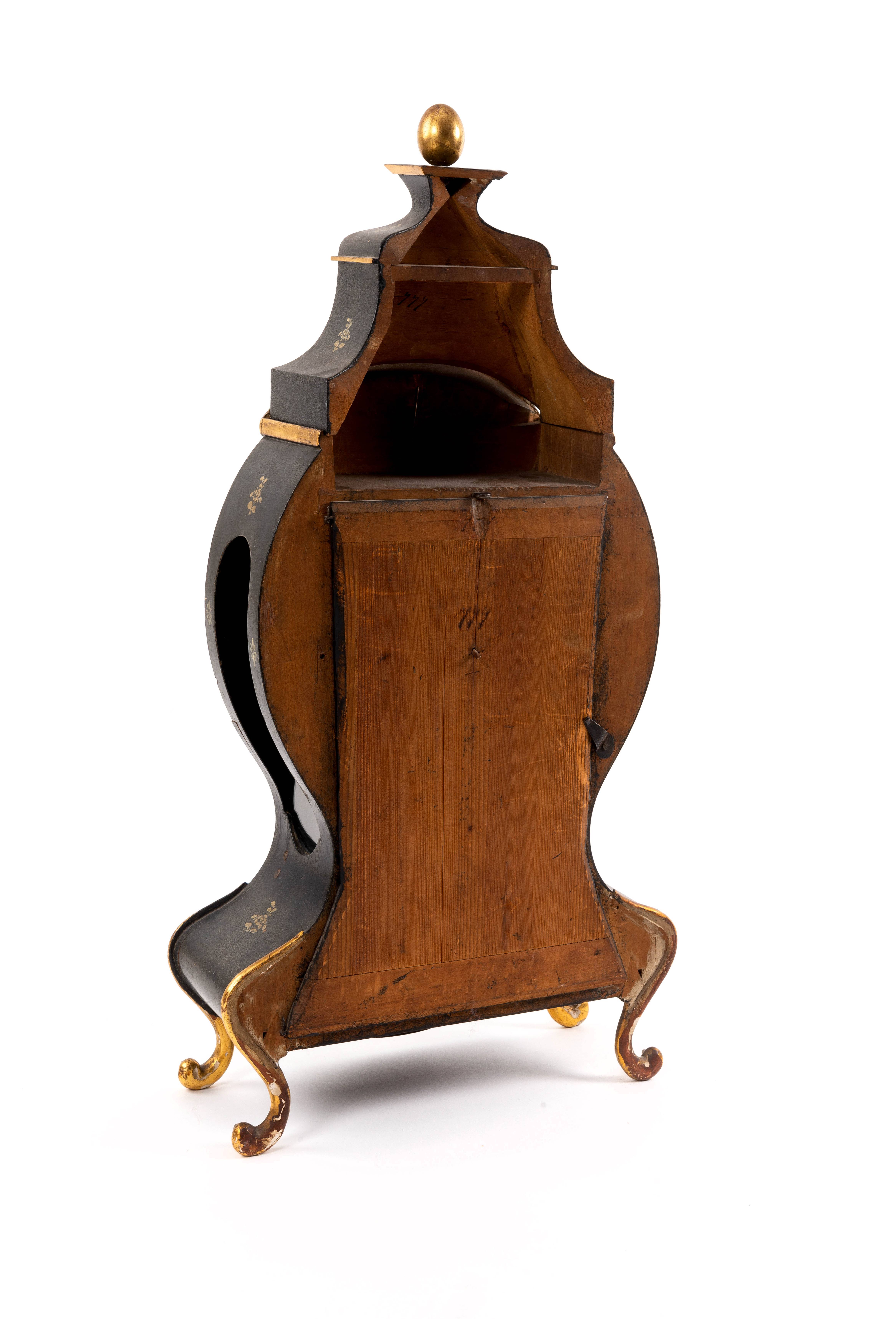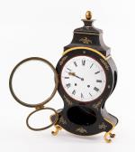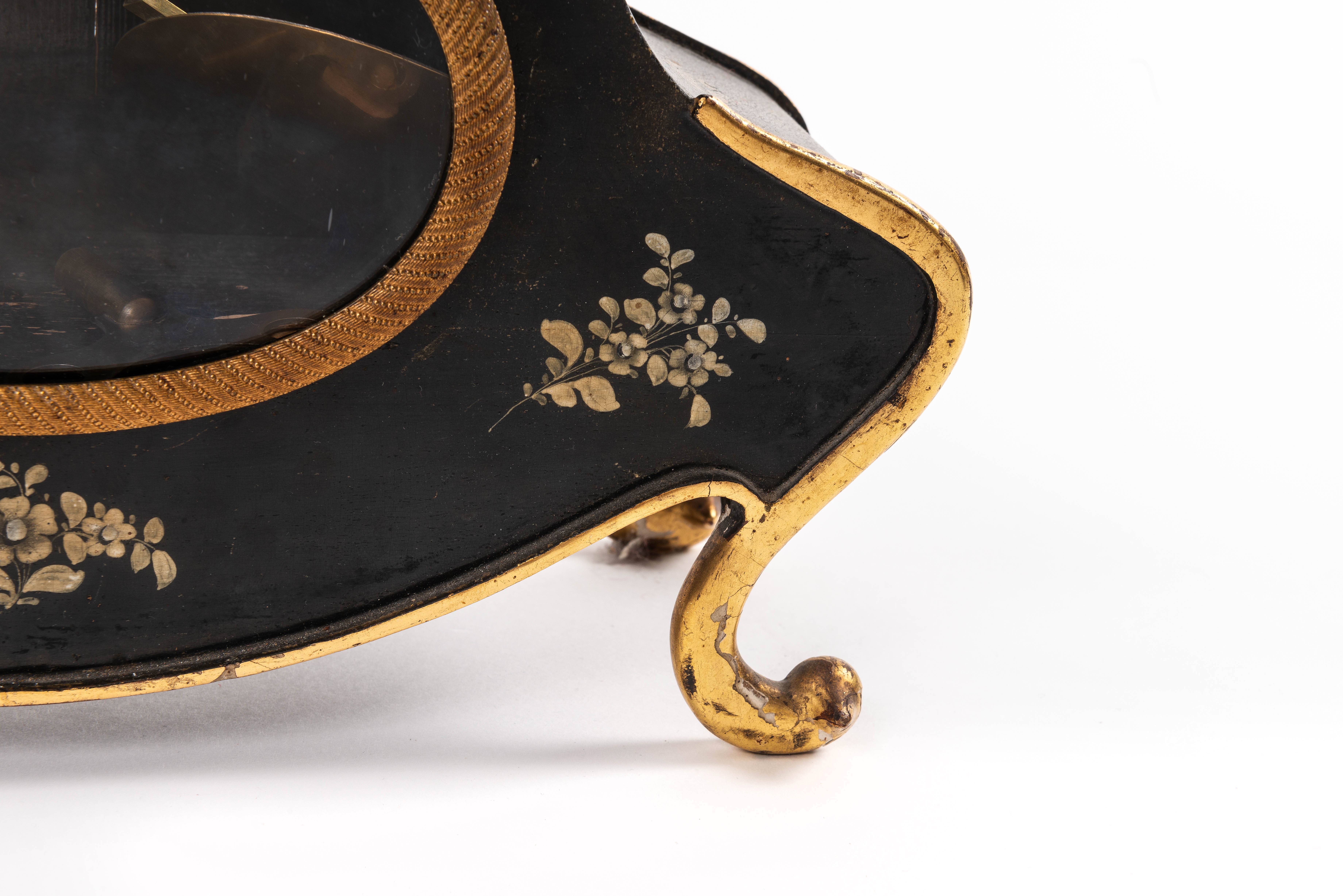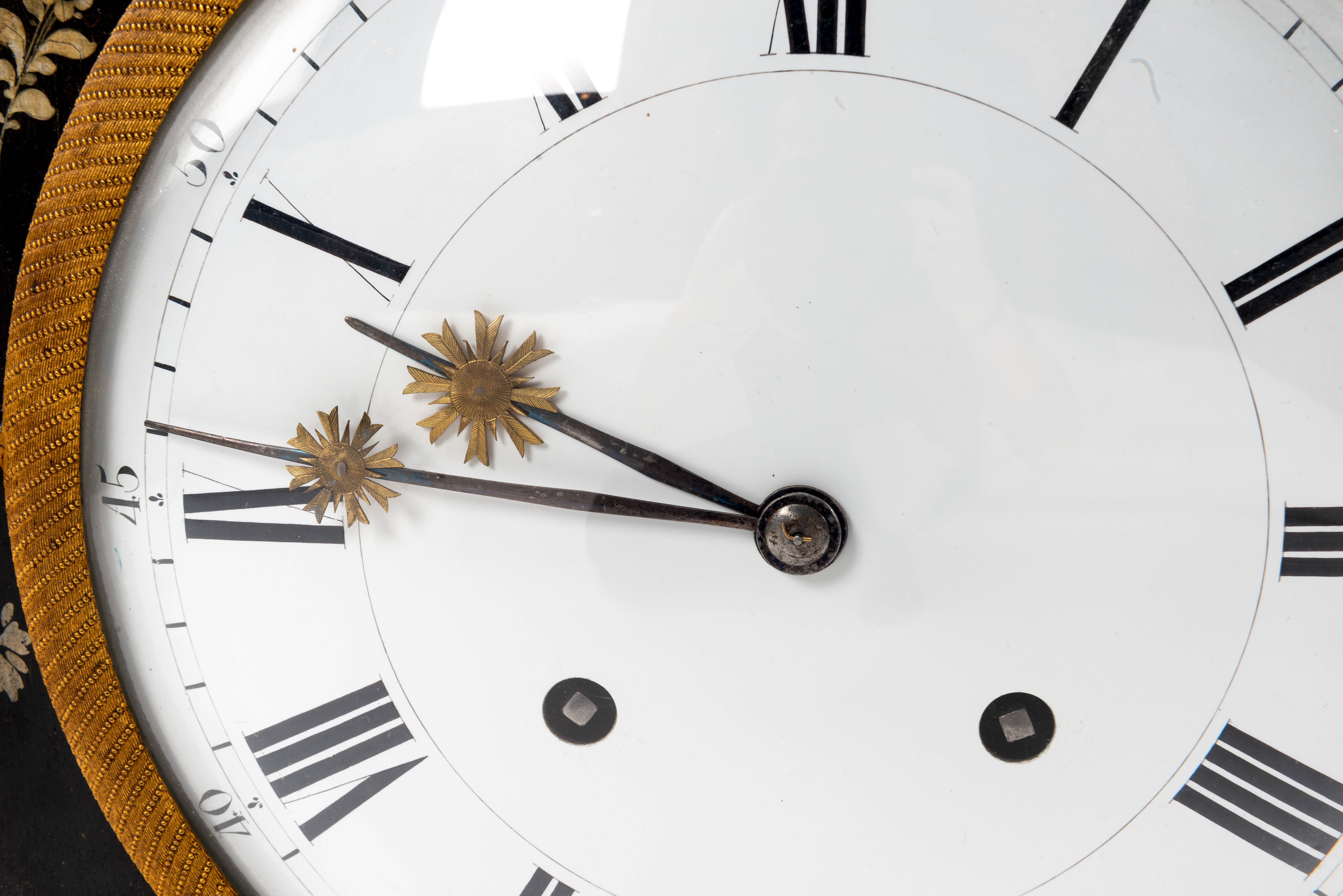 Pendule neuchâteloise à décor peint de guirlandes de fleurs avec son cul-de-lampe, bordure du cadre et de la caisse en bronze ciselé et doré, cadran en émail blanc et chiffres romains, aiguilles à décor d'étoiles