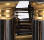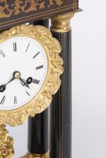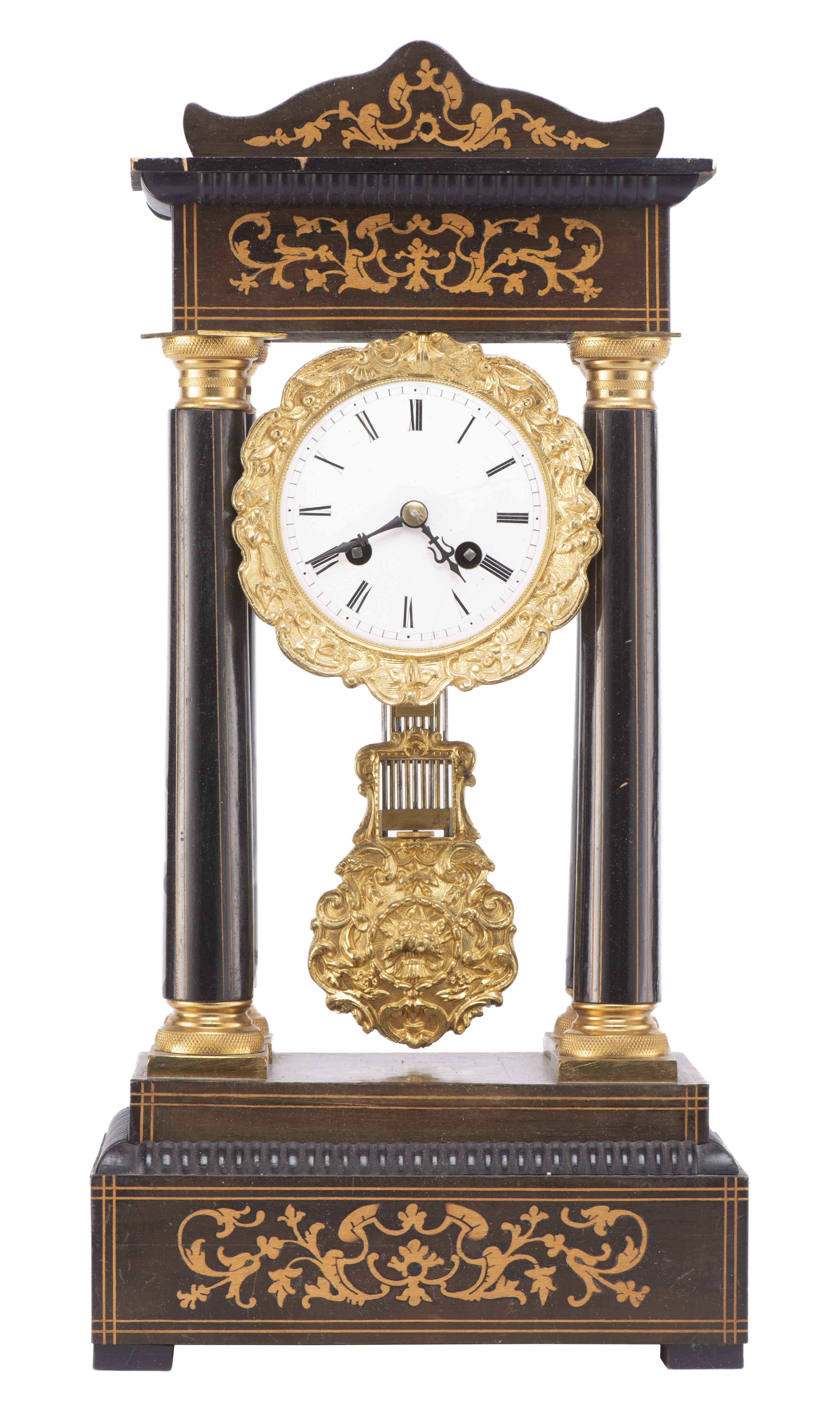 Pendule à 4 colonnes de style Napoléon III à marqueterie de deux couleurs, mouvement cylindre à médaille de bronze.