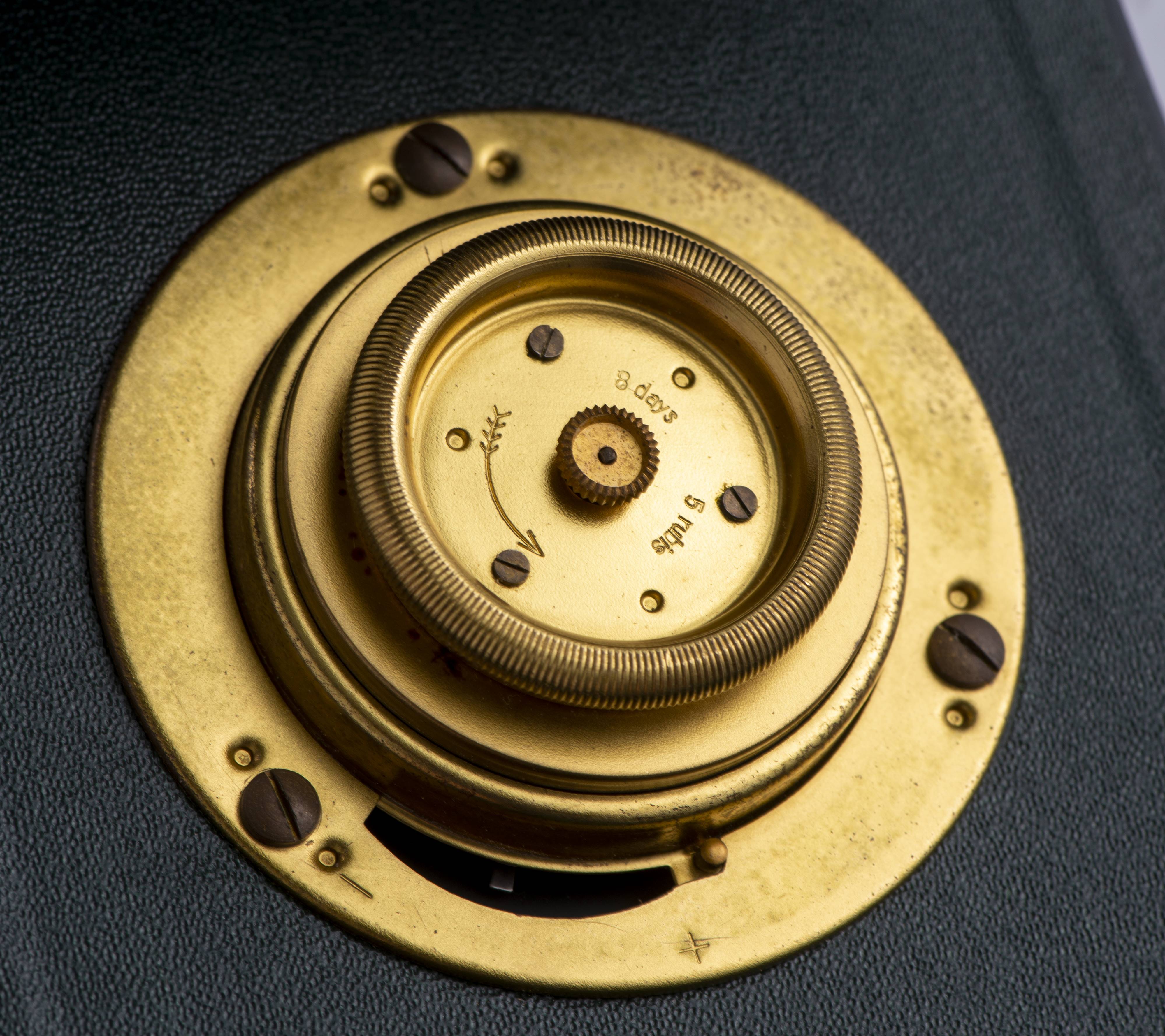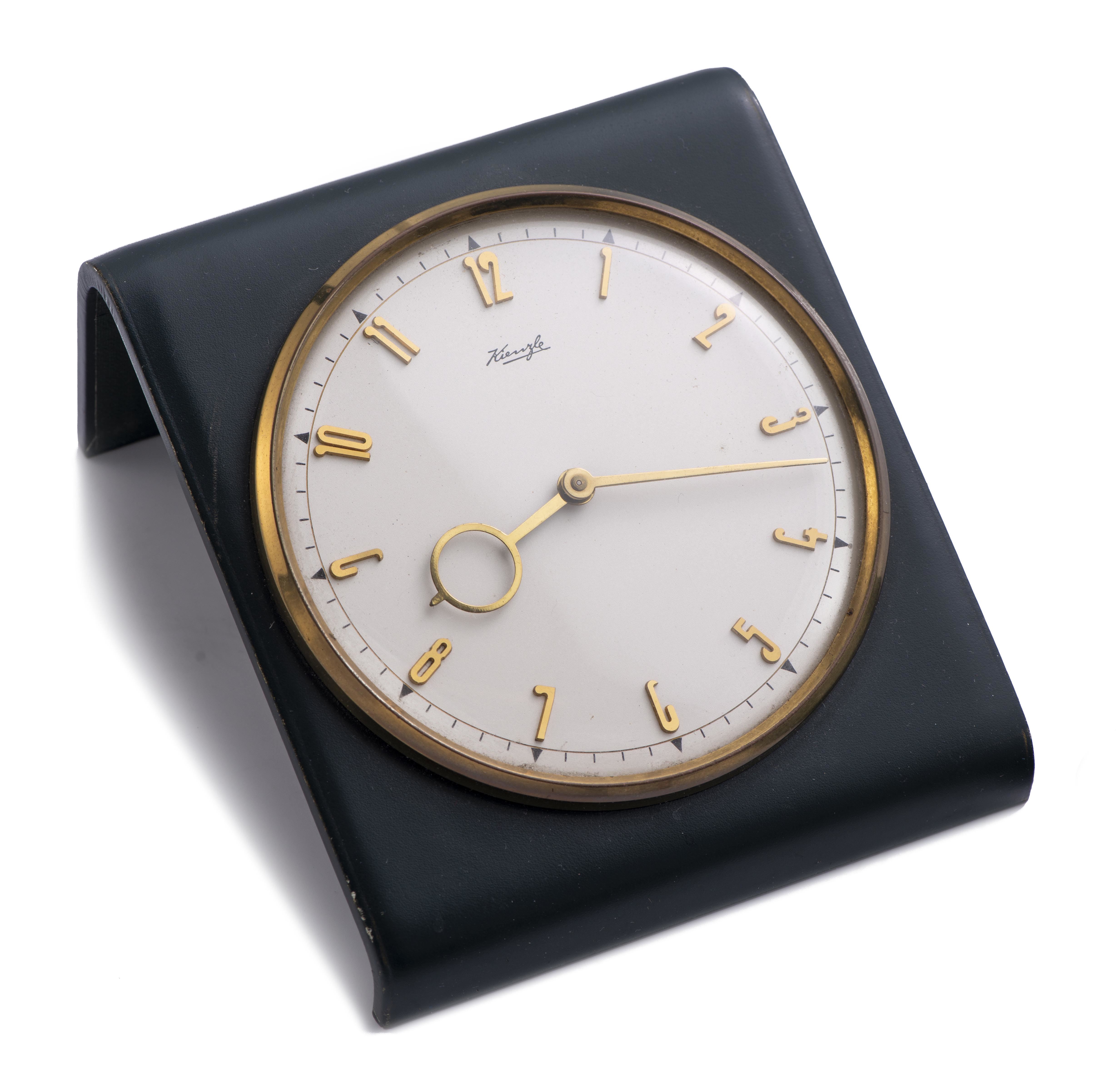 Pendulette de table Kienzle des années 1950 et support en cuir vert.