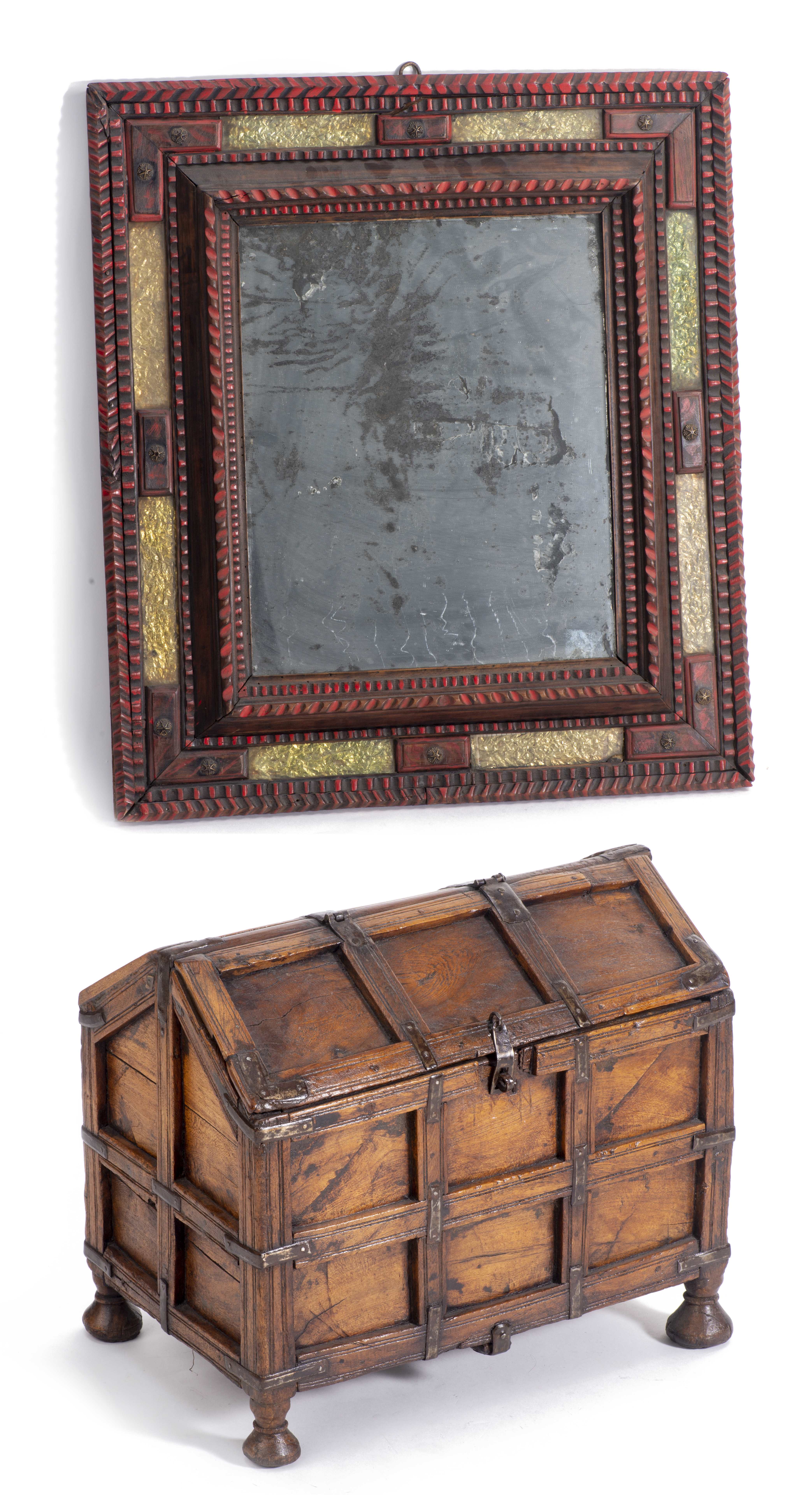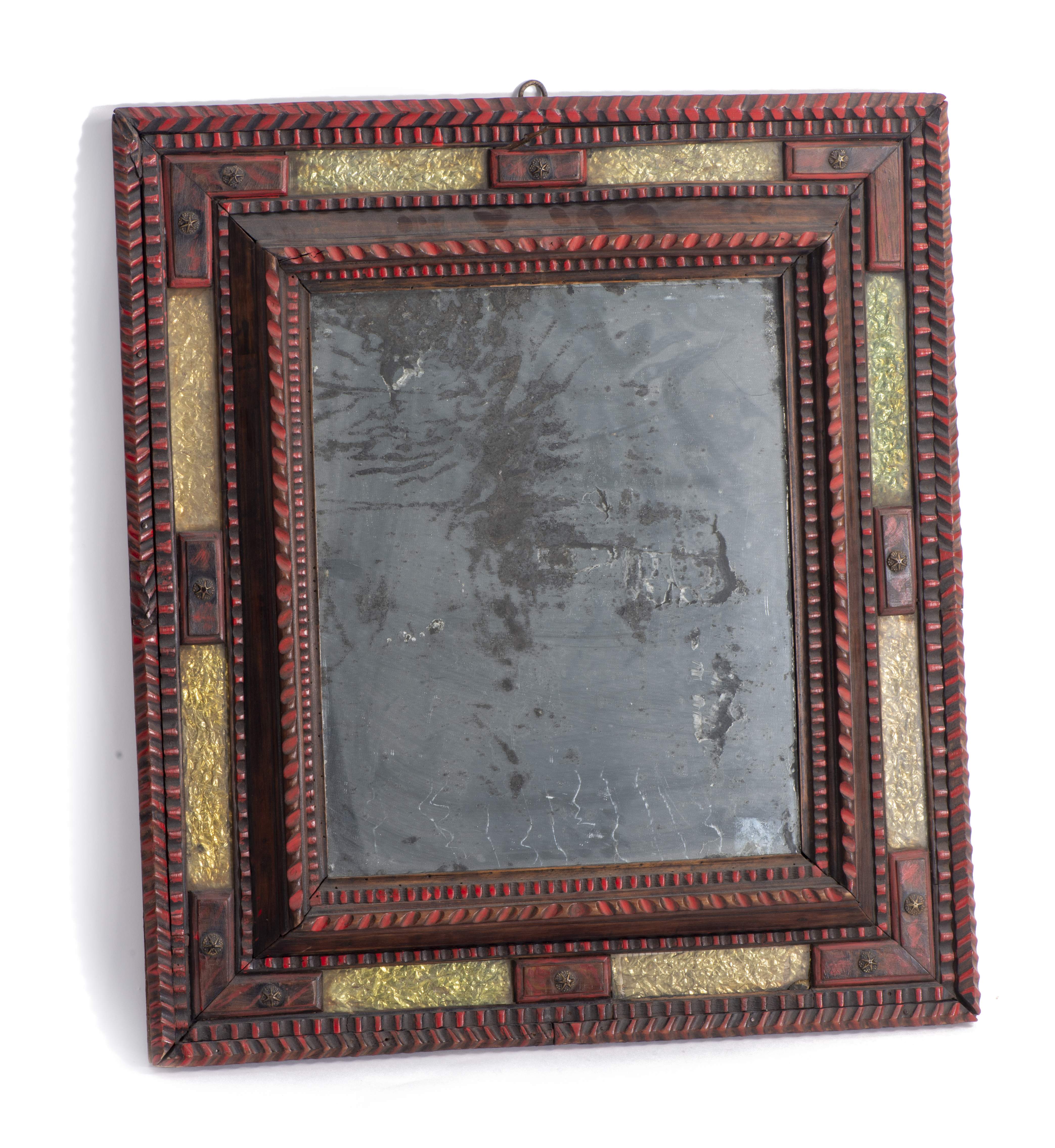 On y joint un miroir avec cadre en bois sculpté et peint en rouge.