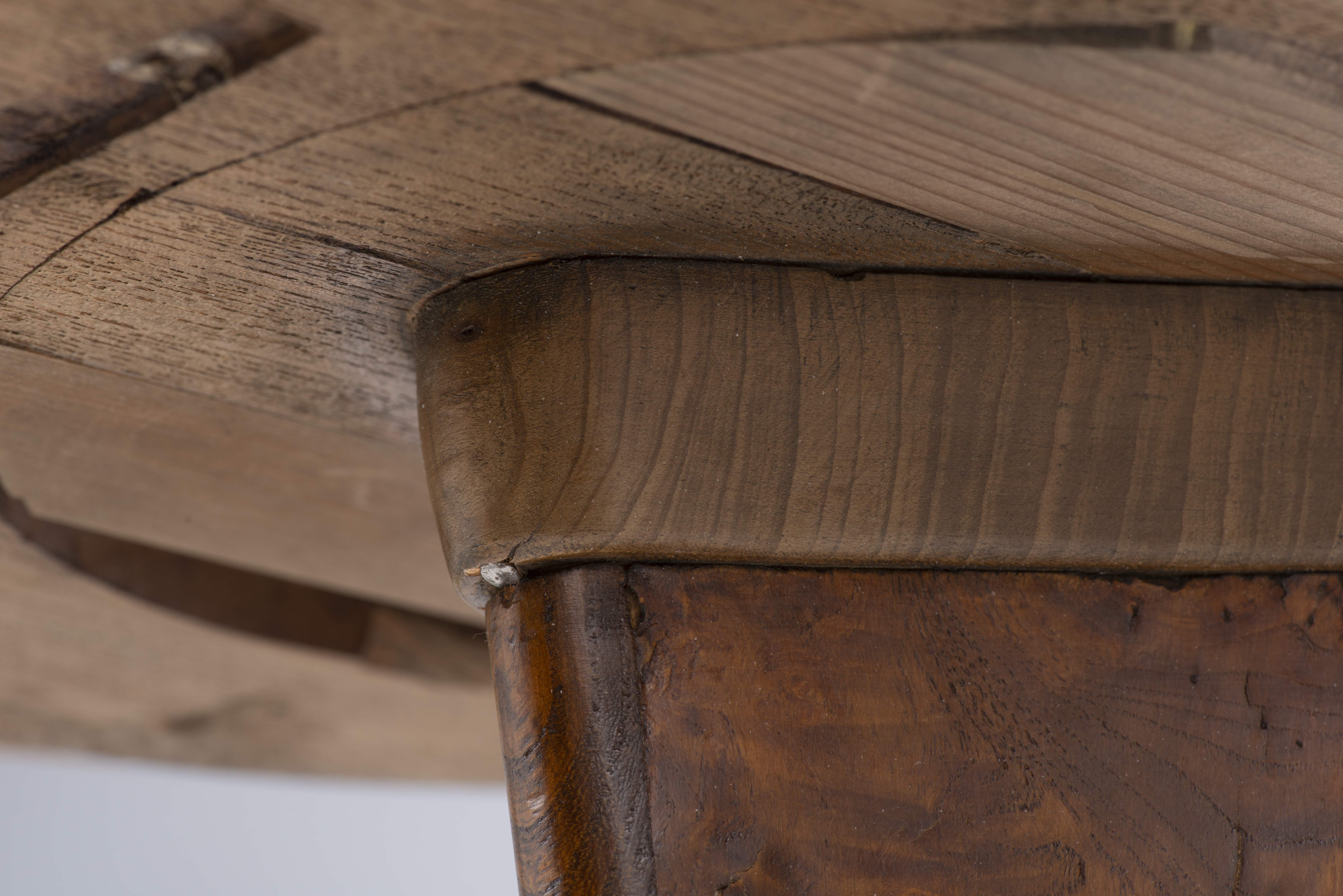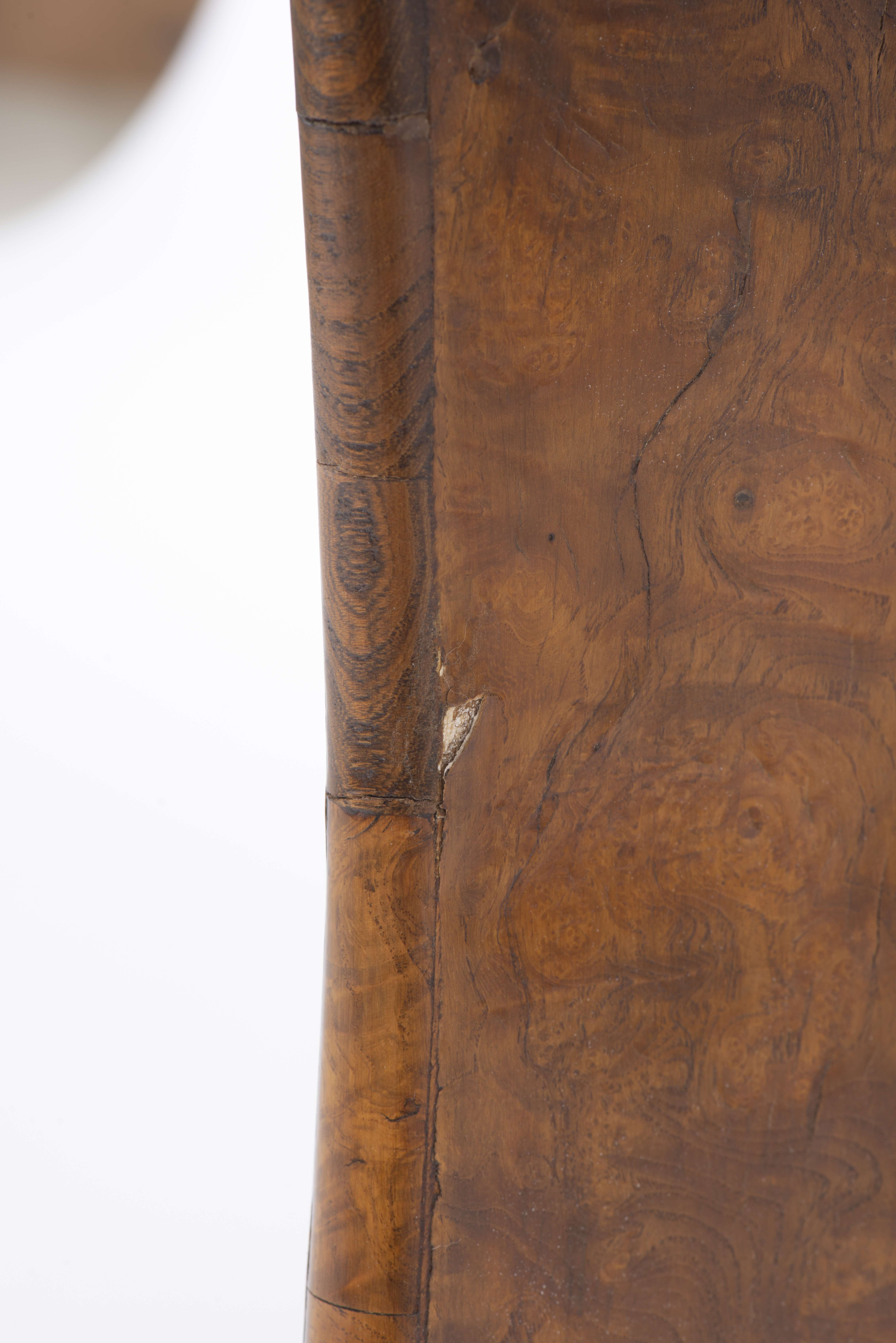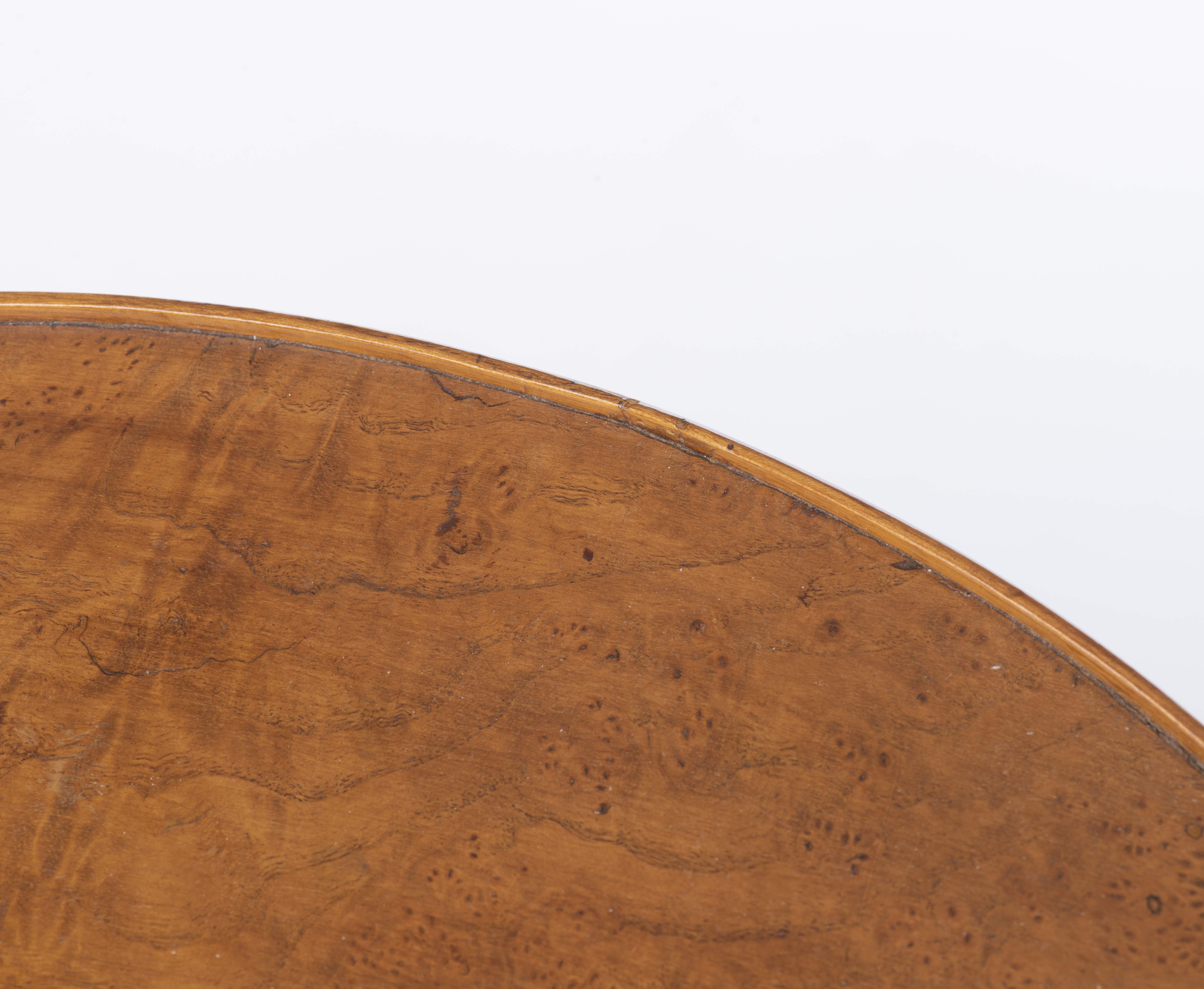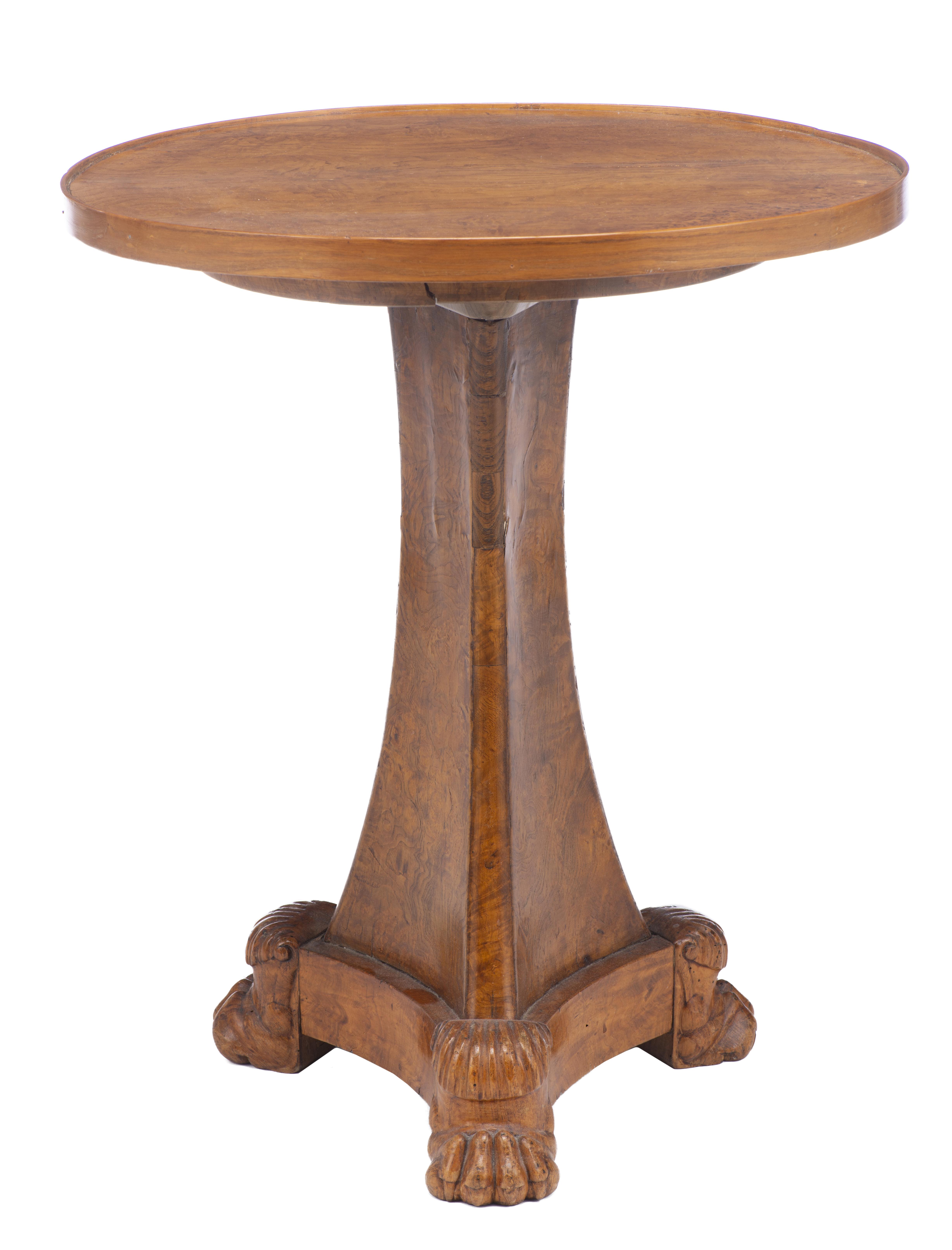 Petit guéridon rond bas tripode Charles X en loupe d'orme à pied central sur trois pieds griffes.