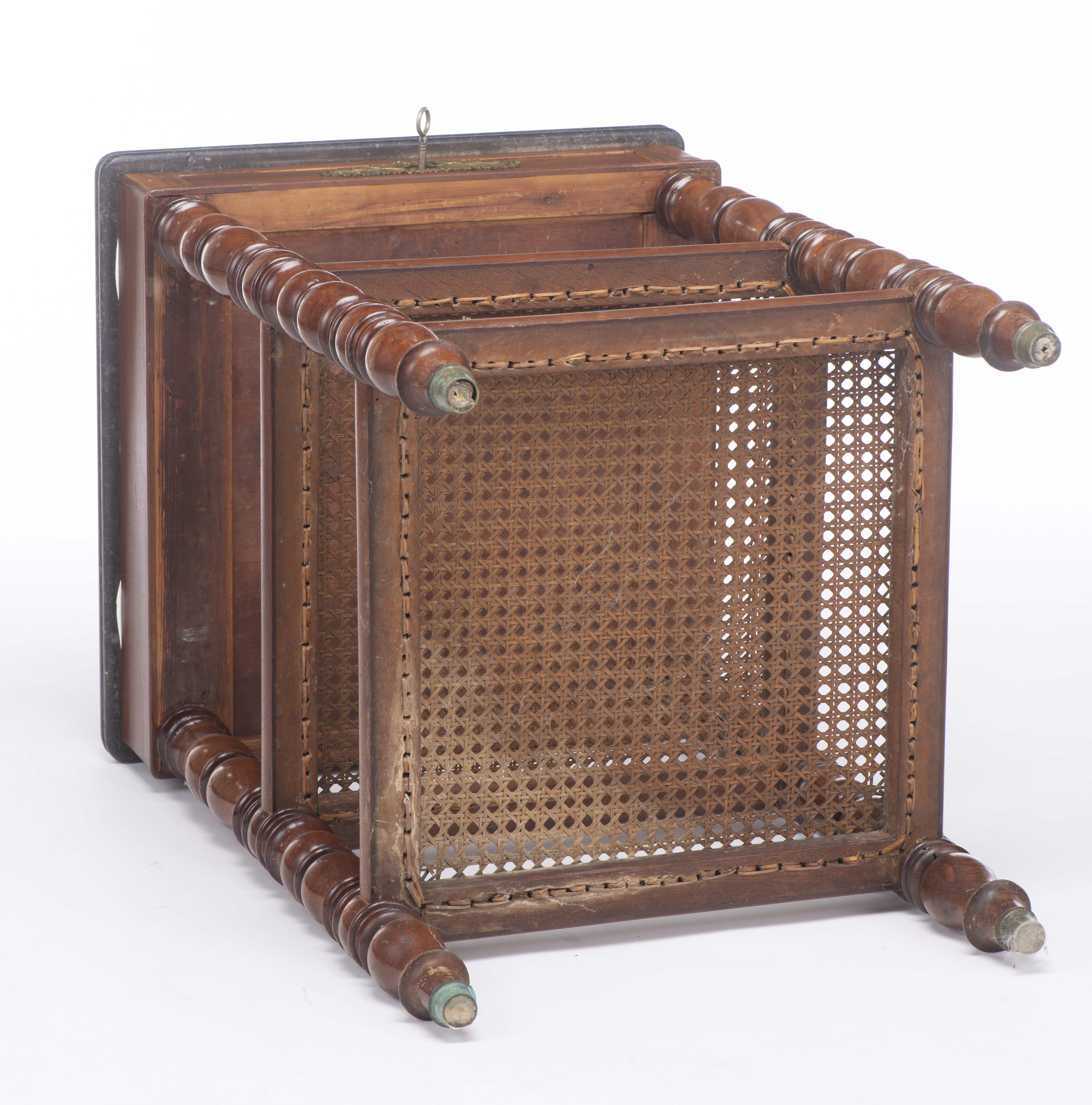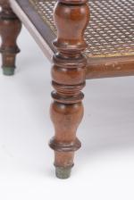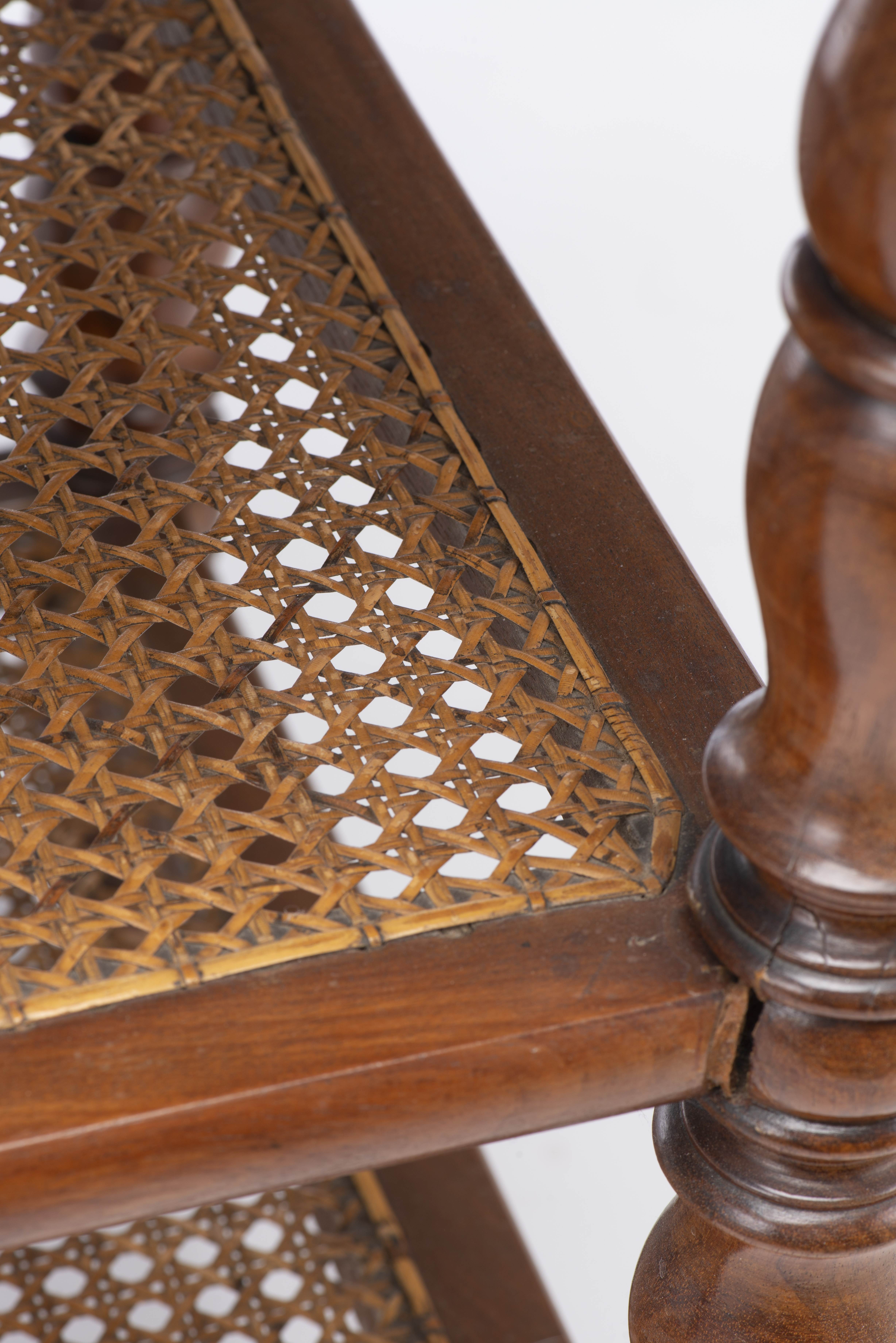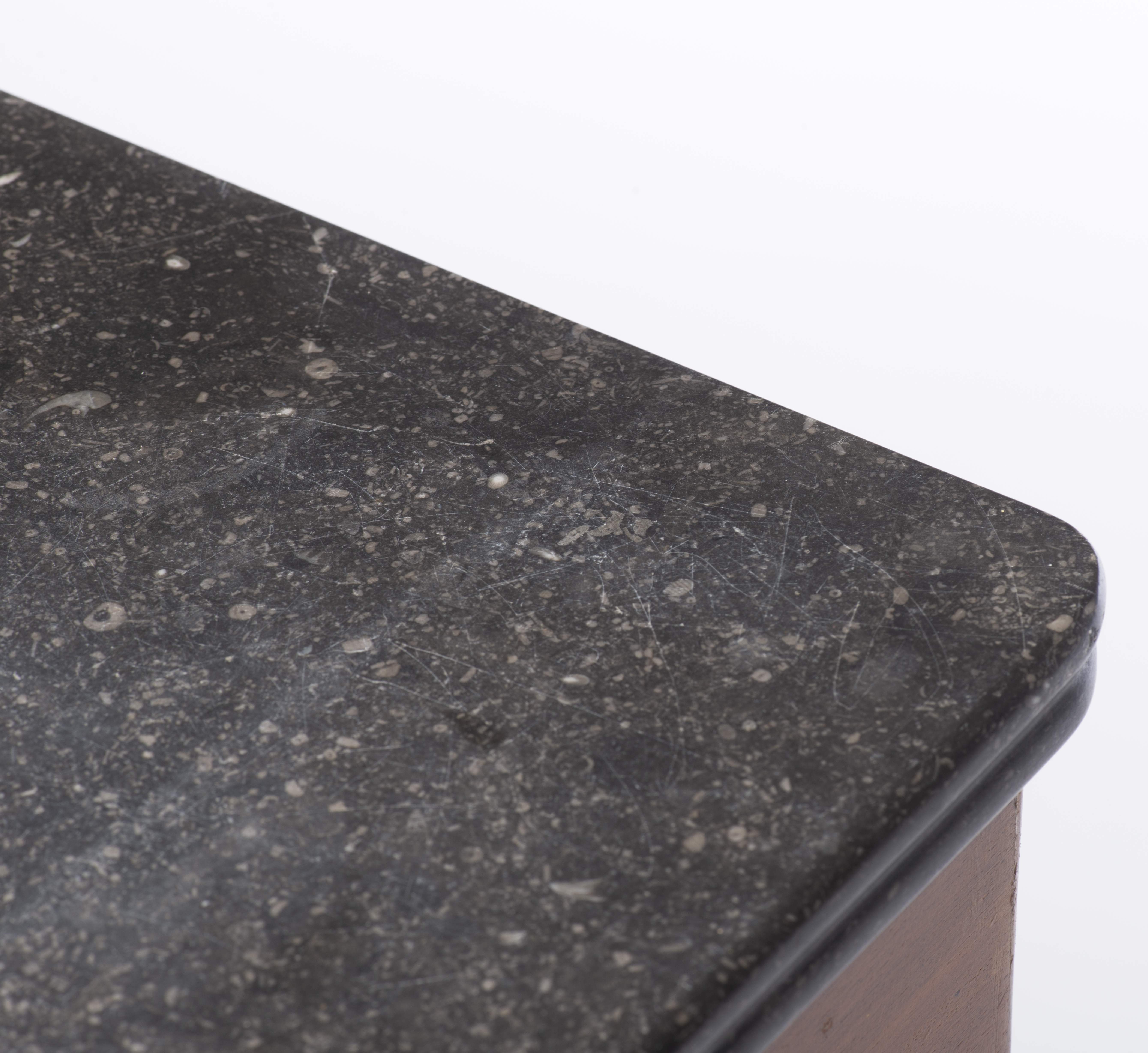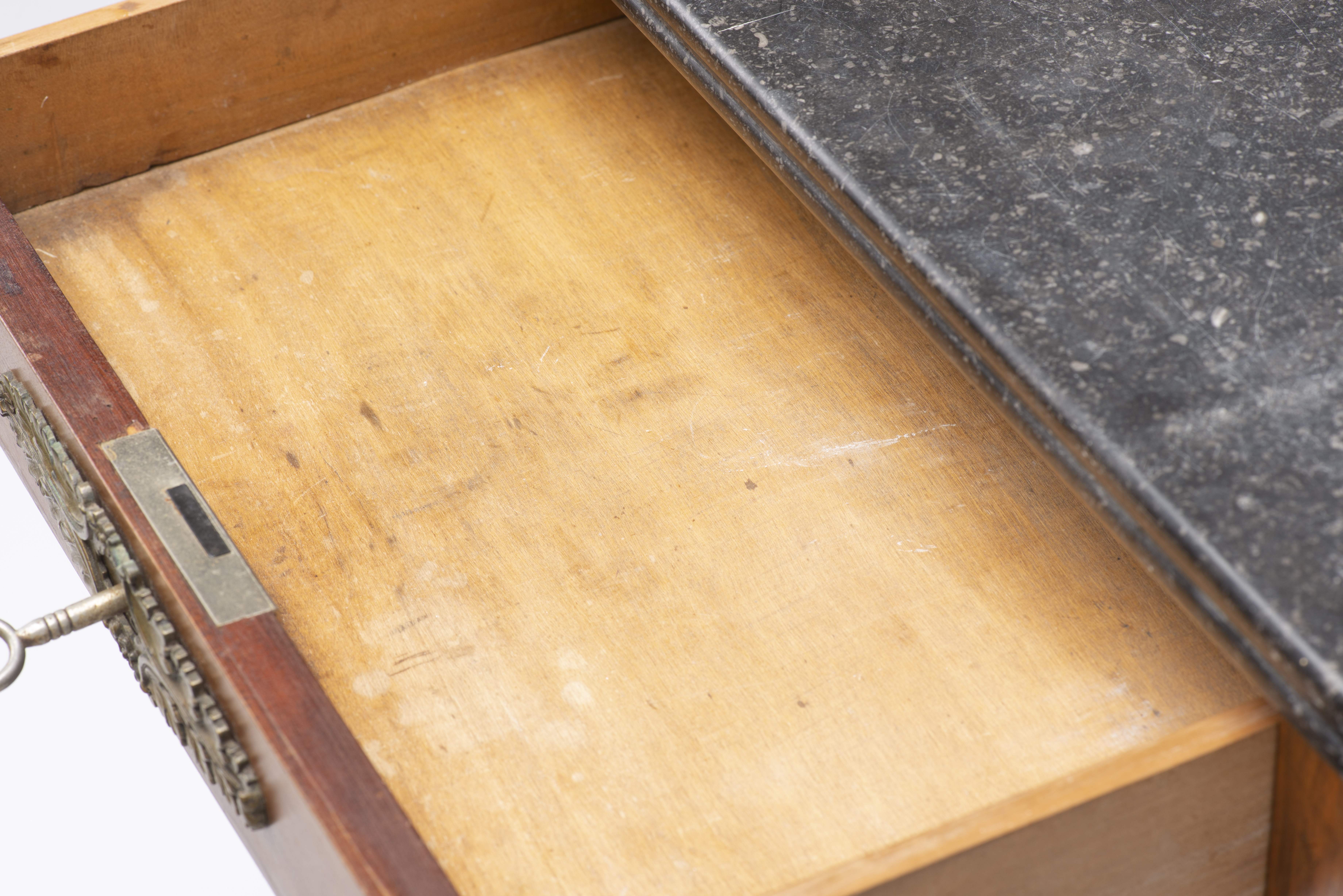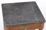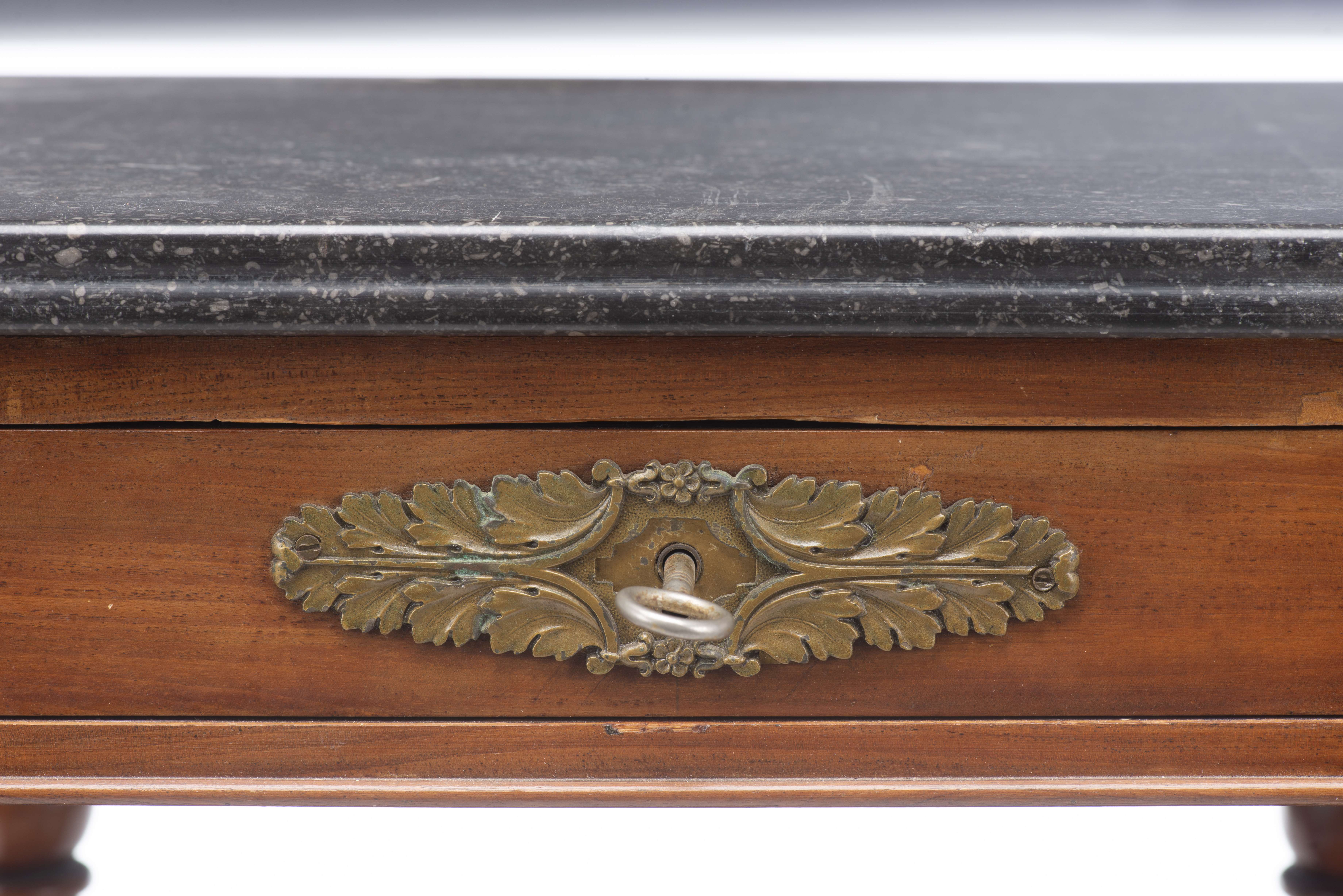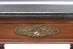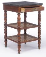 Petit meuble à encas d'époque Charles X en acajou, tiroir dans la ceinture et deux rayonnages cannés, dessus de marbre noir veiné, France, XIXe.