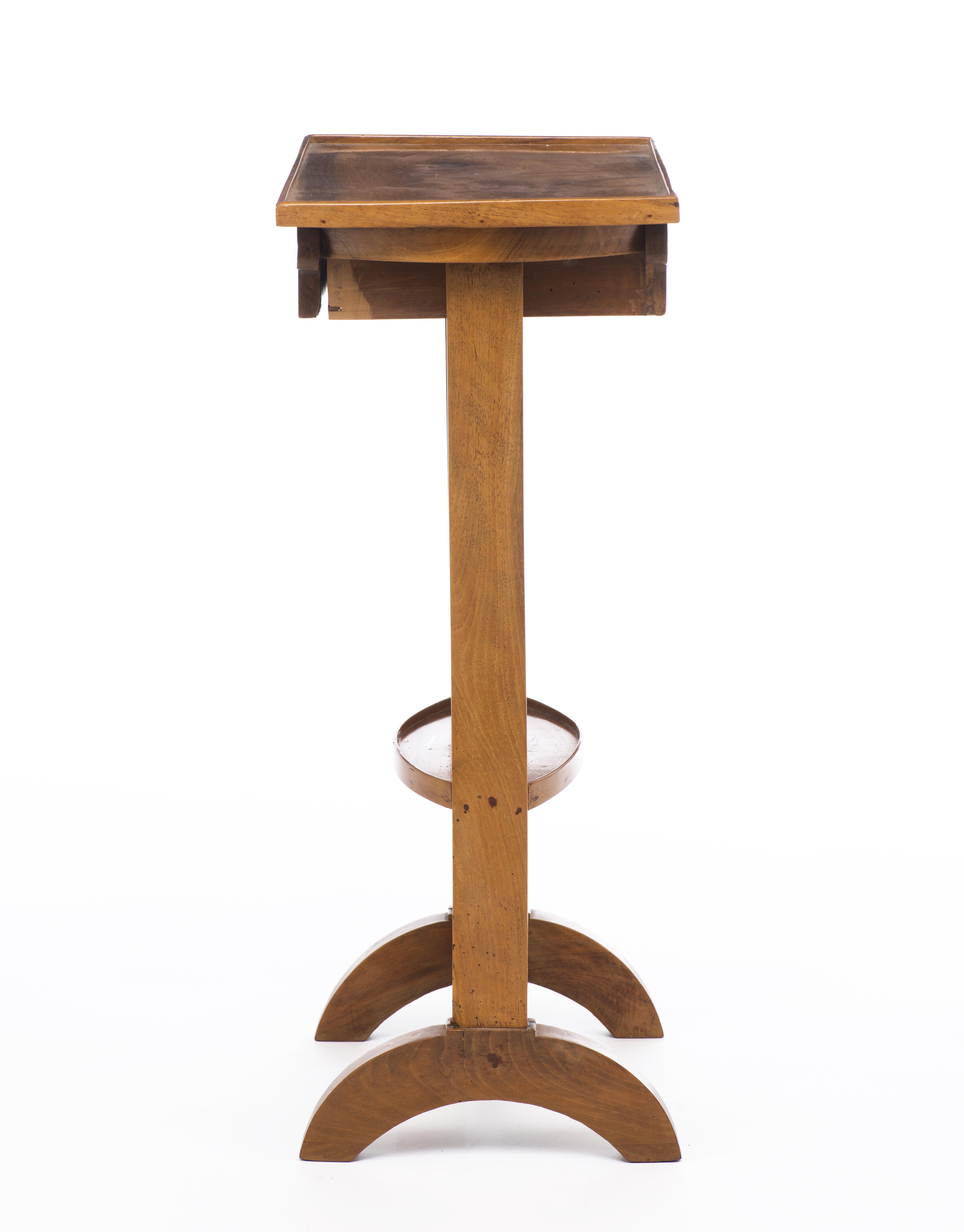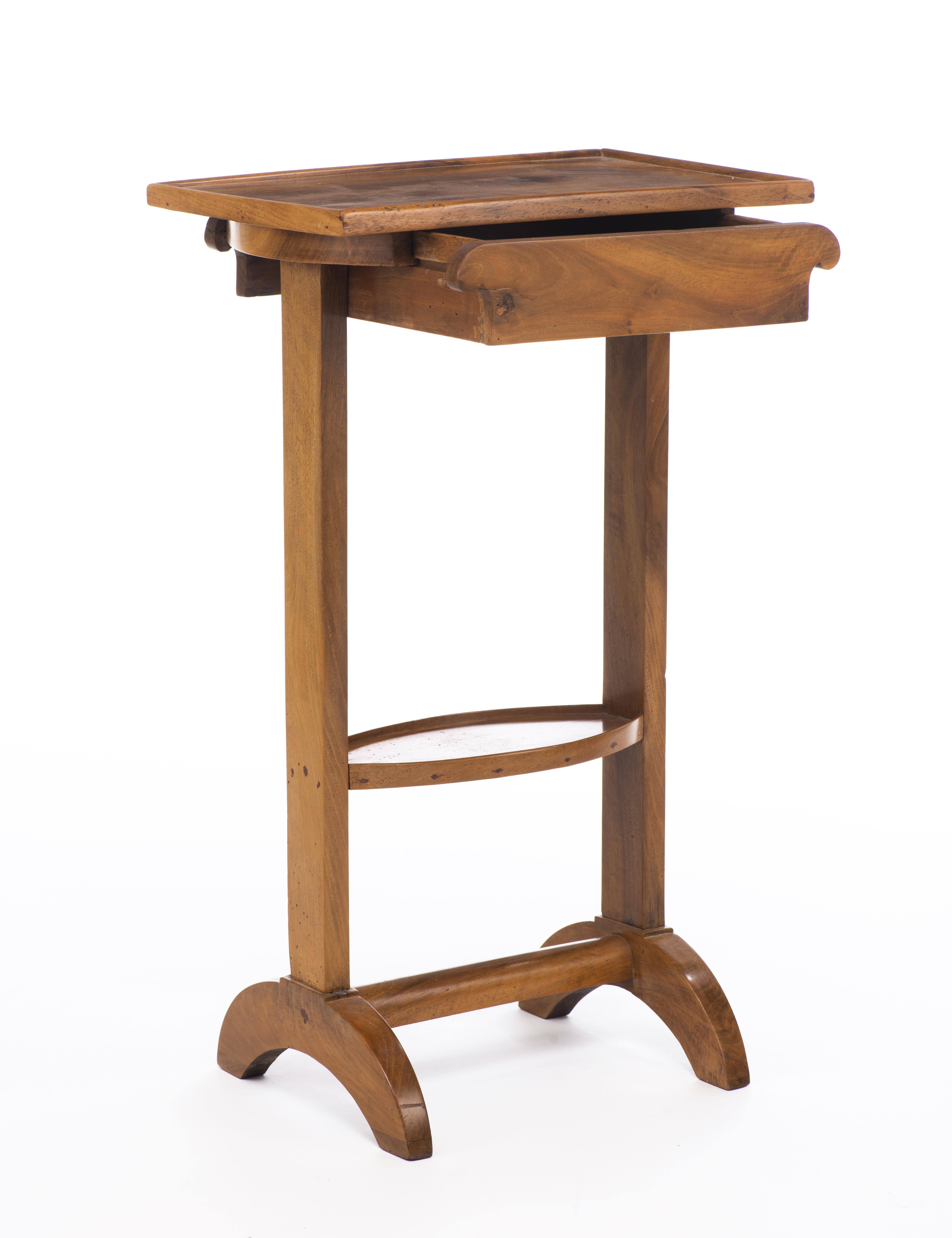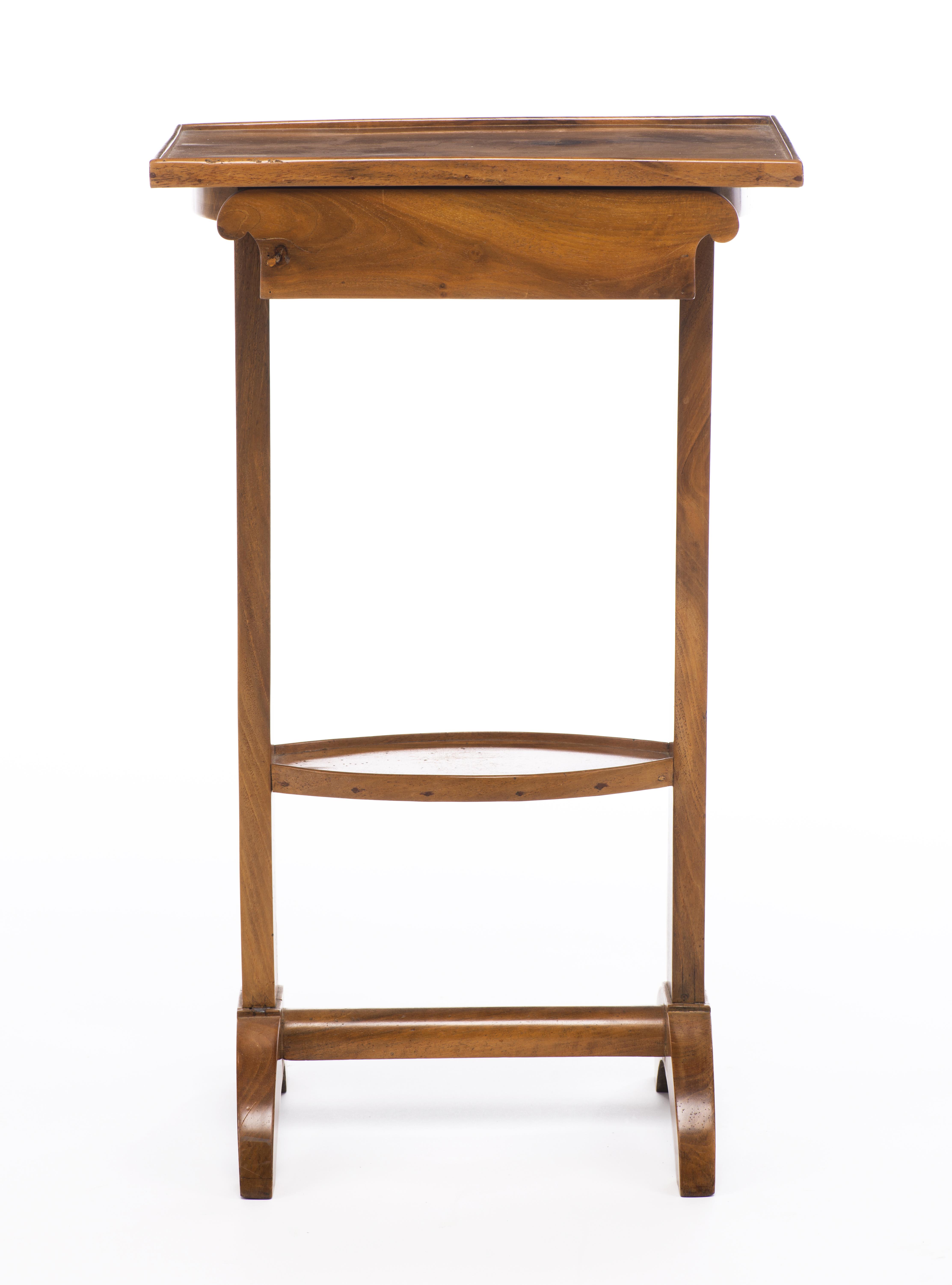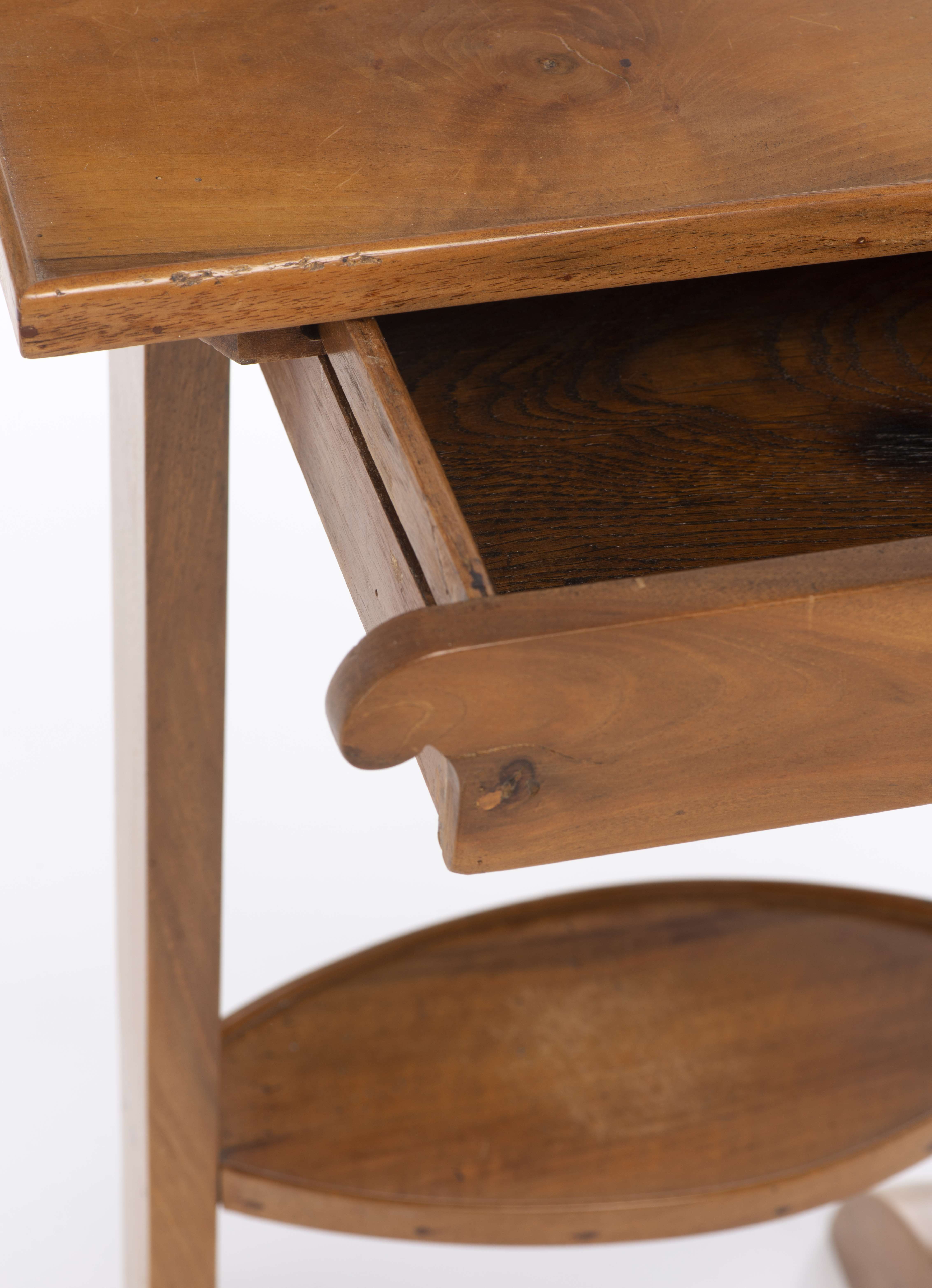 Petit meuble volant en merisier à un tiroir sous le plateau et une tablette ovale intermédiaire, intérieur du tiroir en chêne. Epoque Biedermeier.