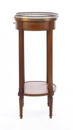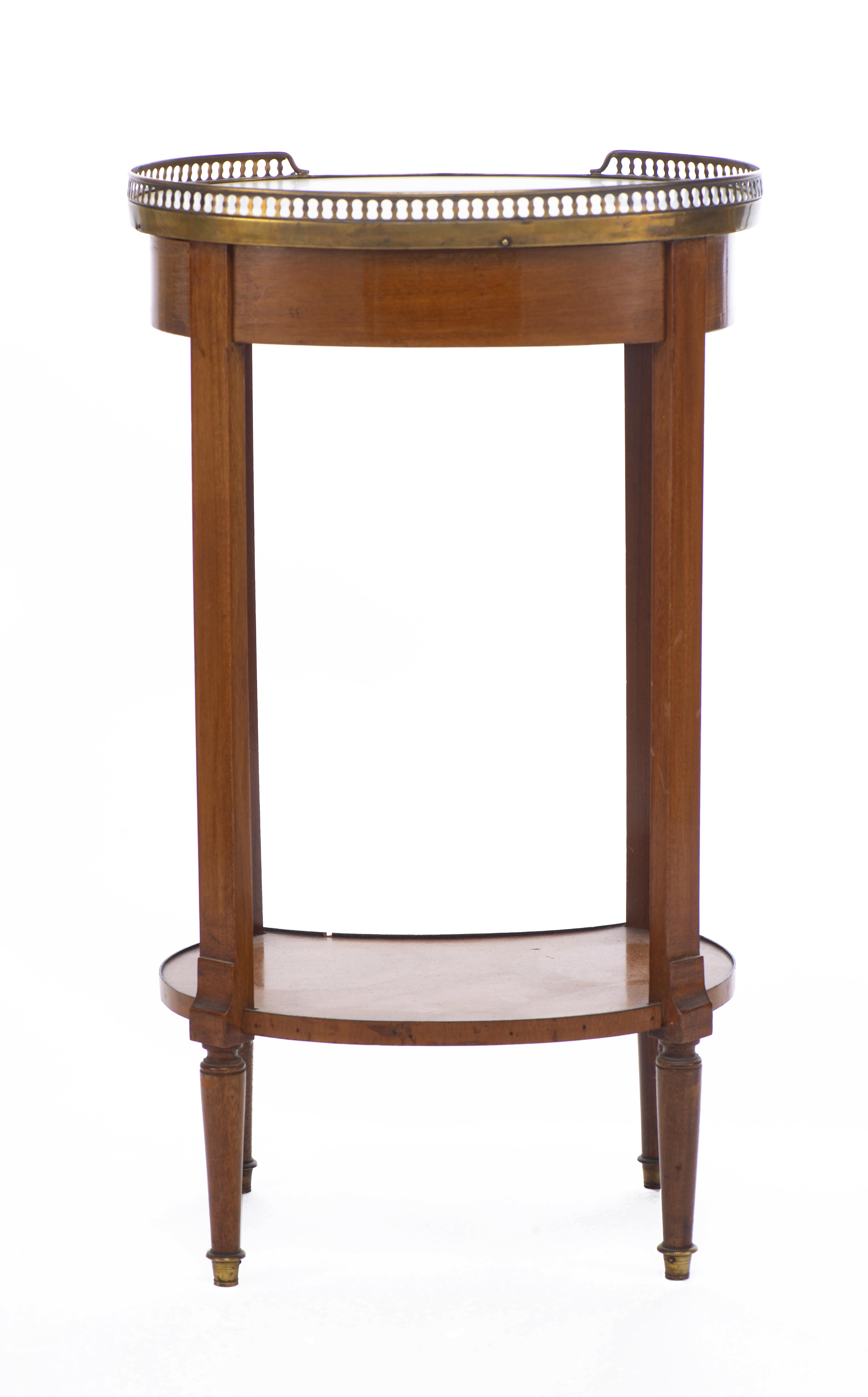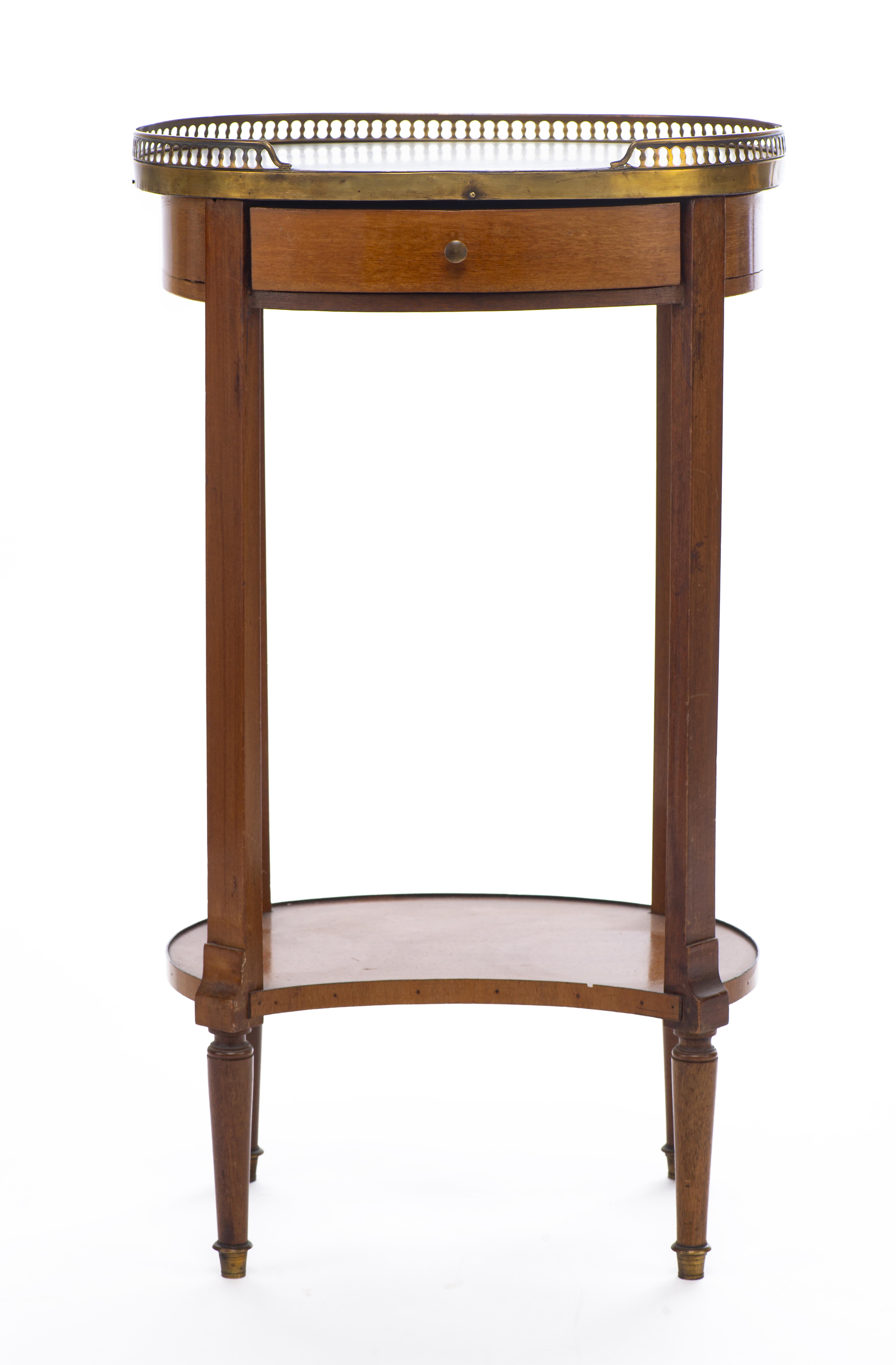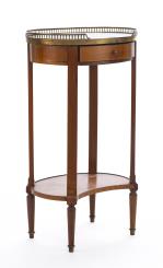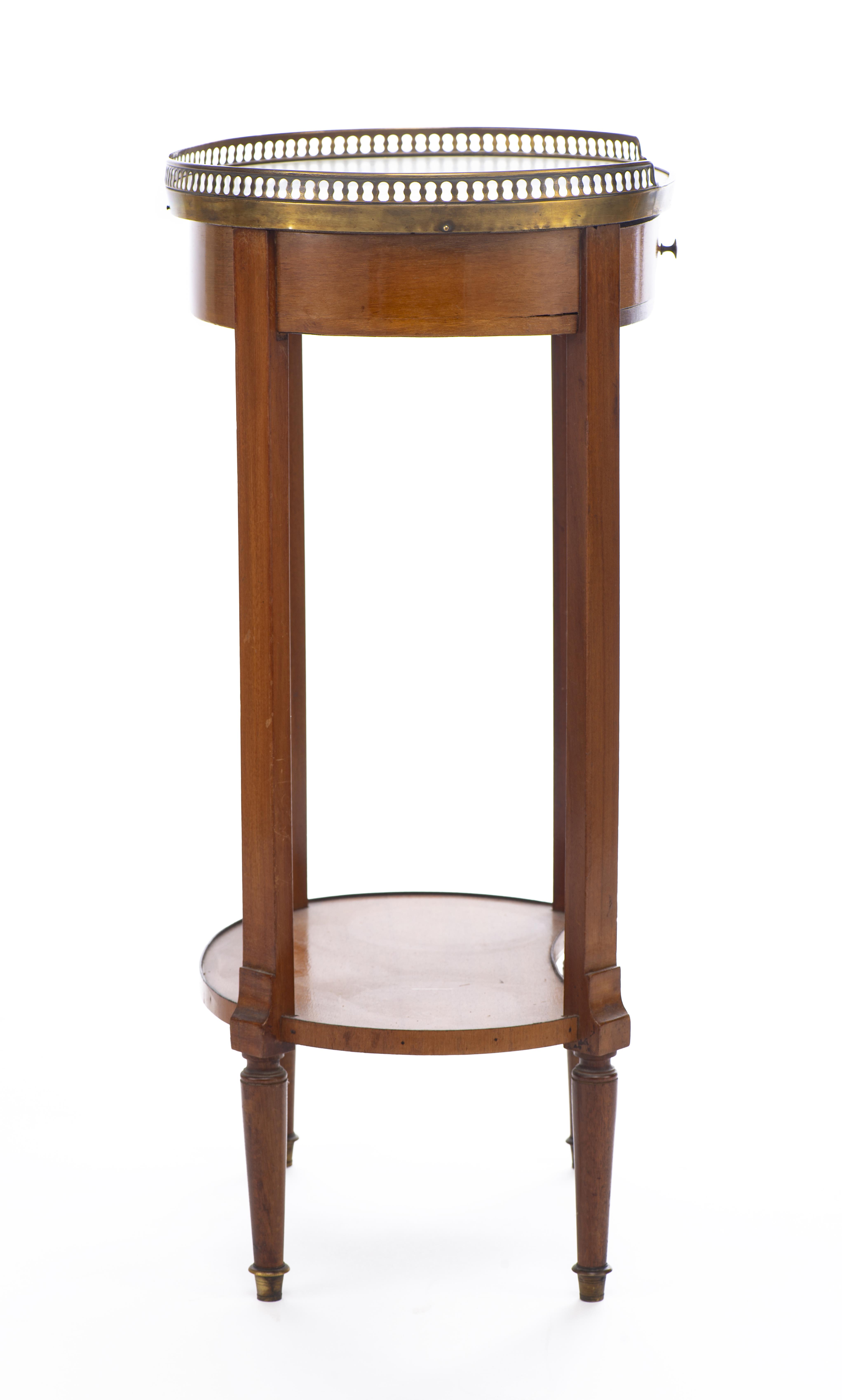 Petit meuble volant à un plateau en marbre blanc et à galerie de laiton ajouré de style Directoire à un tiroir dans le bandeau et plateau inférieur à rebord rapporté.