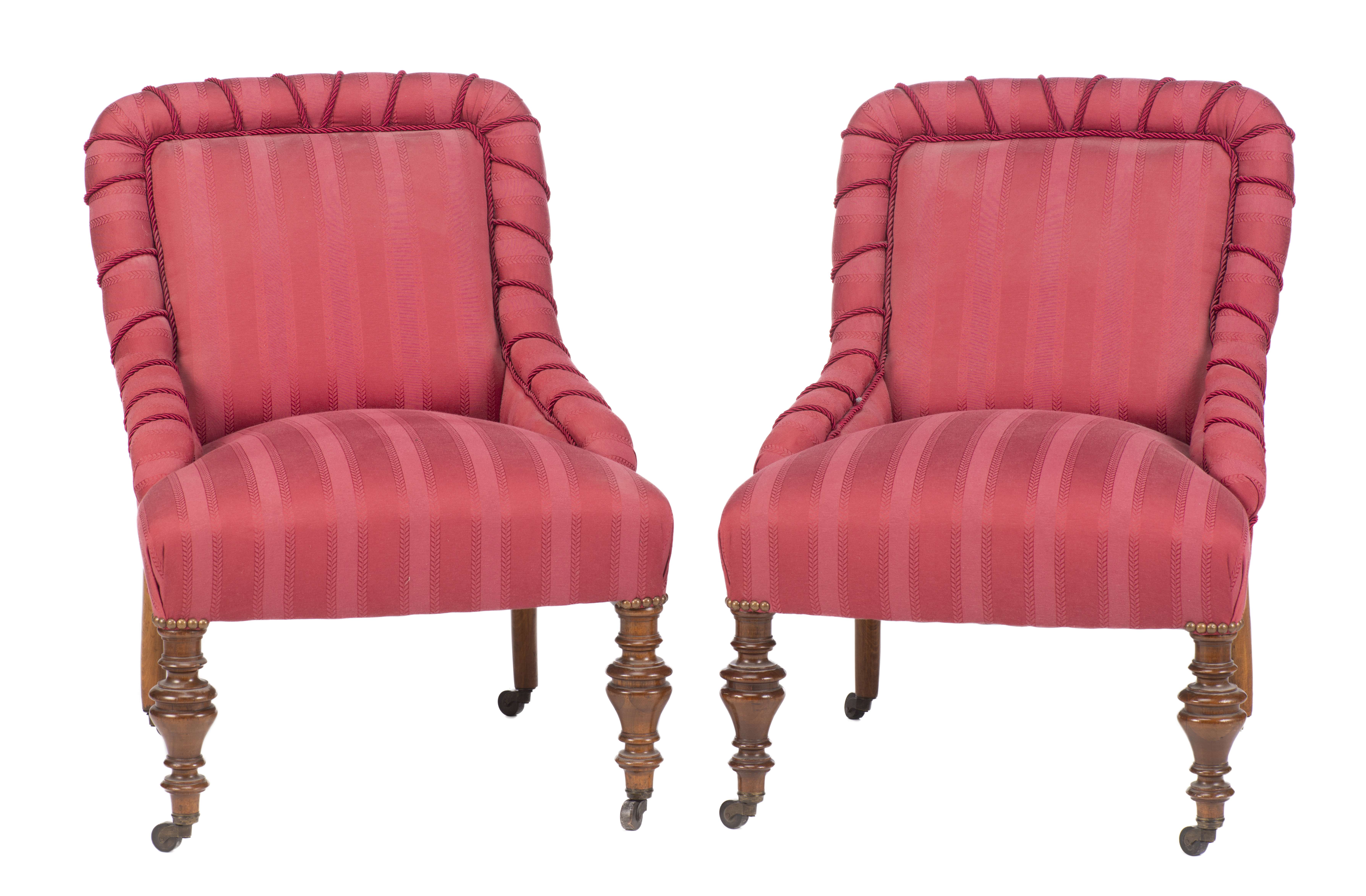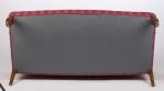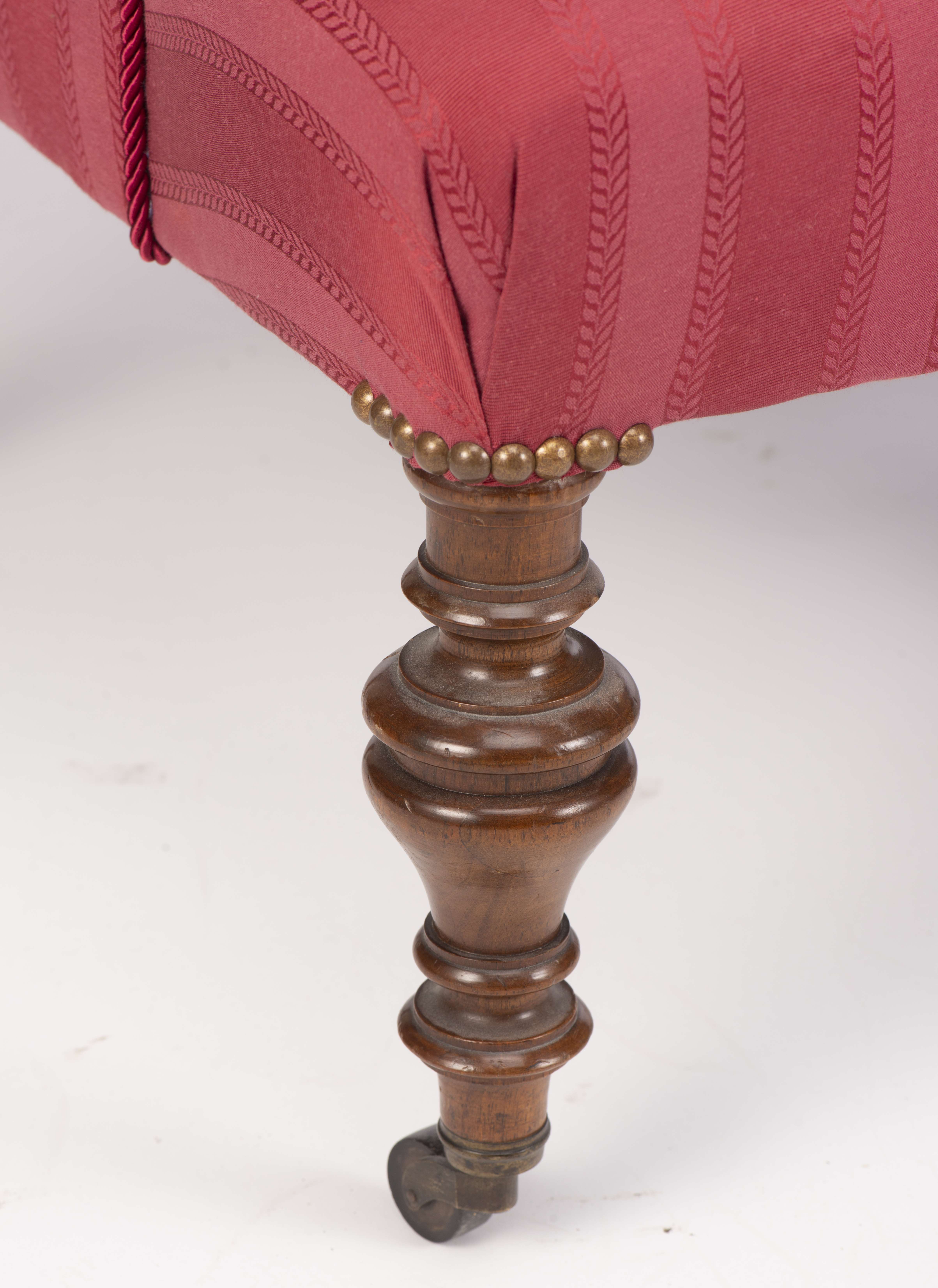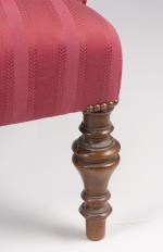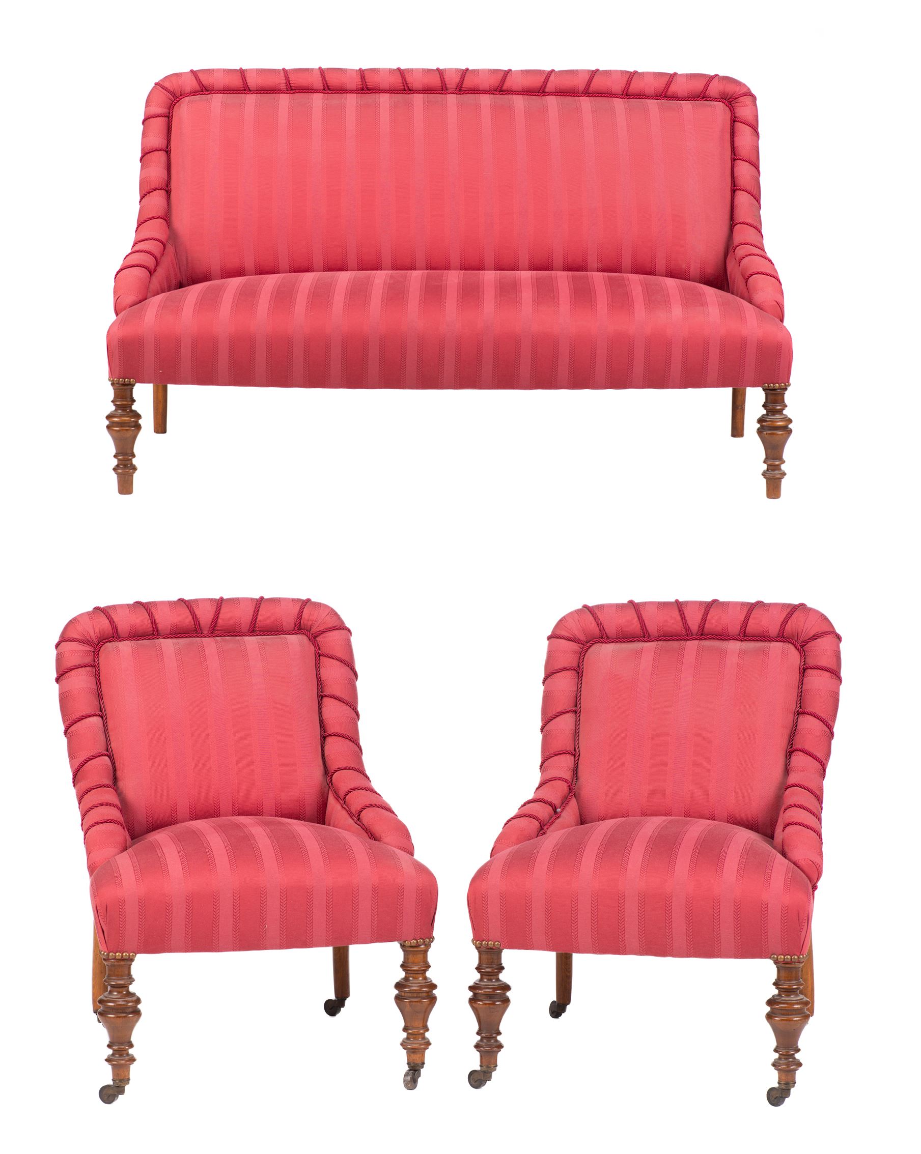 Petit salon comprenant un canapé et 2 fauteuils d'époque victorienne en acajou recouverts de tissu rouge, pieds avant de forme toupille à roulettes.