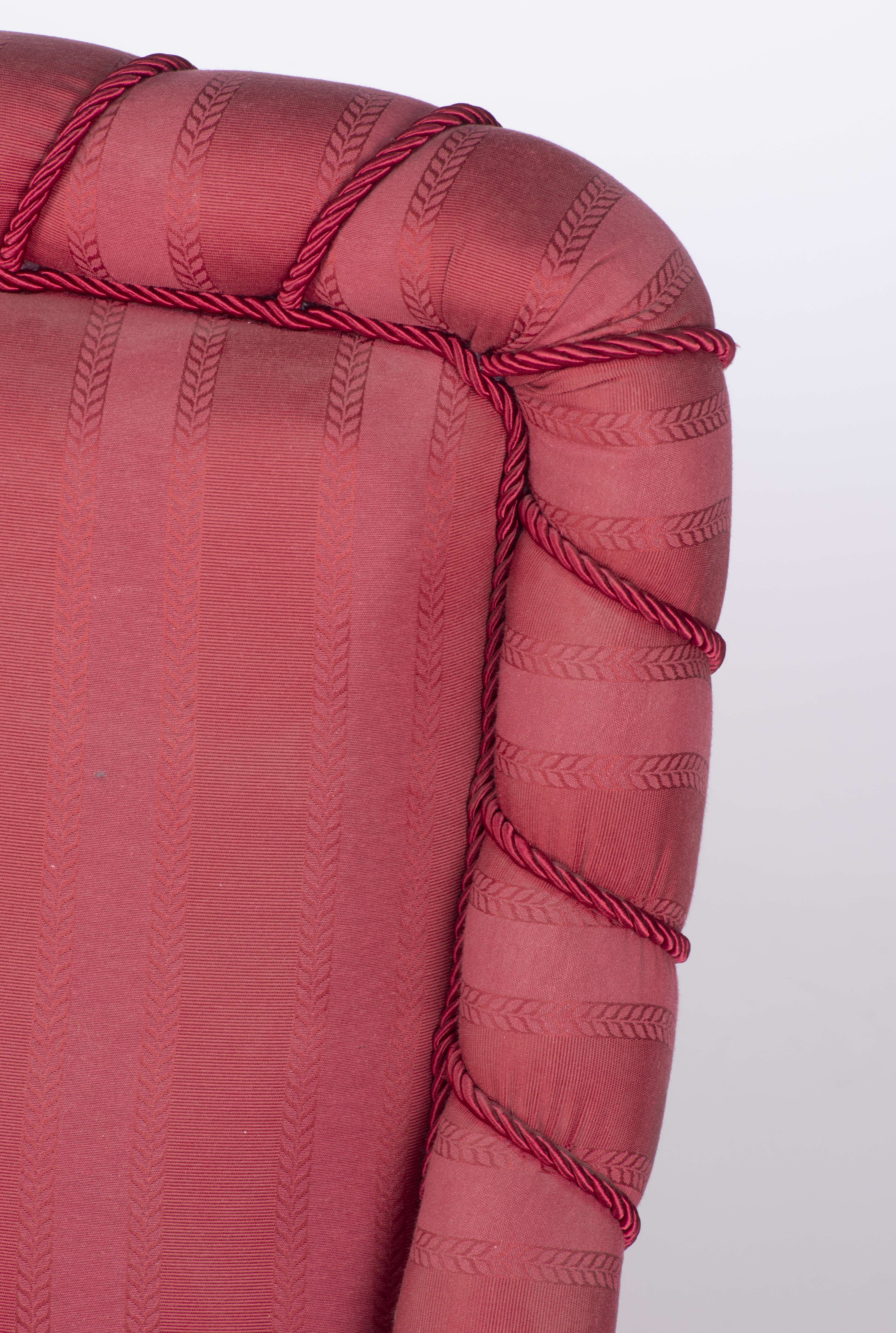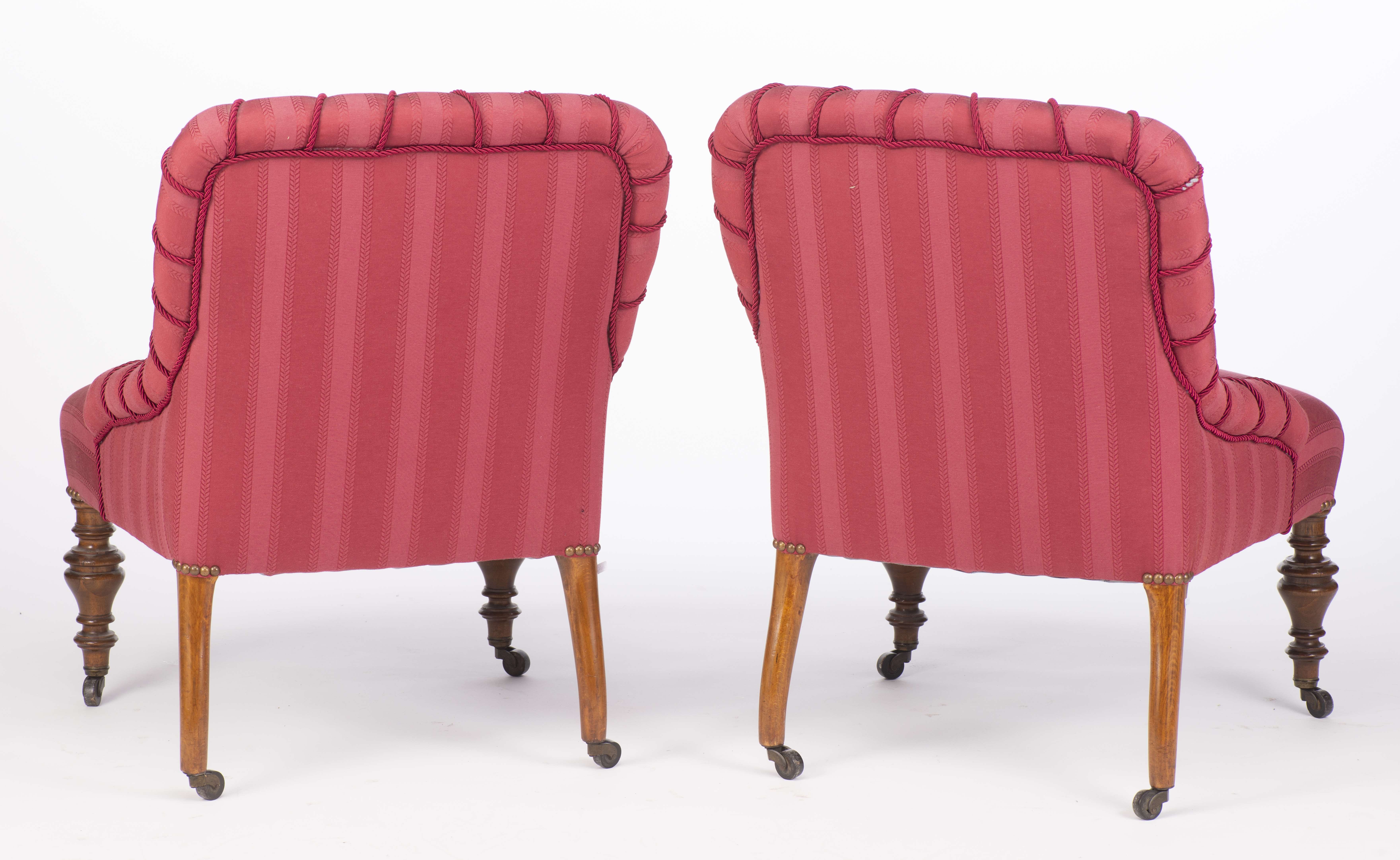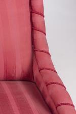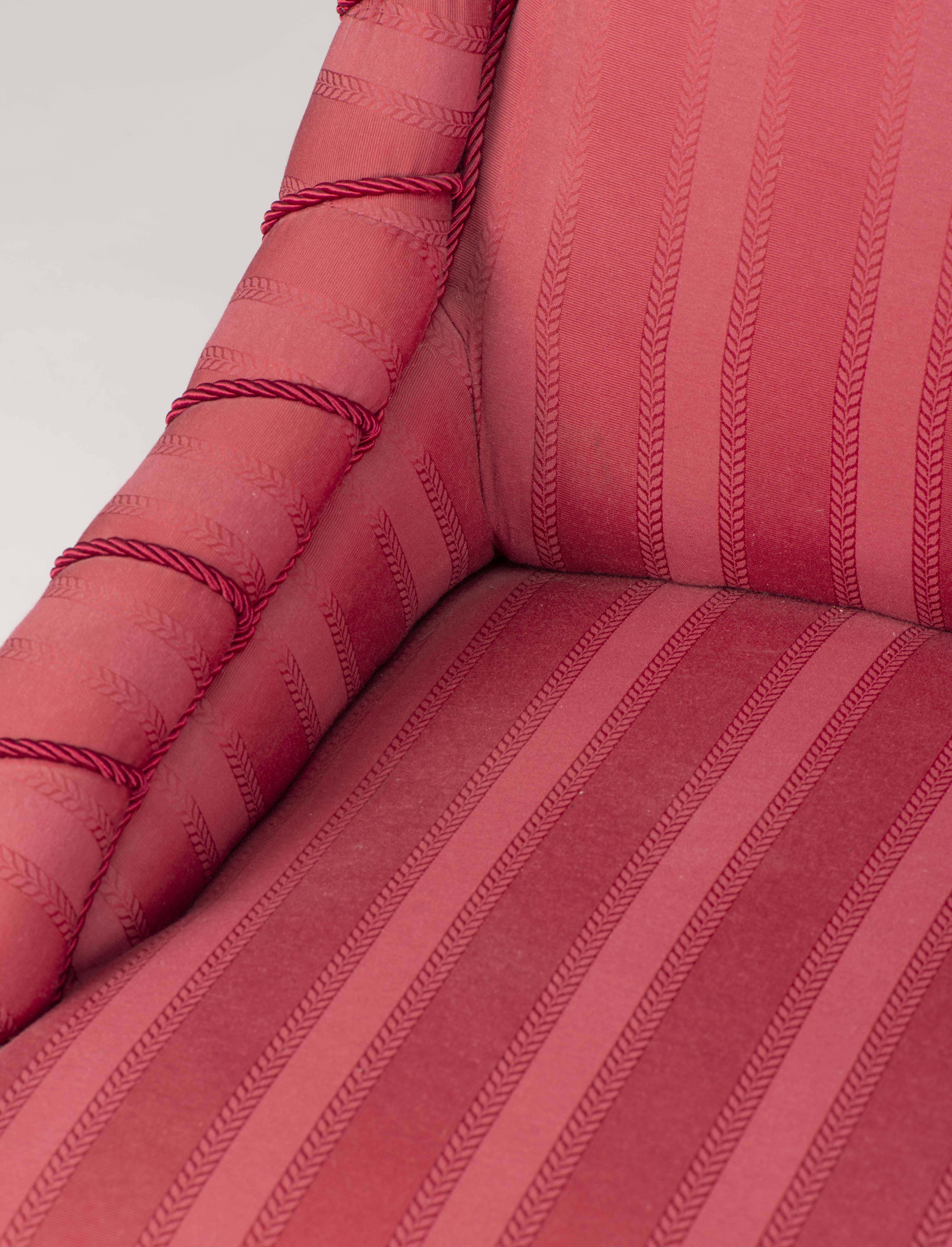 Petit salon comprenant un canapé et 2 fauteuils d'époque victorienne en acajou recouverts de tissu rouge, pieds avant de forme toupille à roulettes.