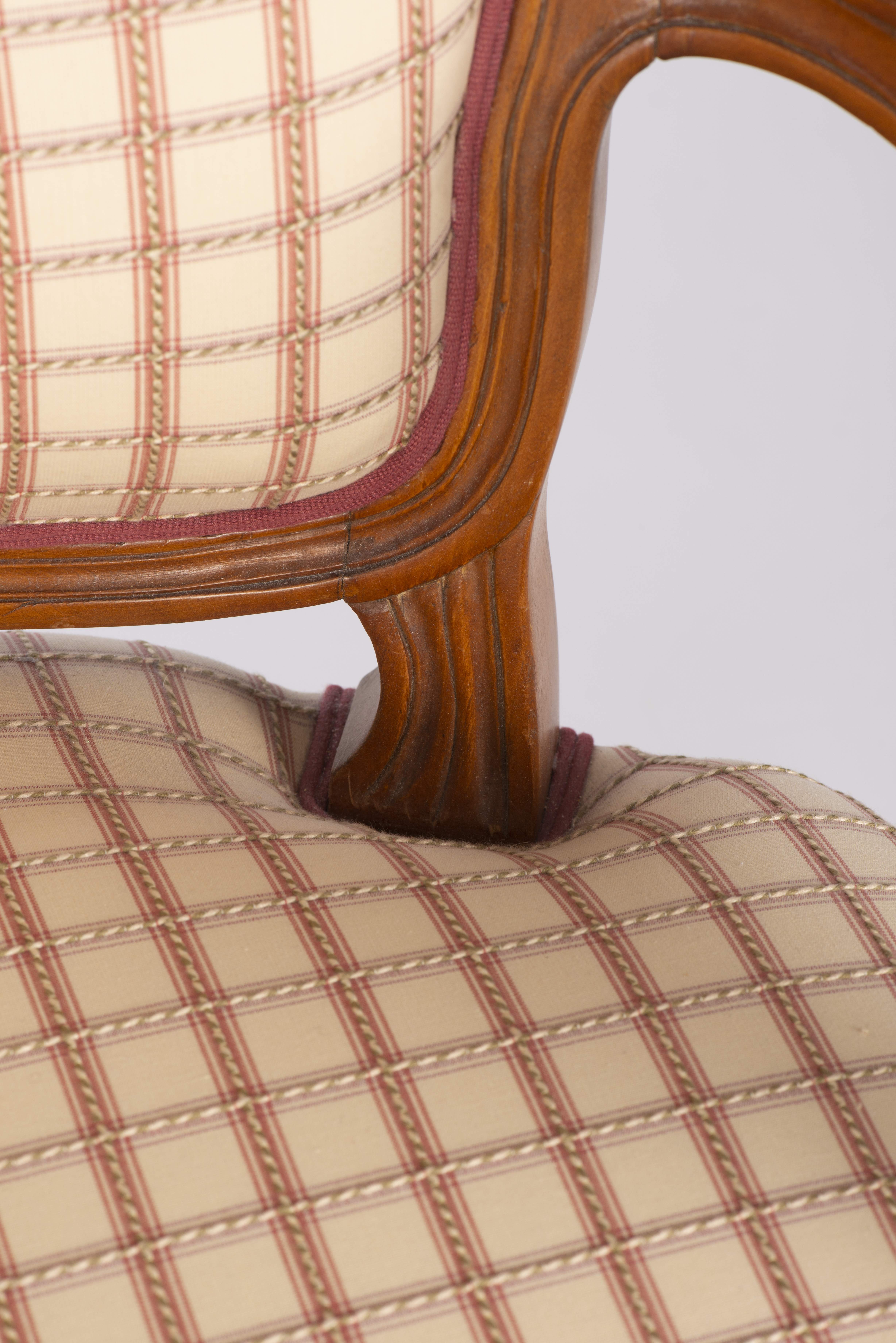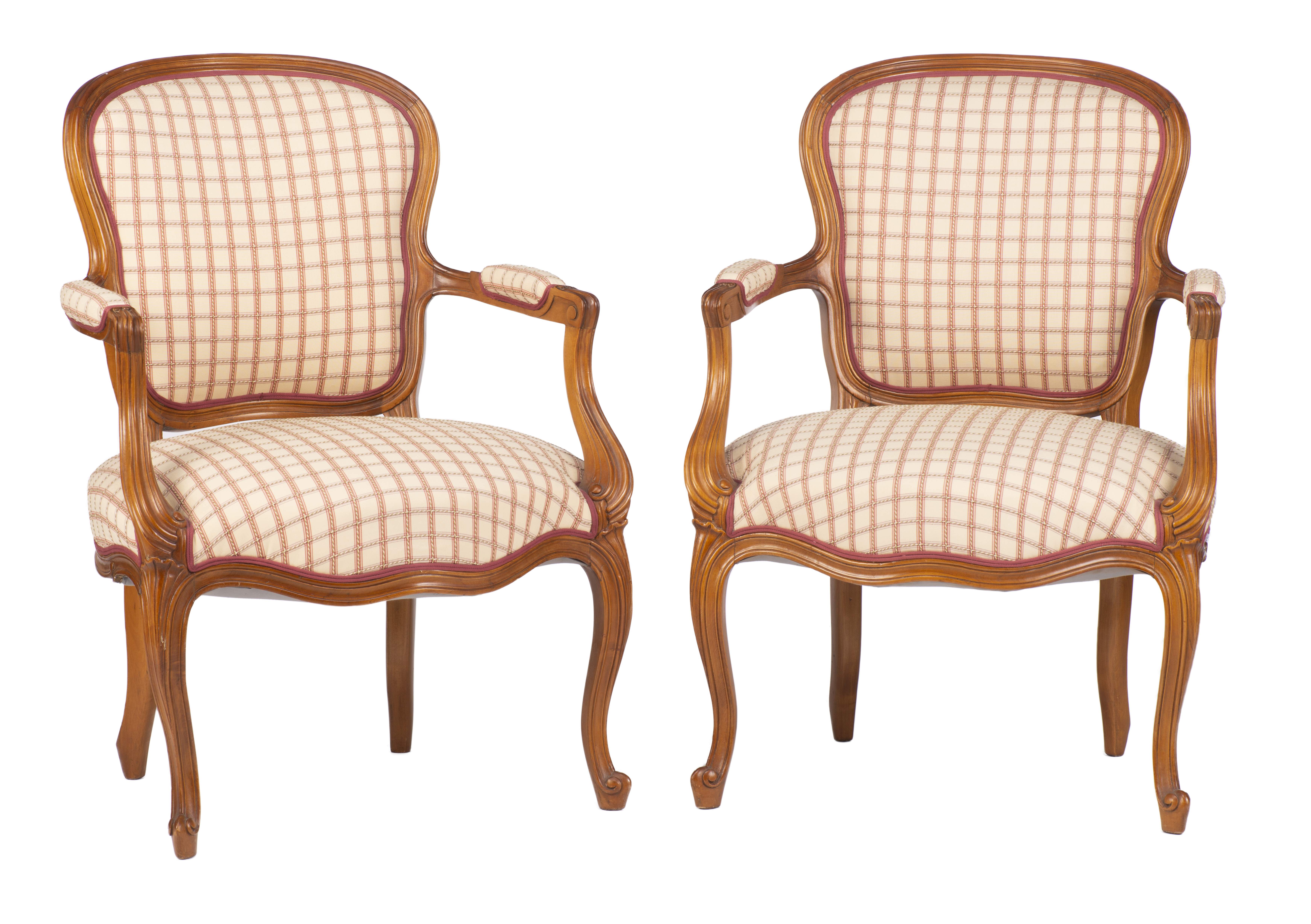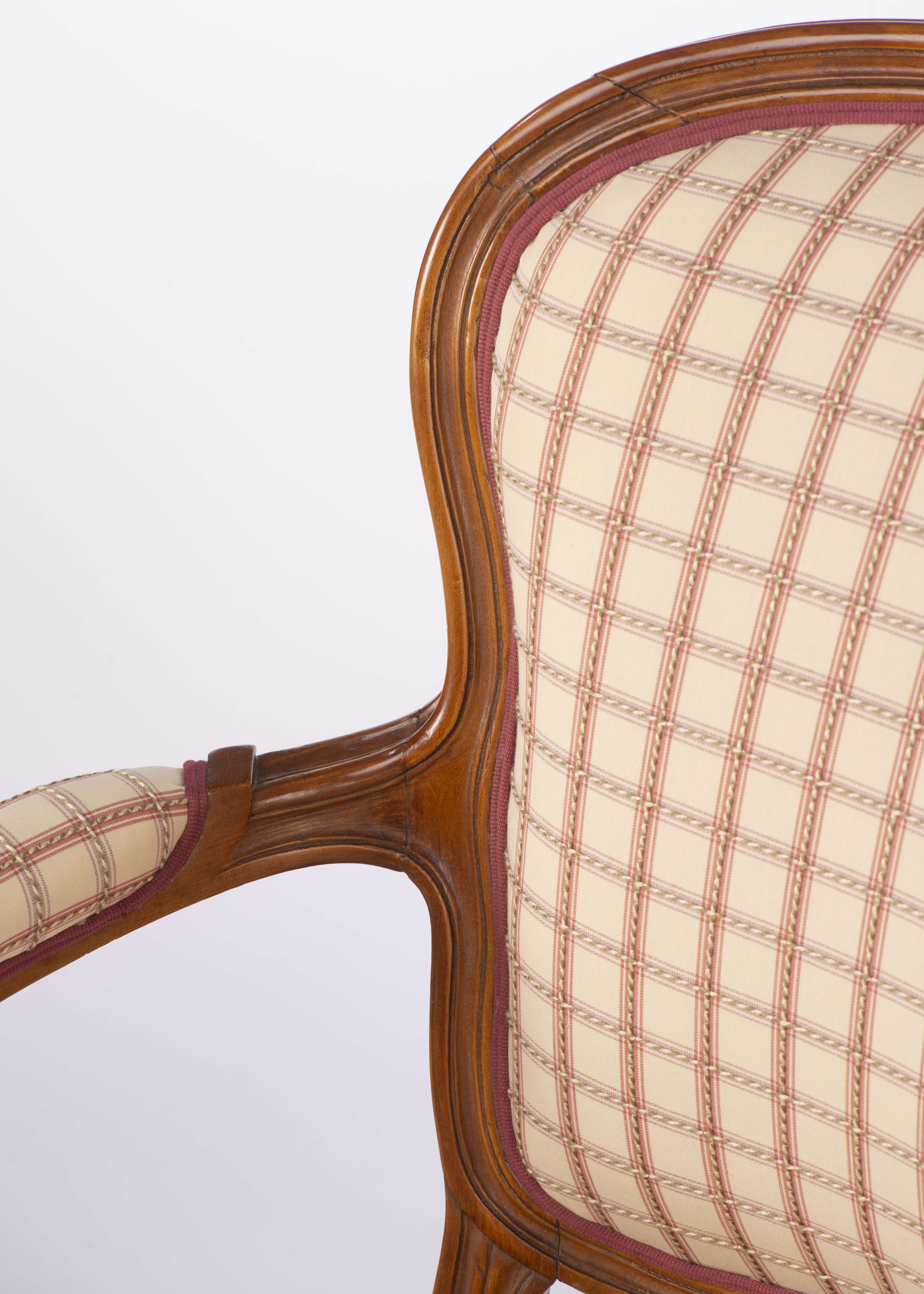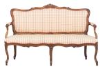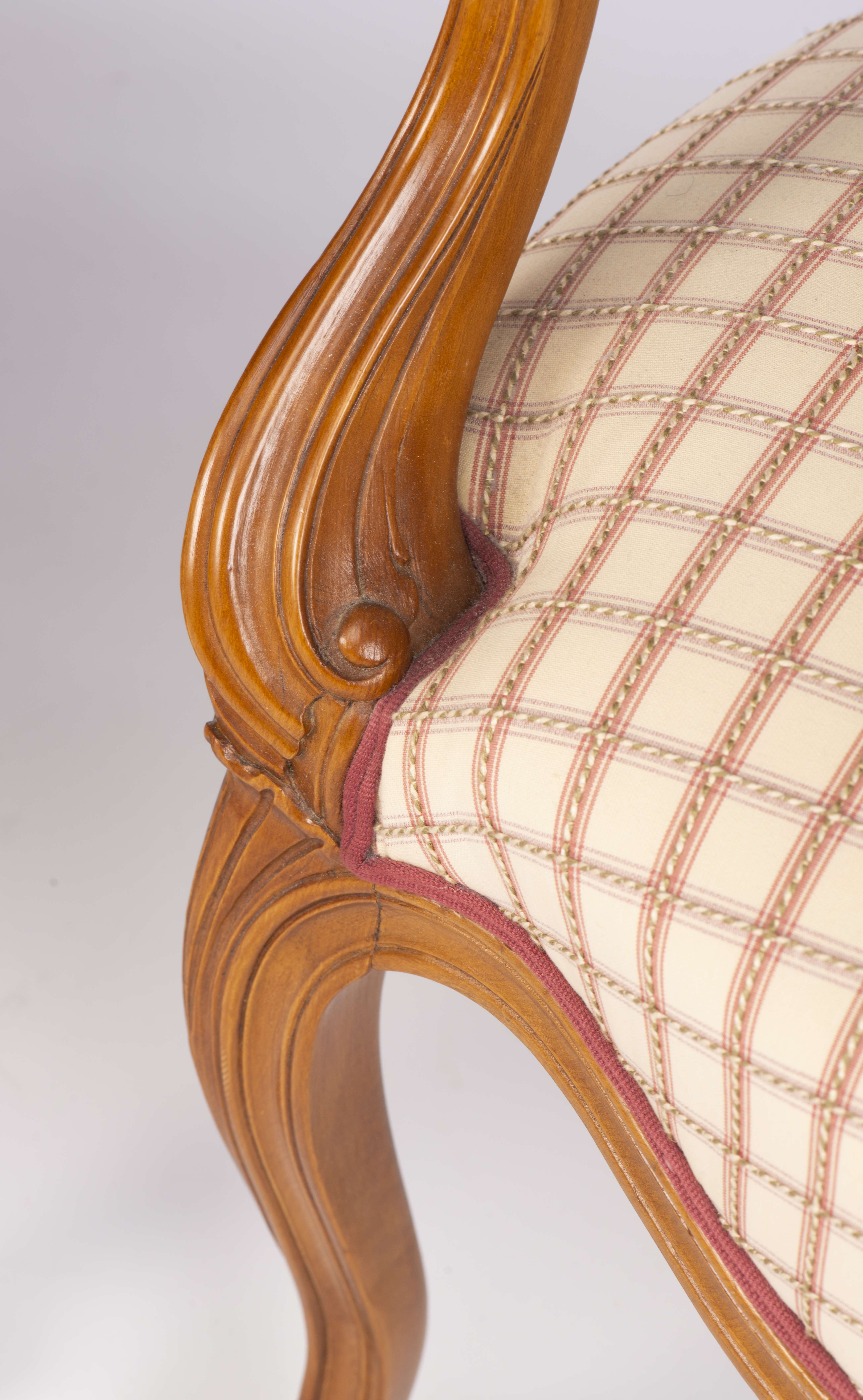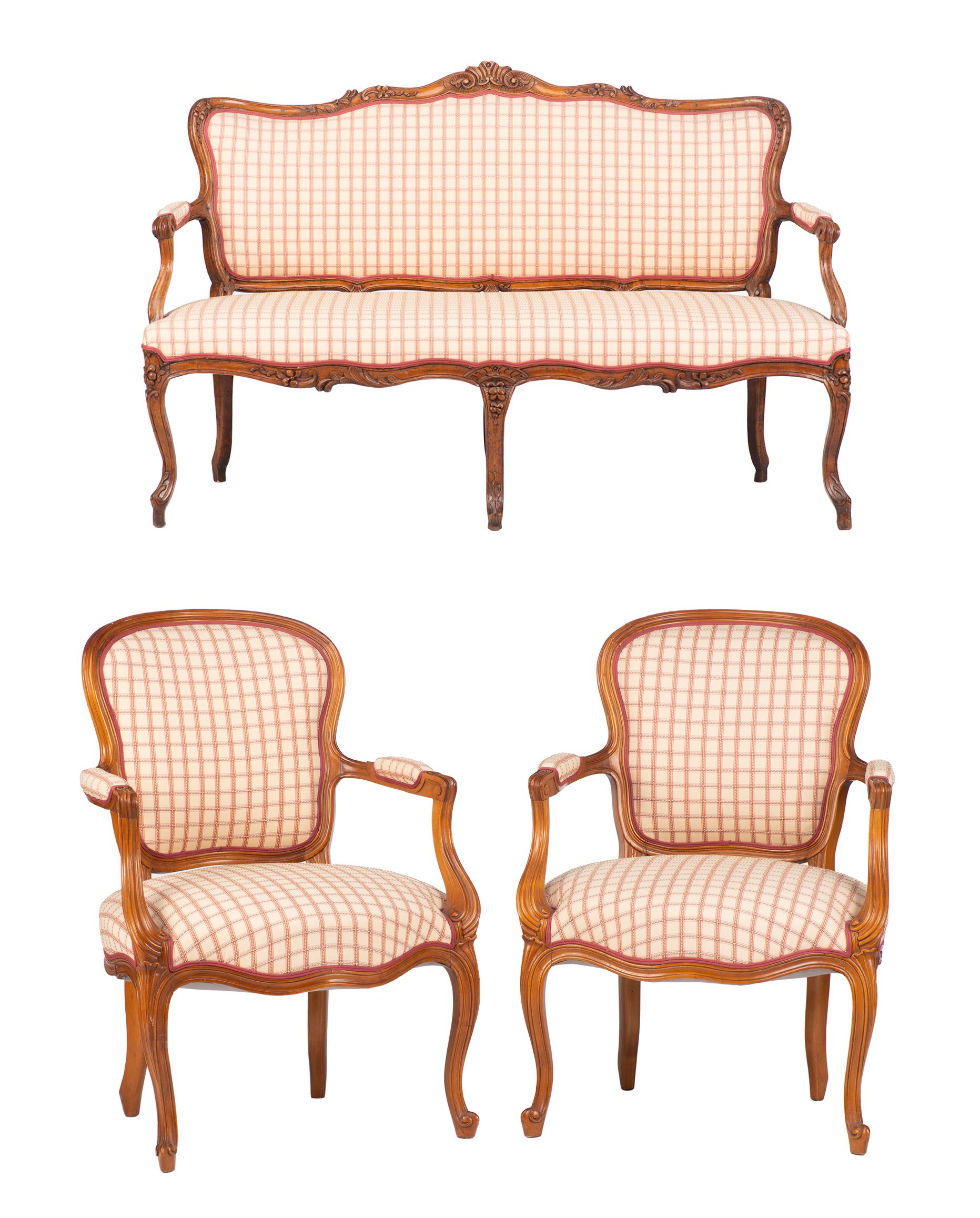 Petit salon comprenant un canapé et 2 fauteuils de style Louis XV recouverts de tissu blanc à carreaux