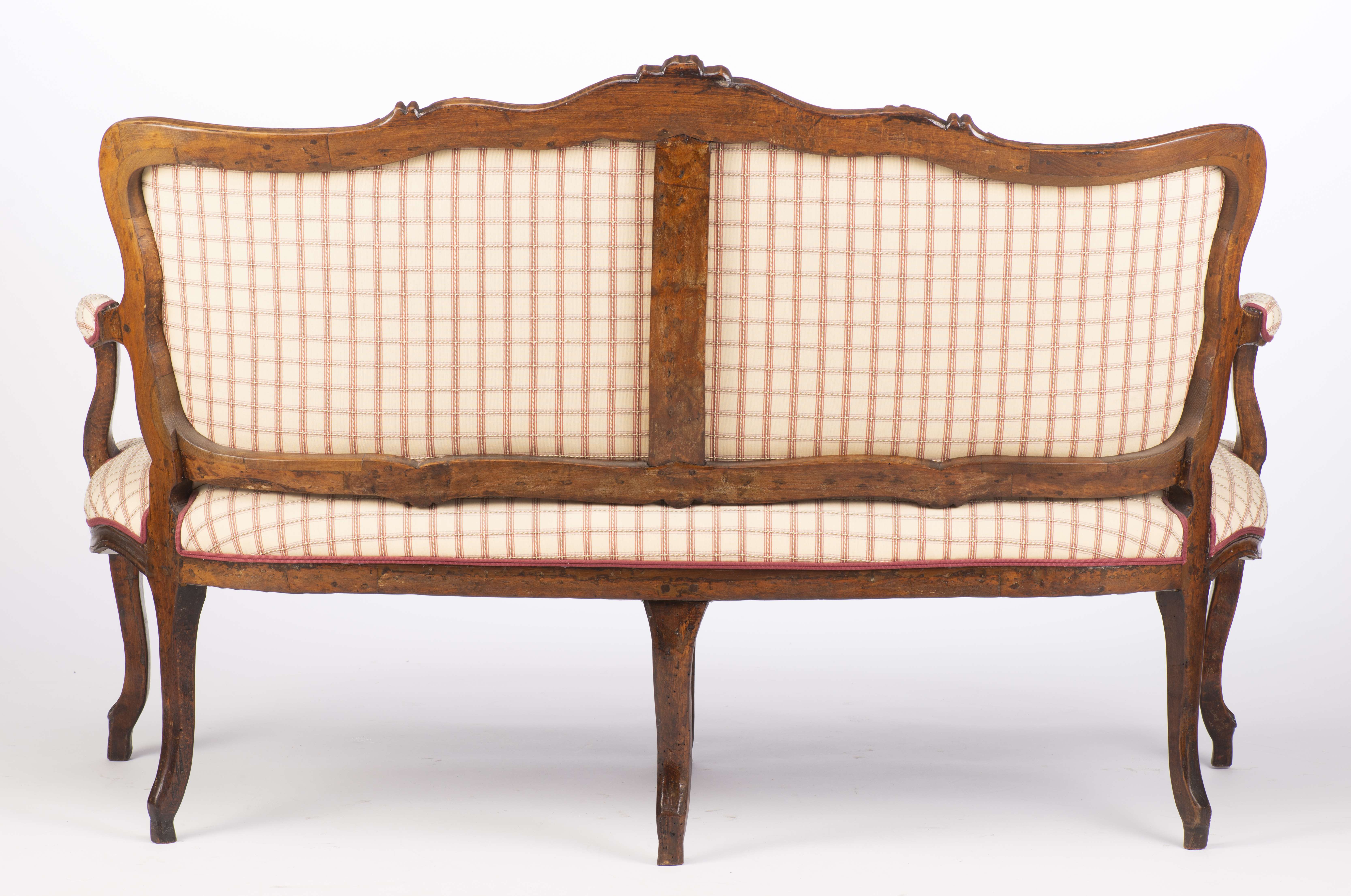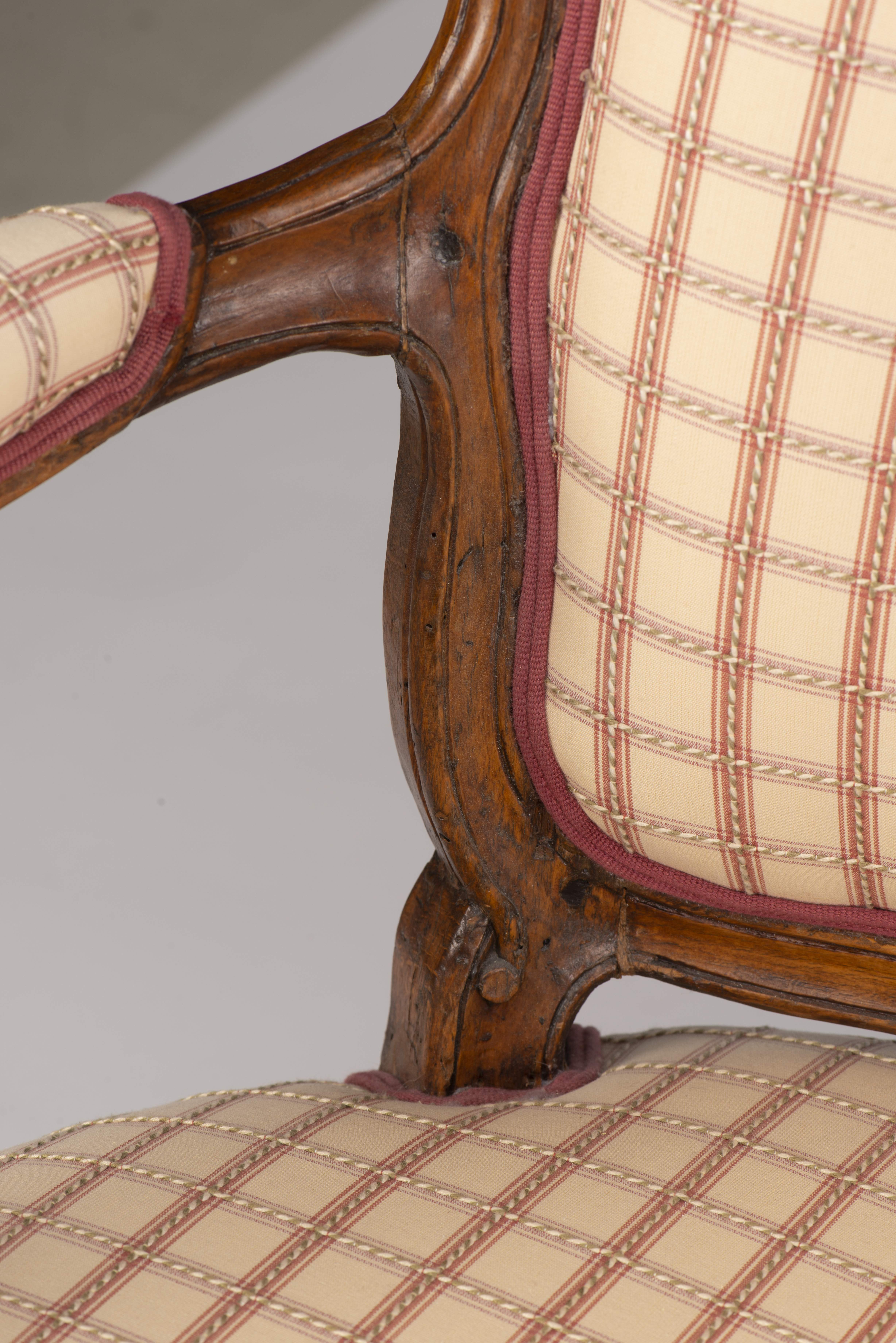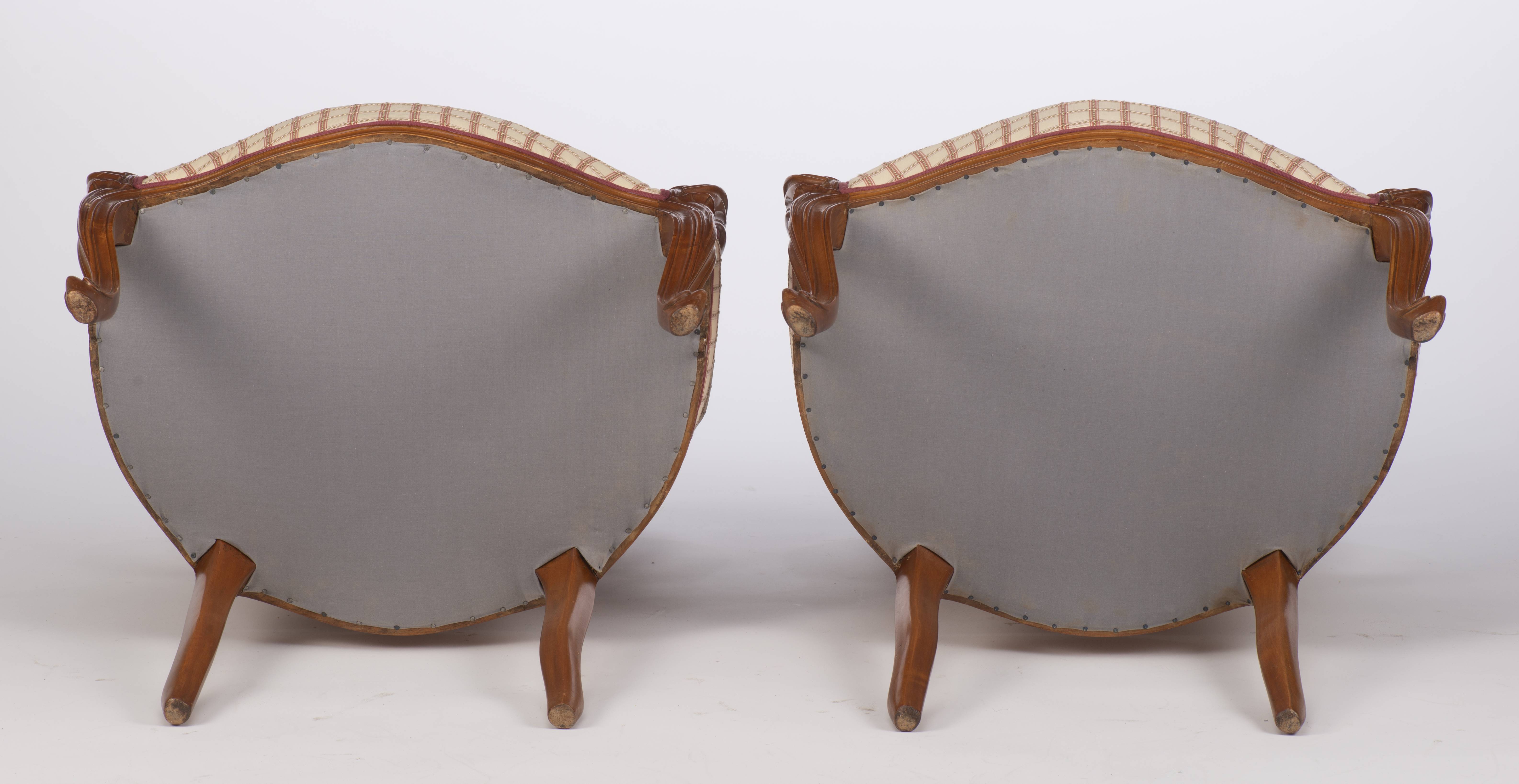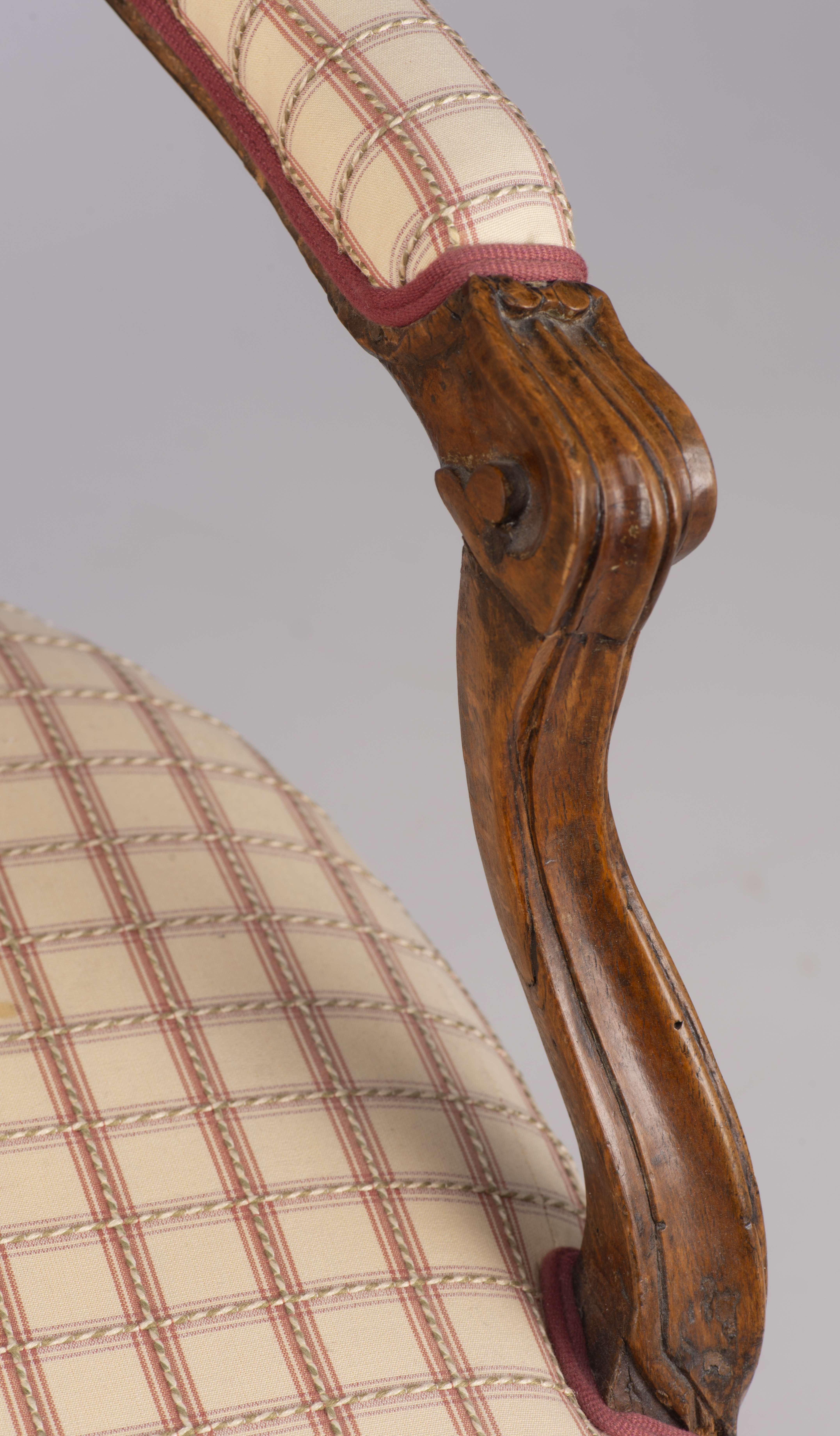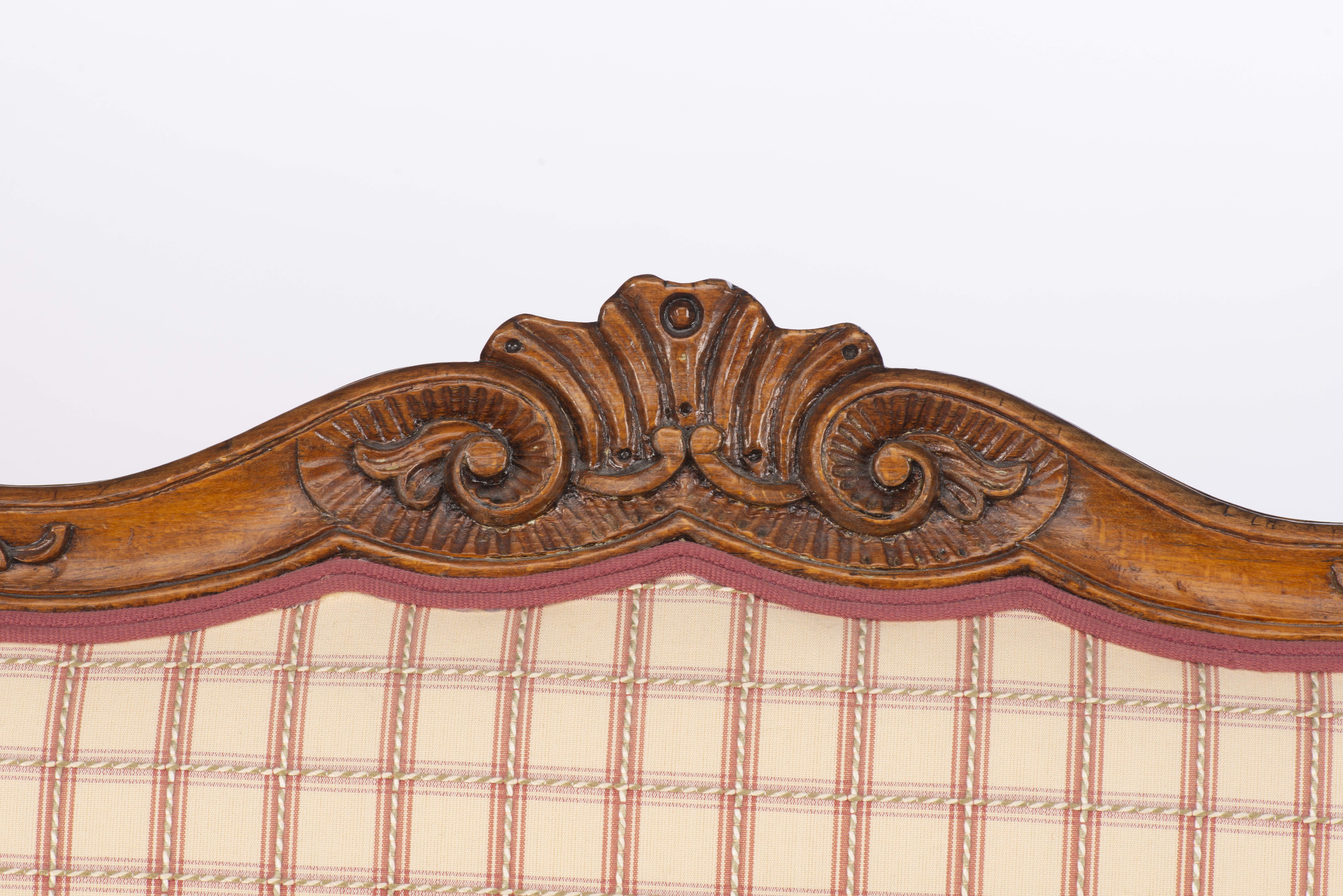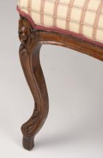 Petit salon comprenant un canapé et 2 fauteuils de style Louis XV recouverts de tissu blanc à carreaux