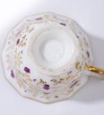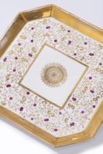 Petit tête-à-tête d'époque Nap. III en porcelaine de Paris à présentoir carré à coins coupés (22x22 cm) à décor central circulaire à l'intérieur d'un carré, champ à décor végétal à l'or, fleuri en violet et bleu, comprenant :