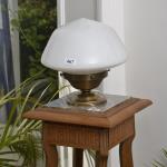 plafonnier globe transformé en lampe de table, armature en laiton et verre opalescent blanc.