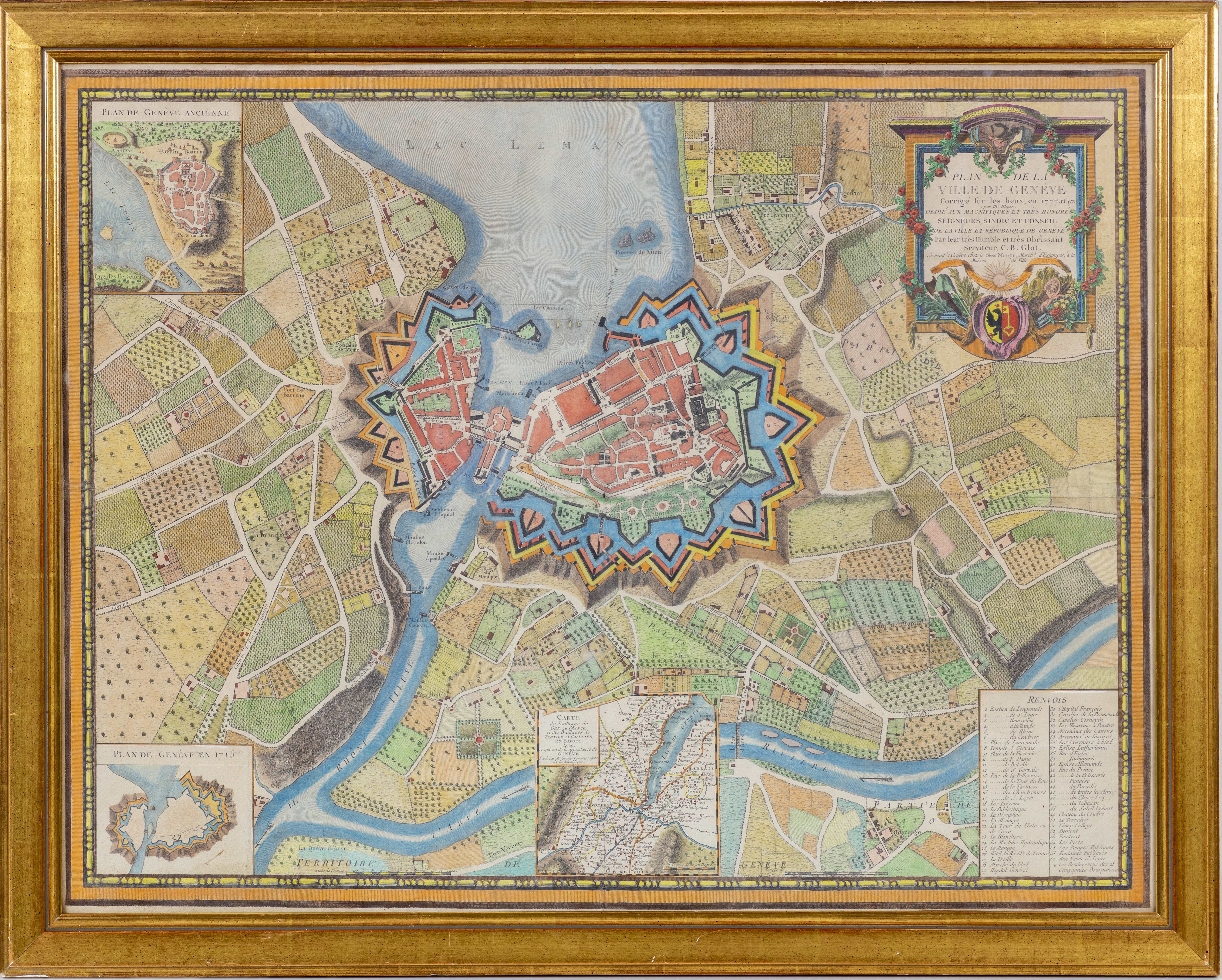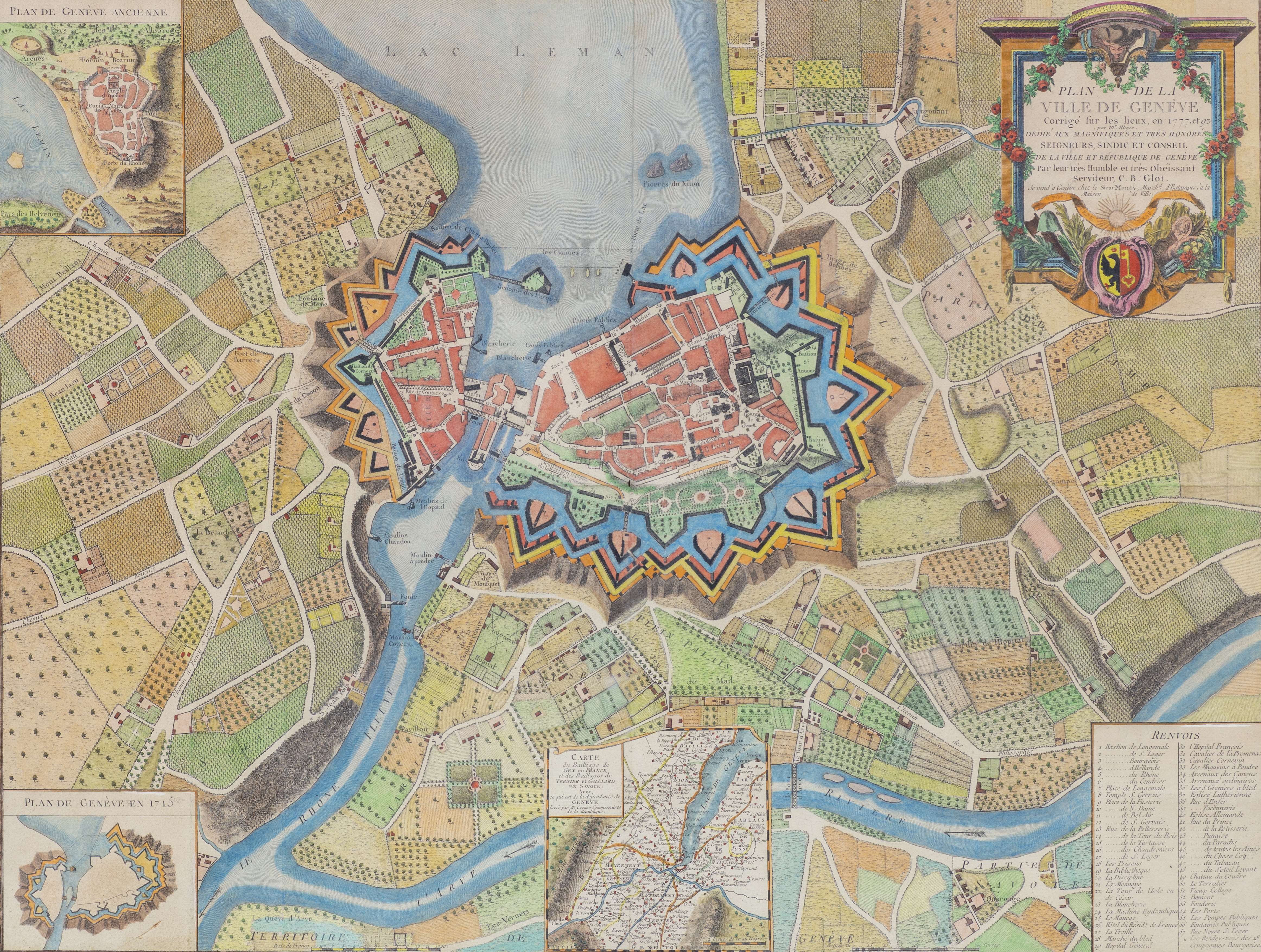 Plan de la ville de Genève, corrigé sur les lieux en 1777 et 93 par Mr Meyer, montrant les anciennes fortifications, aquarellé à la main.