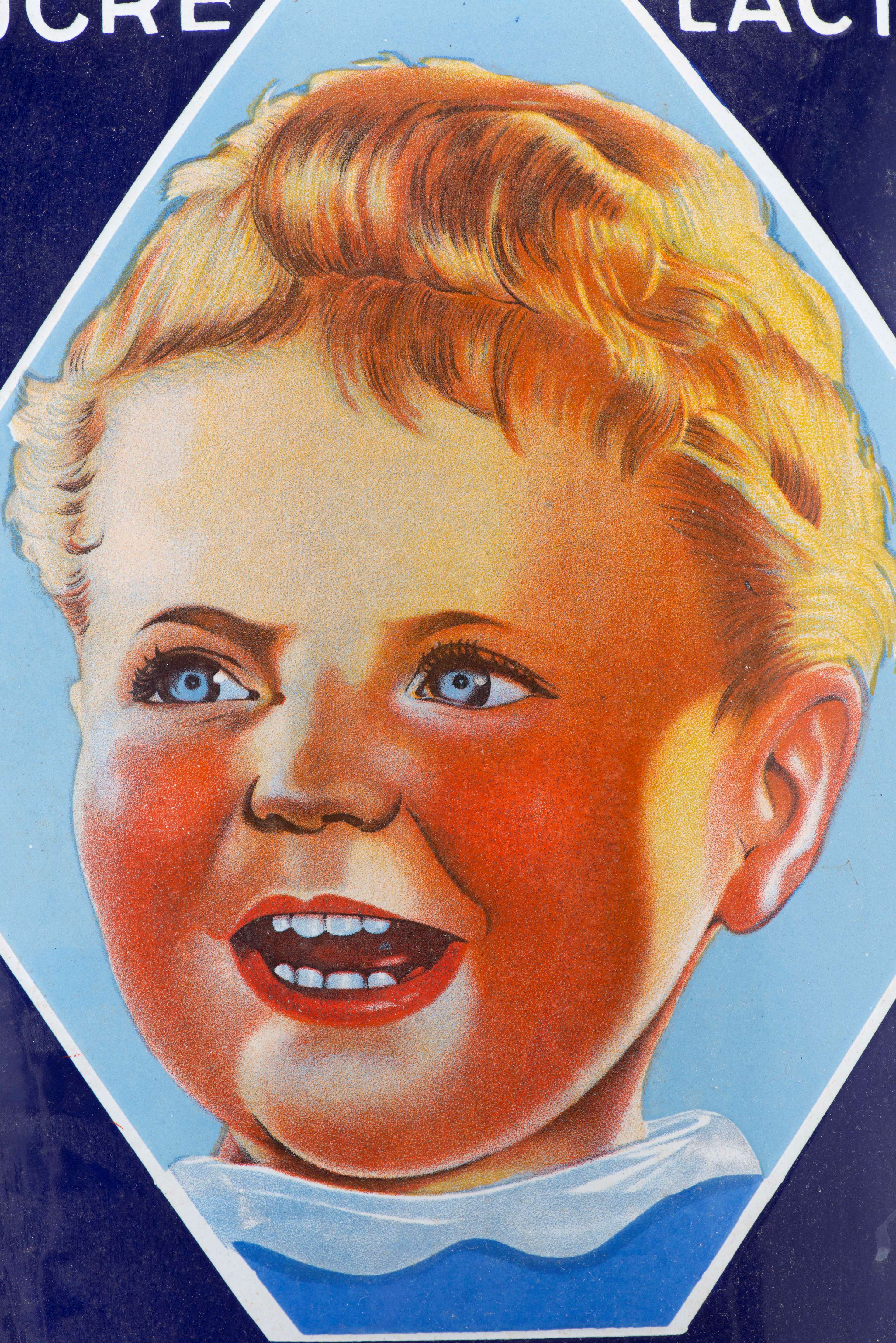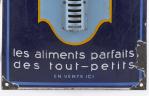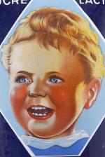 Nestlé. Plaque publicitaire en tôle émaillée présentant le visage d'un jeune enfant, sont inscrcites les mentions: "lait sucré, farine lactéee, les aliments parfaits pour les tout-petits", puis en bas"En vente ici", "Thermo Bd Gouvion Saint cyr" en bas à gauche.