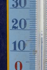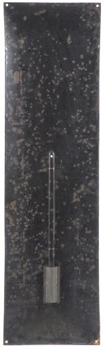 Trou aux angles, manque d'émail aux angles, au centre et sur les bords, avec son thermomètre, traces de corroosion au dos, bon état général.