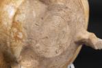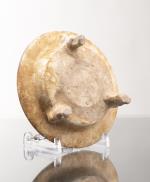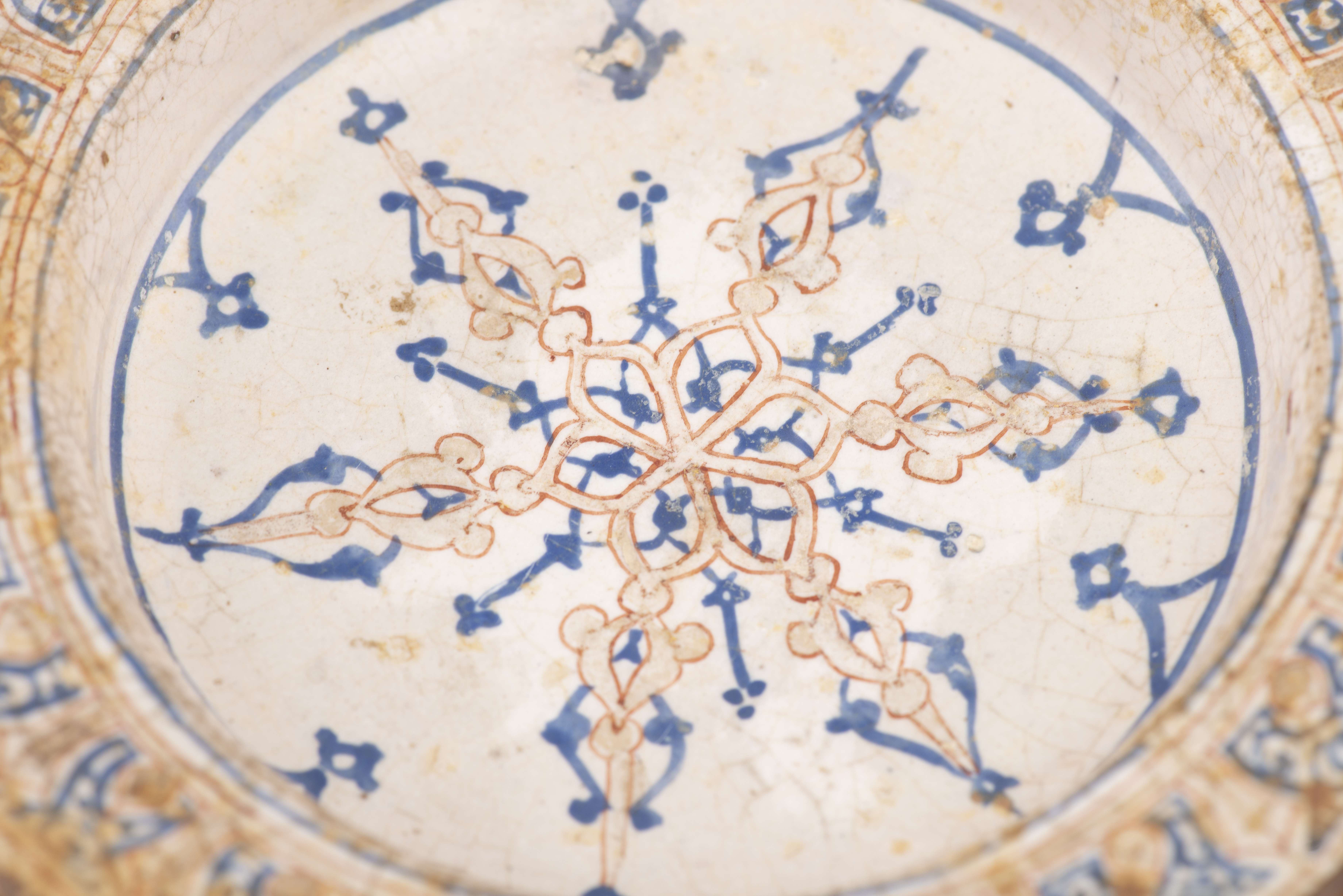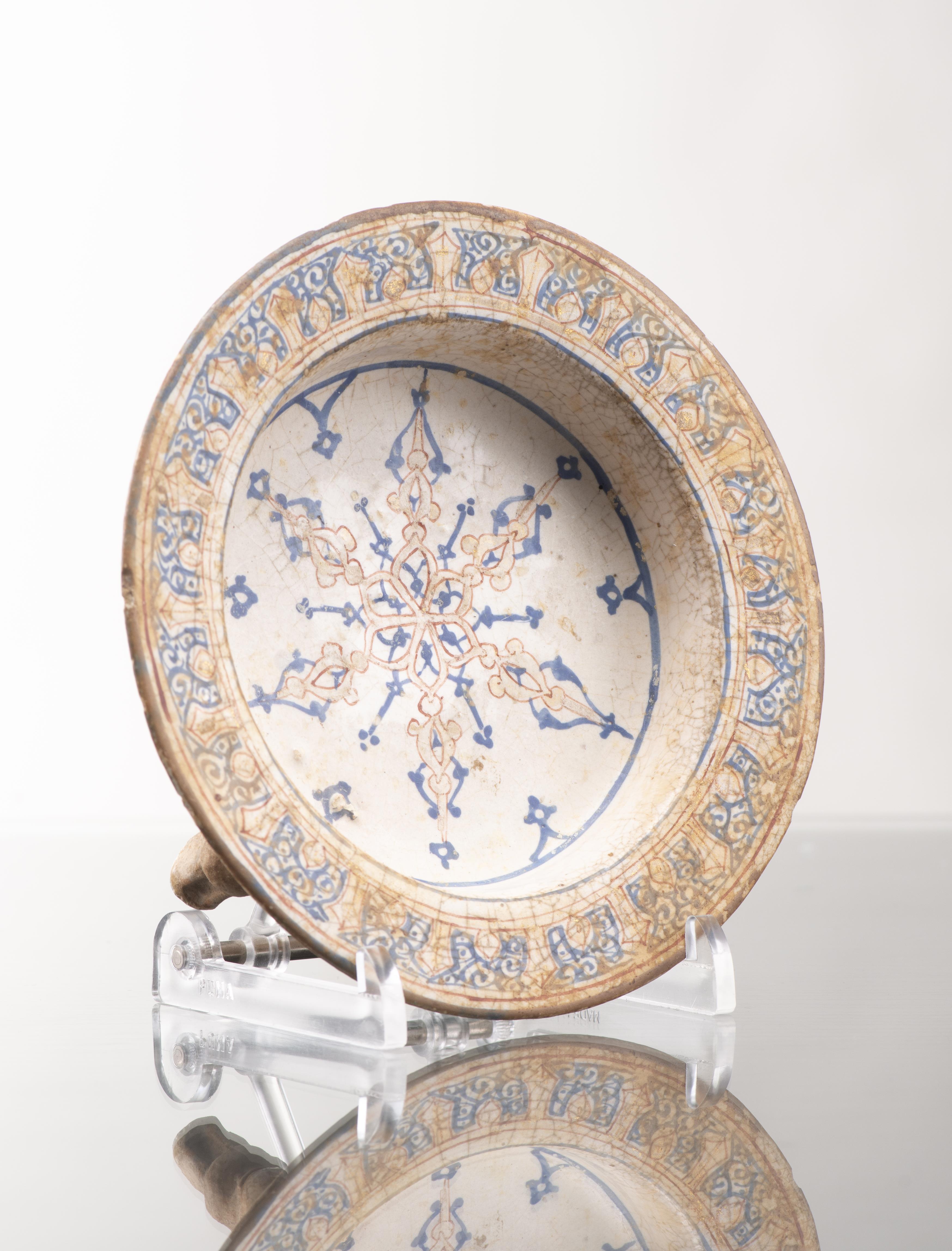 Petit plat tripode en céramique à décor géométrique peint en bleu et rouge, Iran.