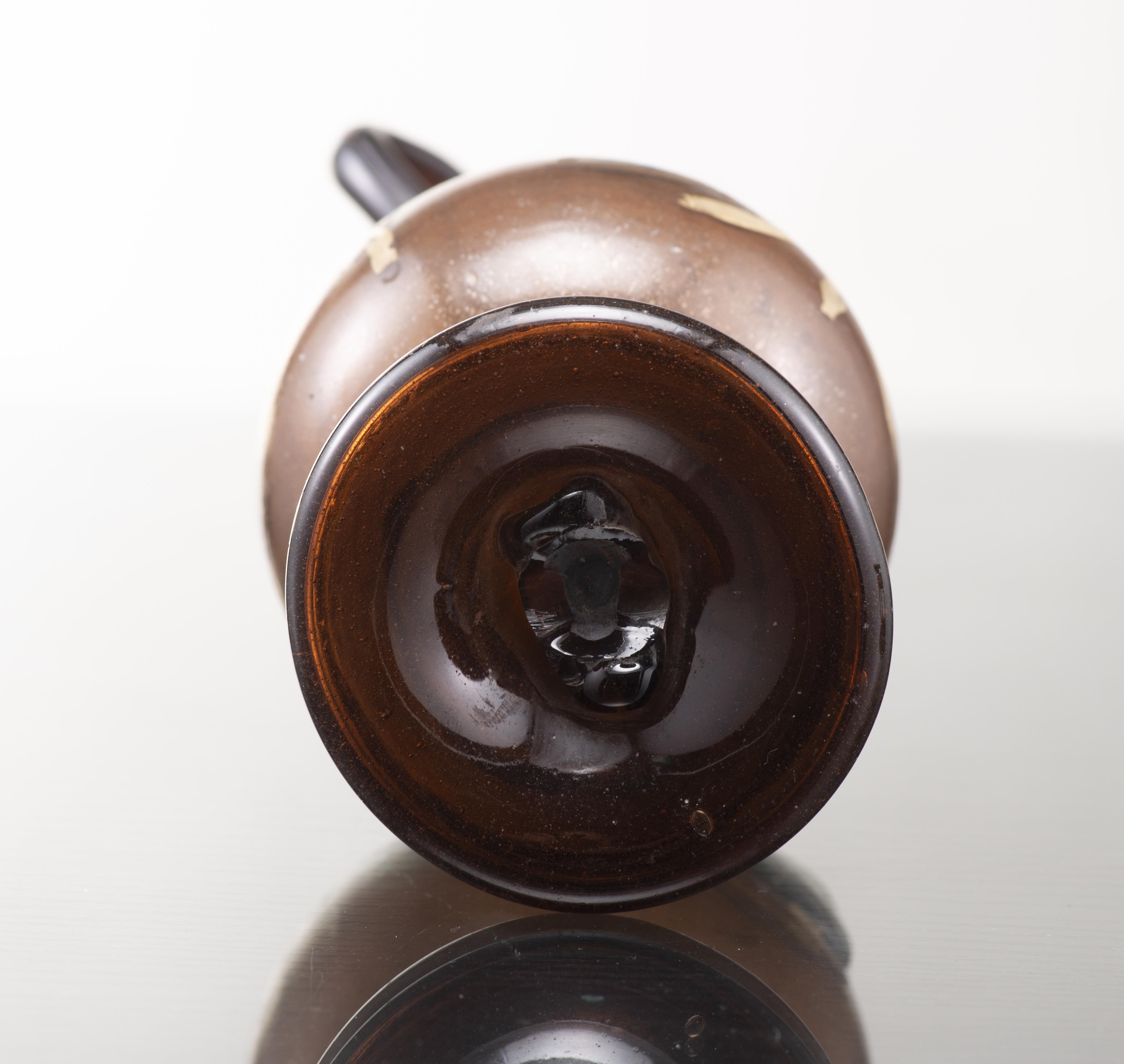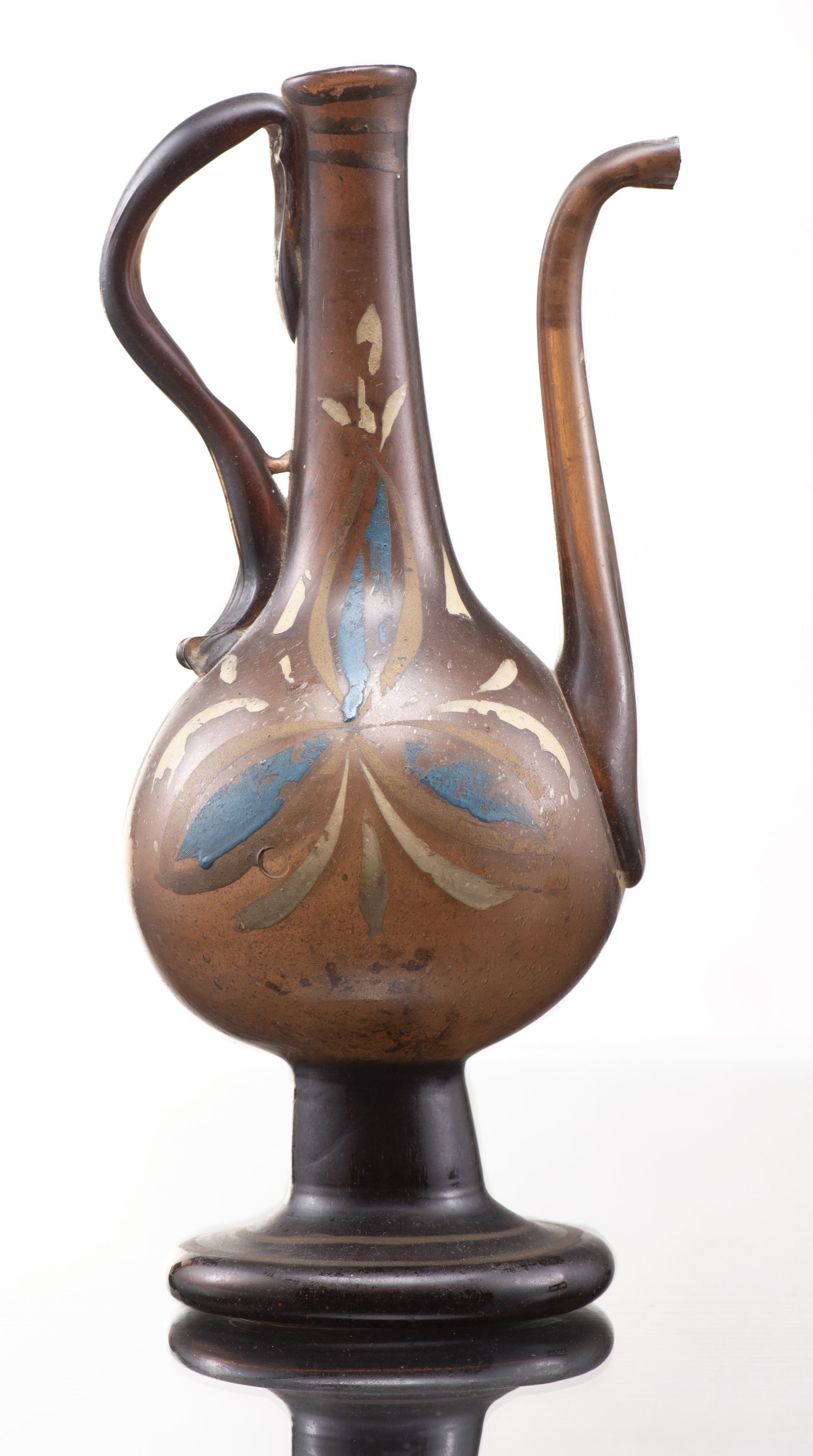 On y joint une aiguière en verre brun à décor géormétrique peint en beige et bleu, Iran, H. 21x9.5x8 cm