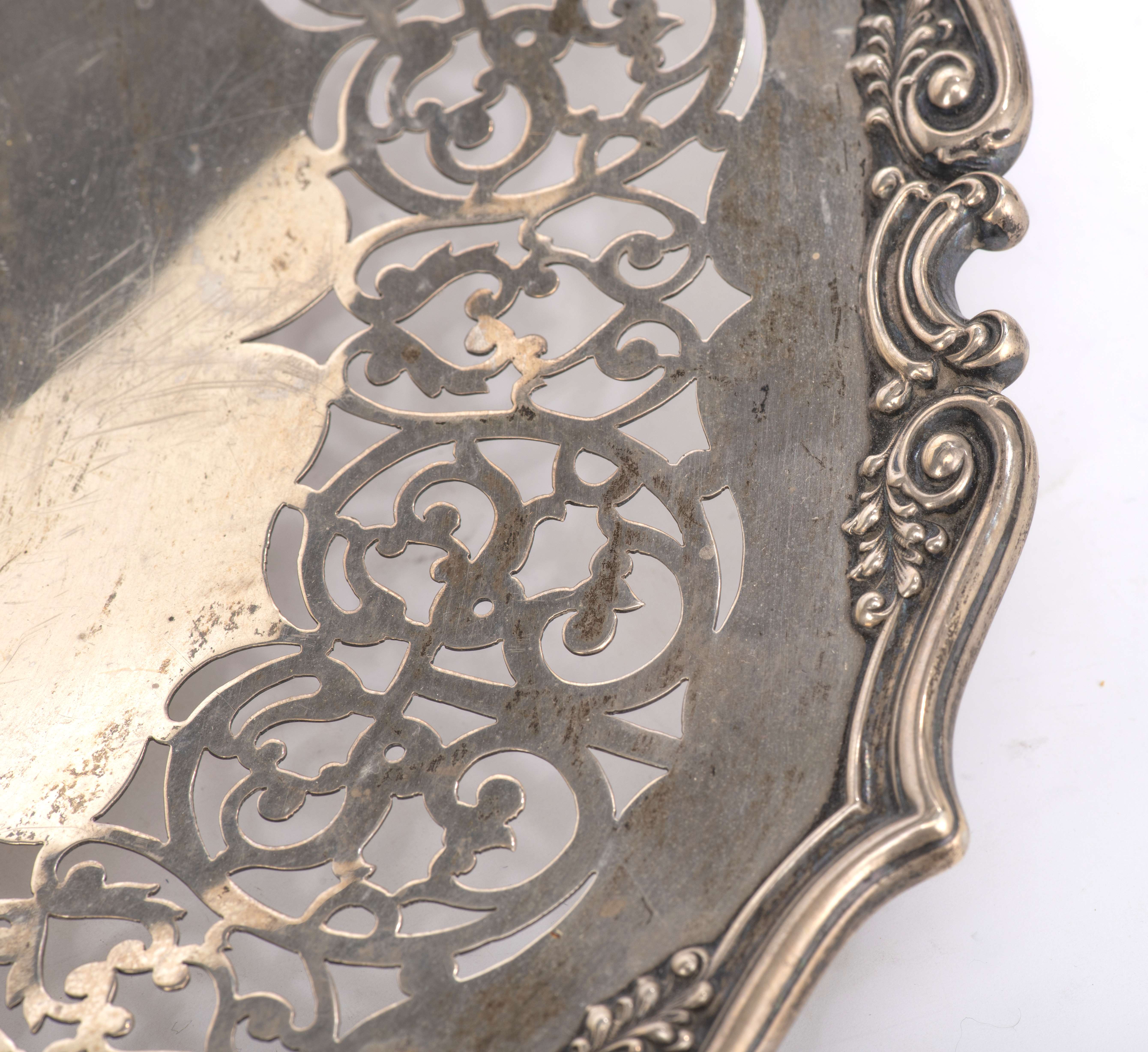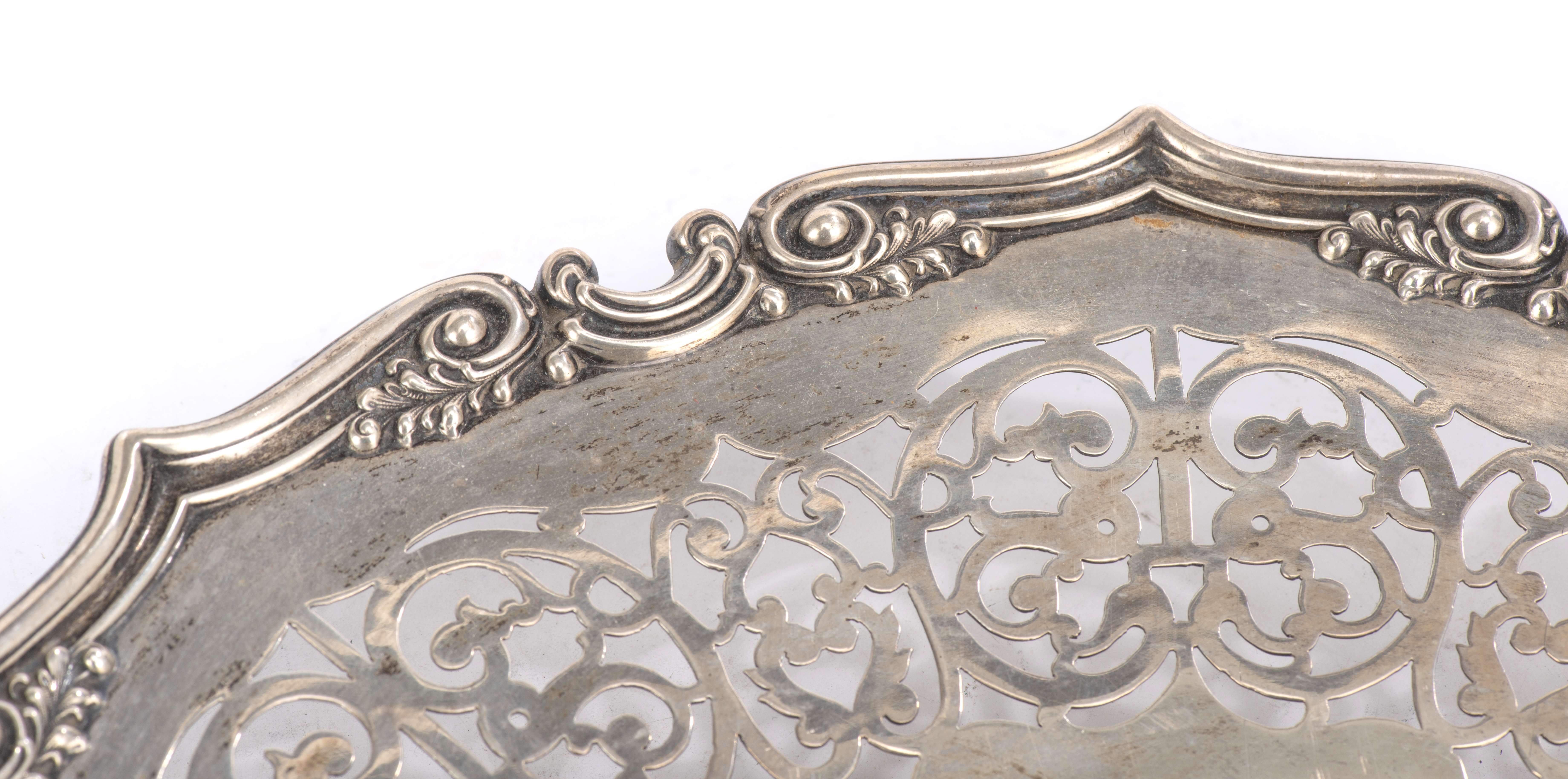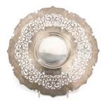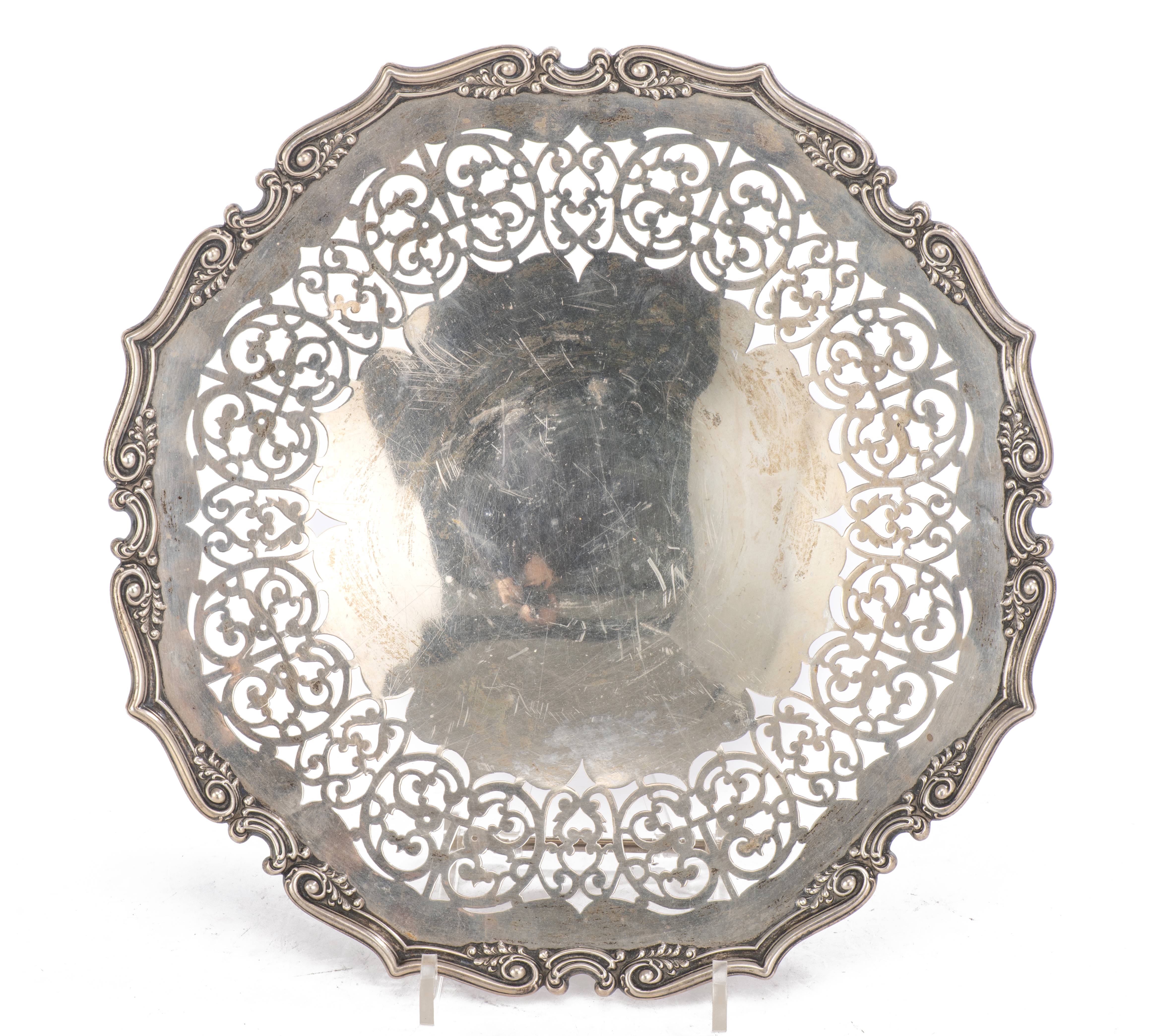 Plateau rond sur pied cerclé en argent .925 sterling à bordure mouvementée et légèrement rehaussée, marli ajouré.