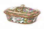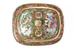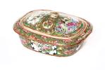 Porte-savon en porcelaine de Canton à décor en médaillons de personnages et, fleurs et oiseaux huaniao 花鳥, sur champ de papillons sur des entrelacs sur fond or.