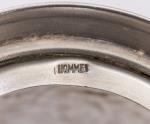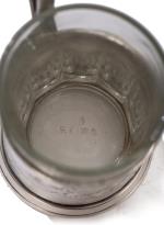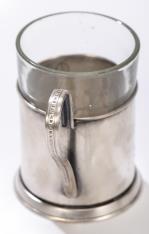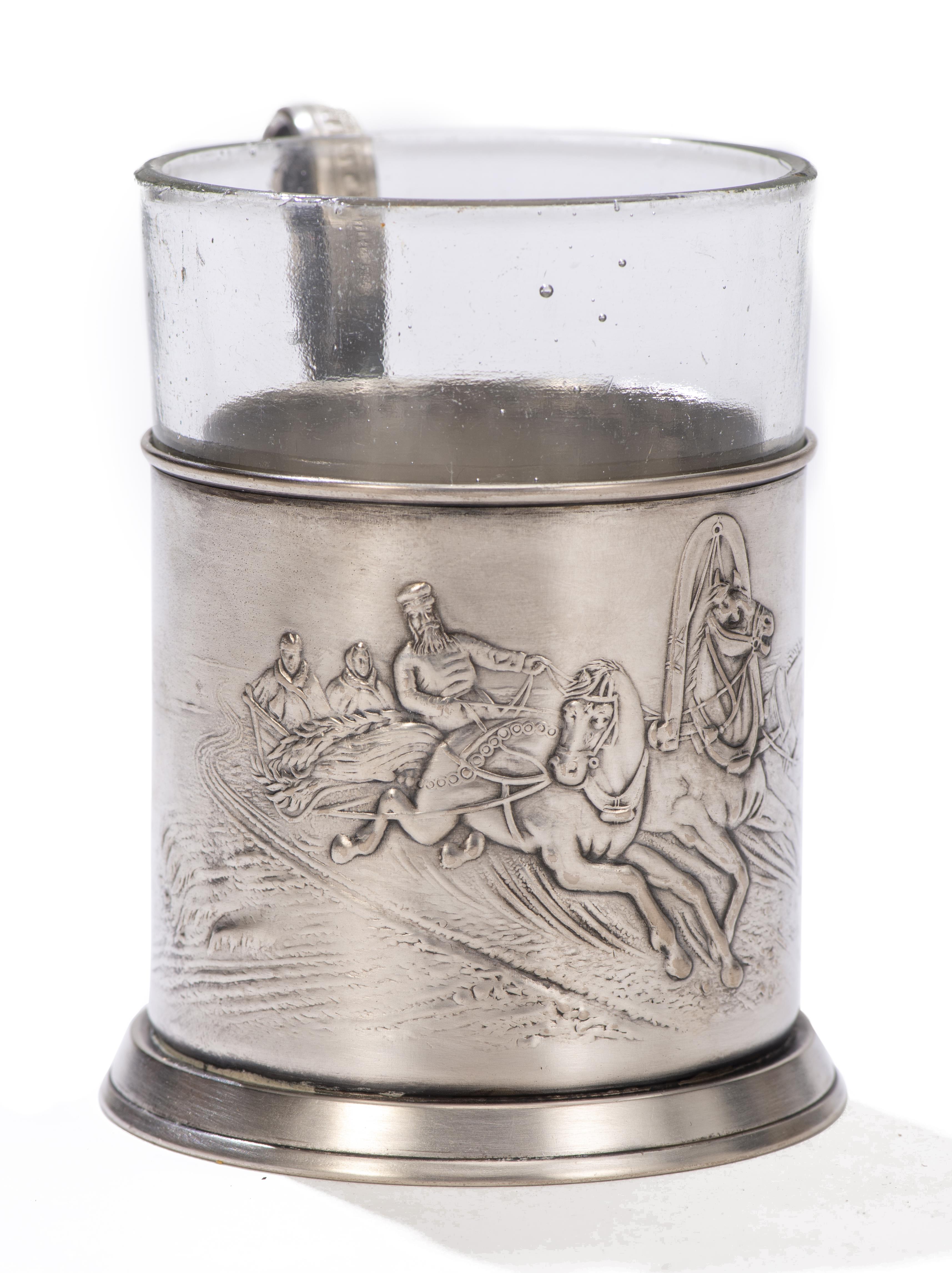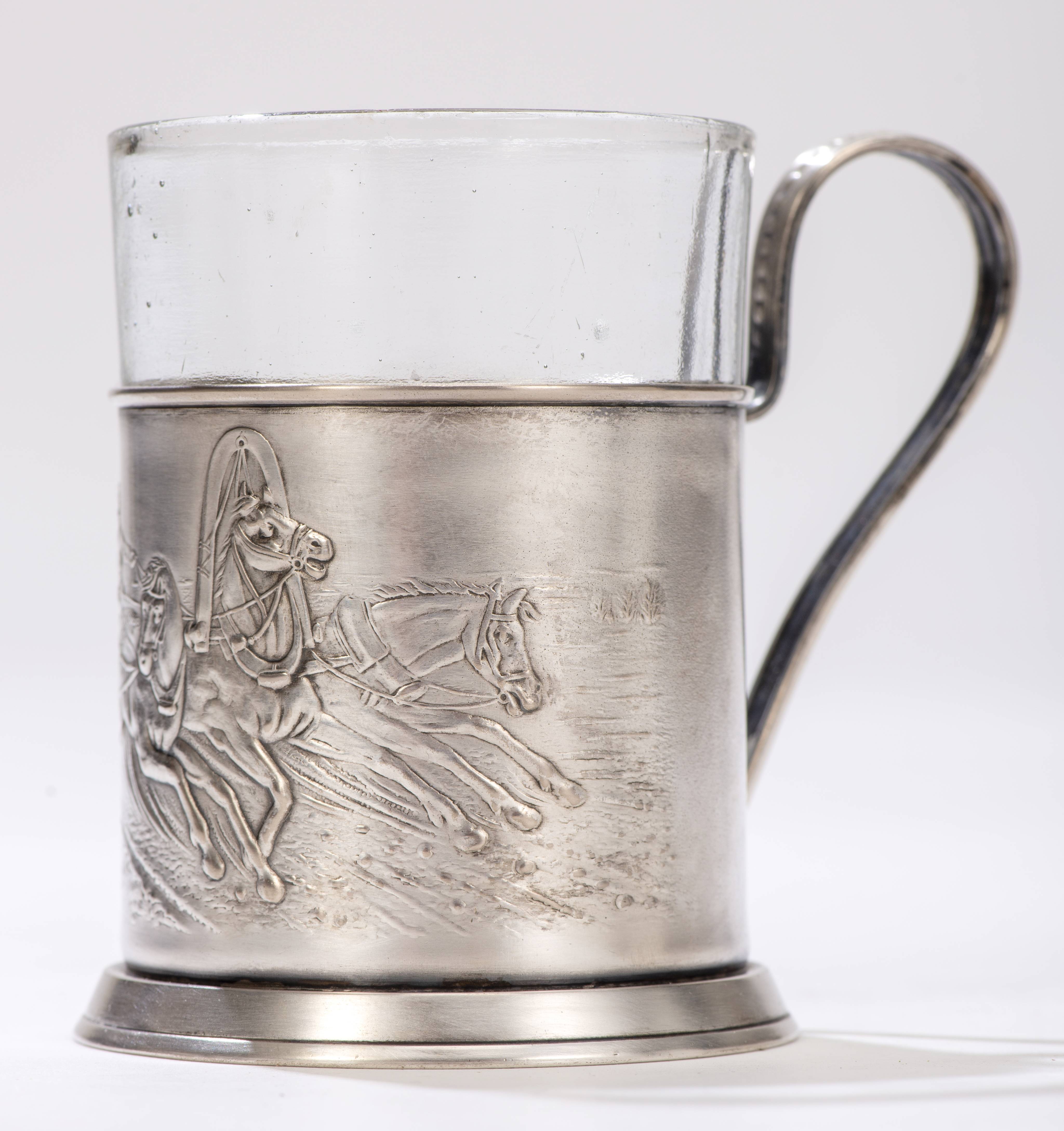 Porte-verre à thé en métal argenté à une anse et décor repoussé d'un char tiré par 3 chevaux, Russie fin XIXe (Poinçon sous la base).