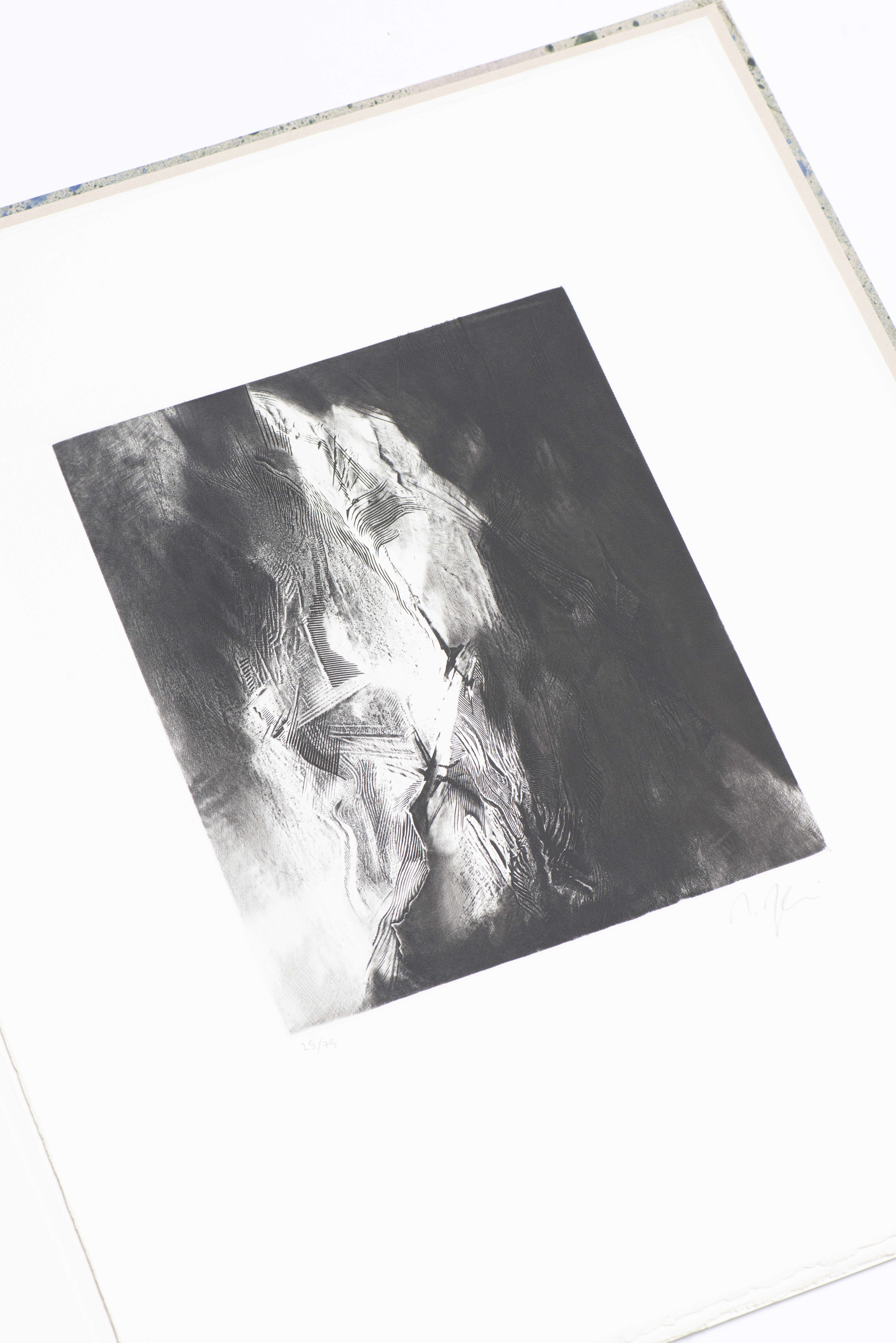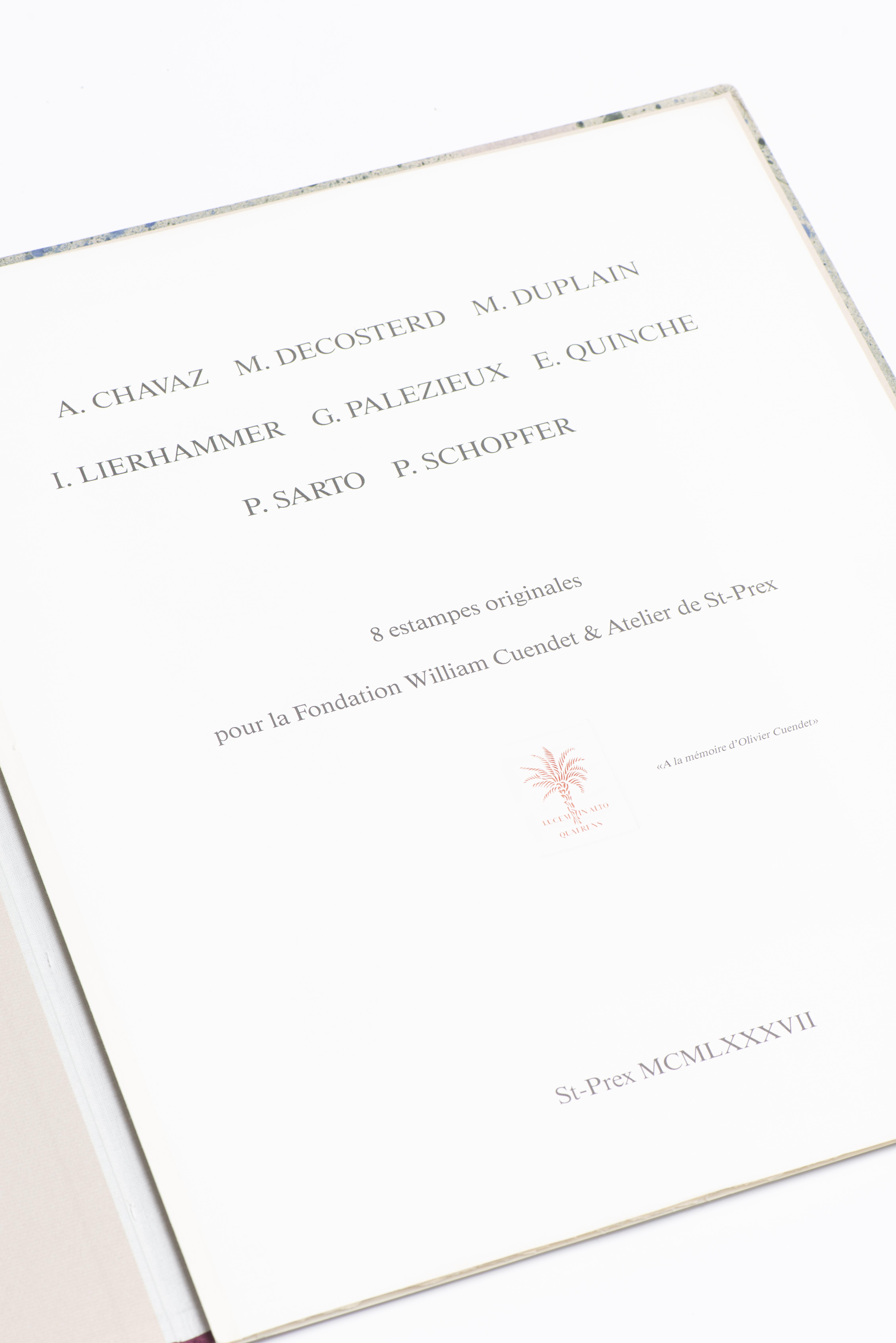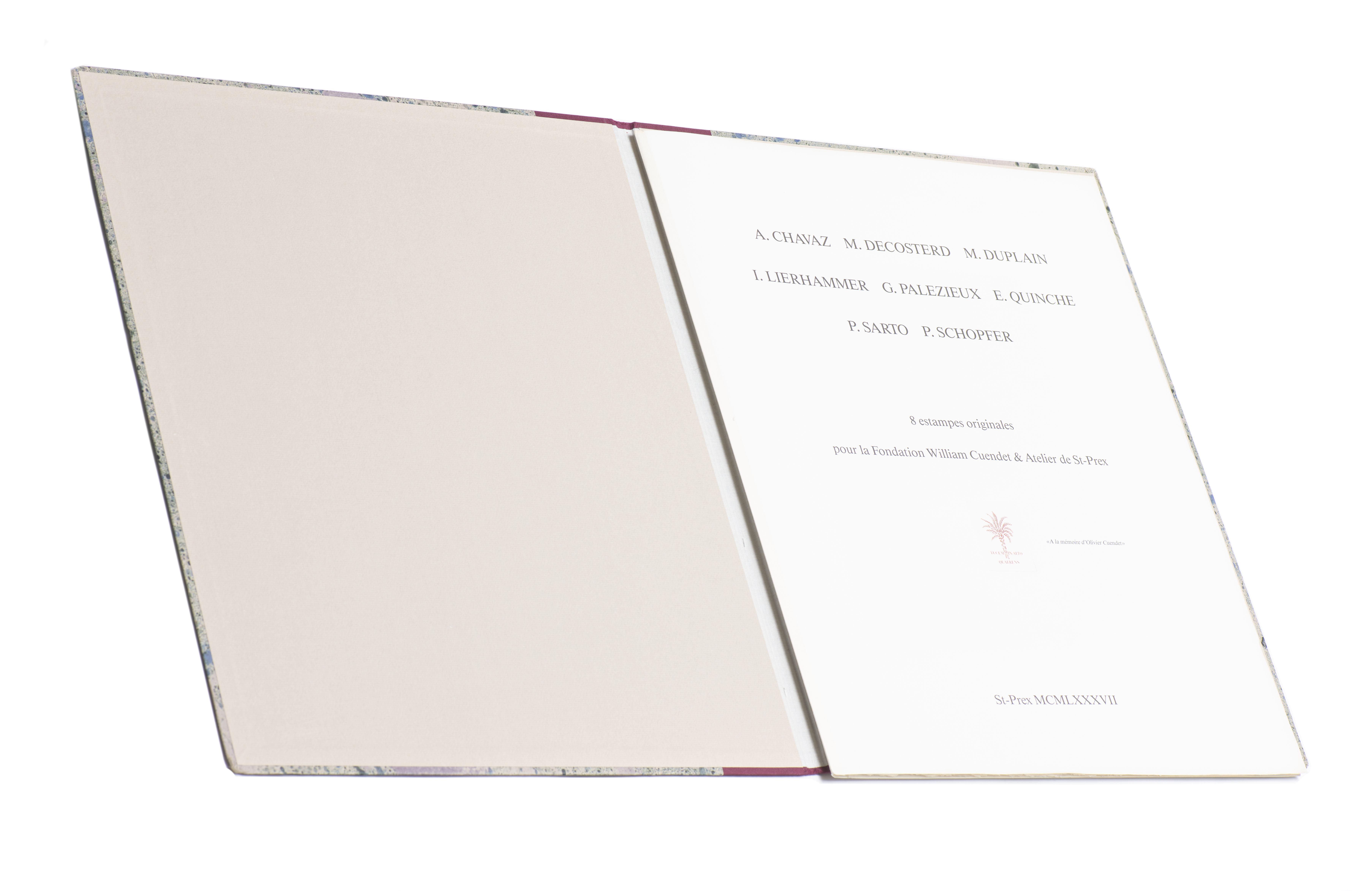 Portfolio comprenant huit estampes originales de A. CHAVAZ, M. DESCOSTERD, M. DUPLAIN, I. LIERHAMMER, G. PALEZIEUX, E. QUINCHE, P. SARTO, P. SCHOEPFER, exemplaire numéroté 25/75, édité par la Fondation Cuendet & Atelier de St-Prex, 1987.