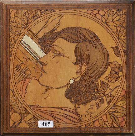 portrait Art Nouveau pyrogravé par M. Valentin, 'Portrait d'une jeune femme'.