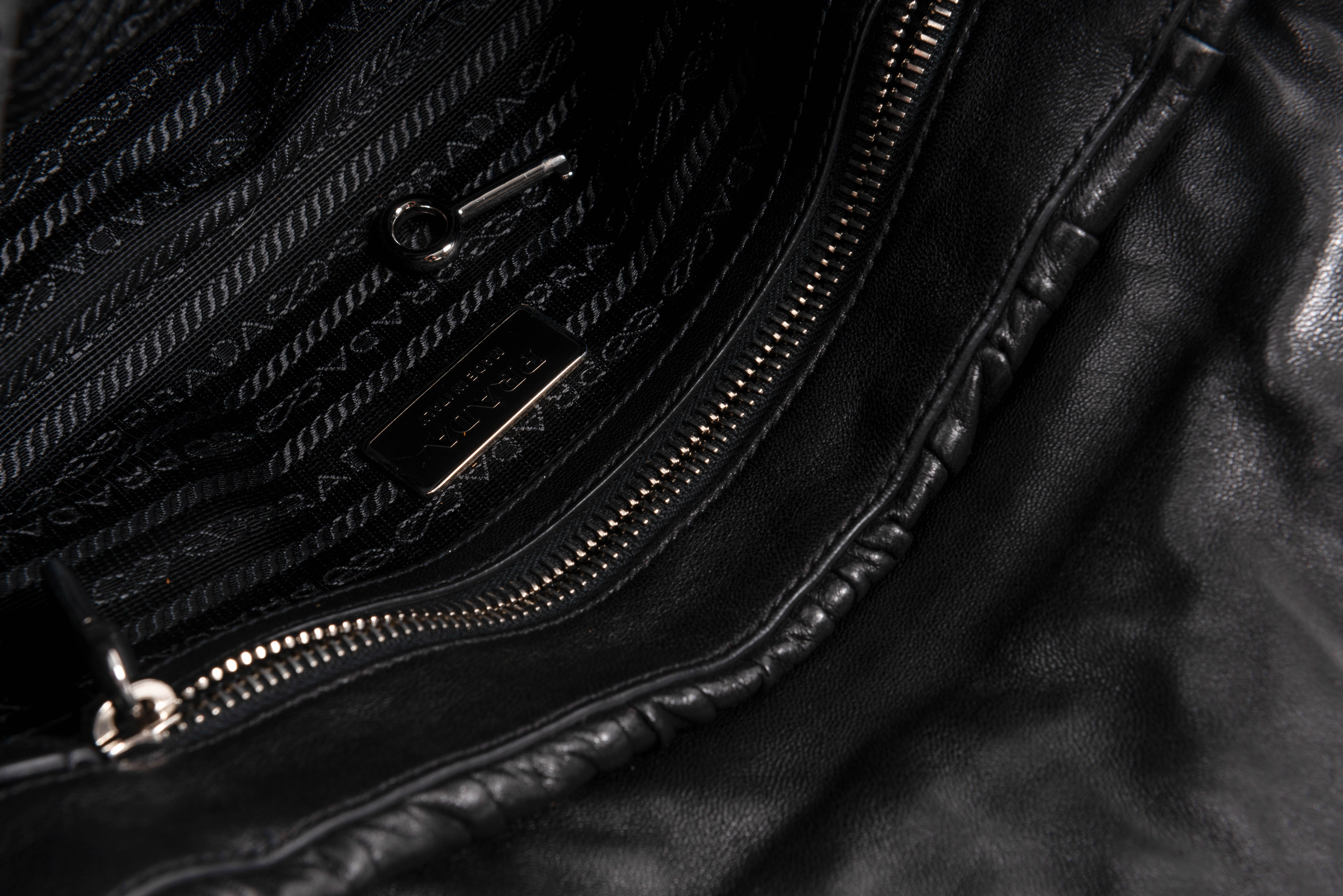 PRADA, sac à main Clutch en cuir noir plissé, fermeture à serrure et anse composée d'une large chaîne retenue par deux anneaux.