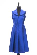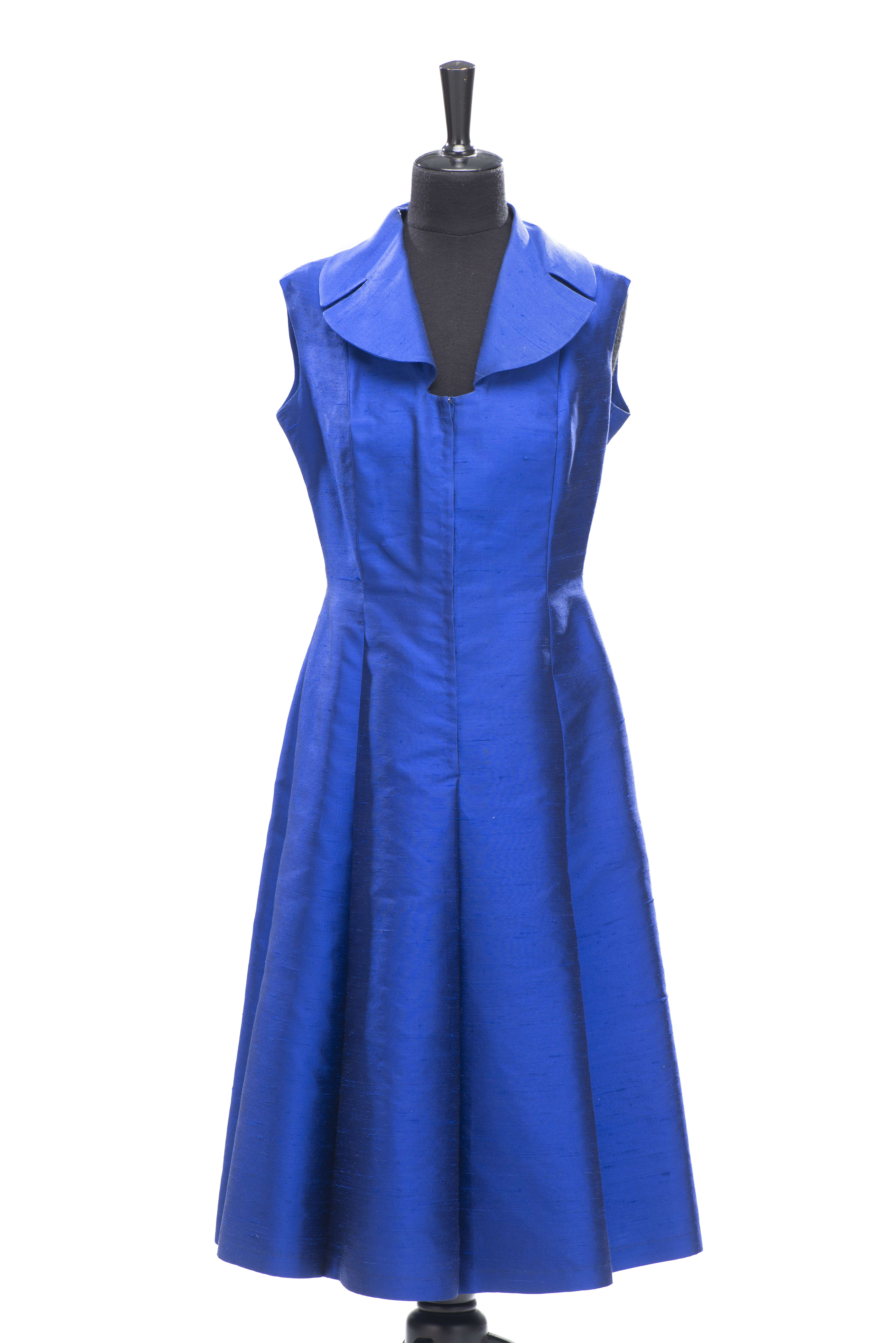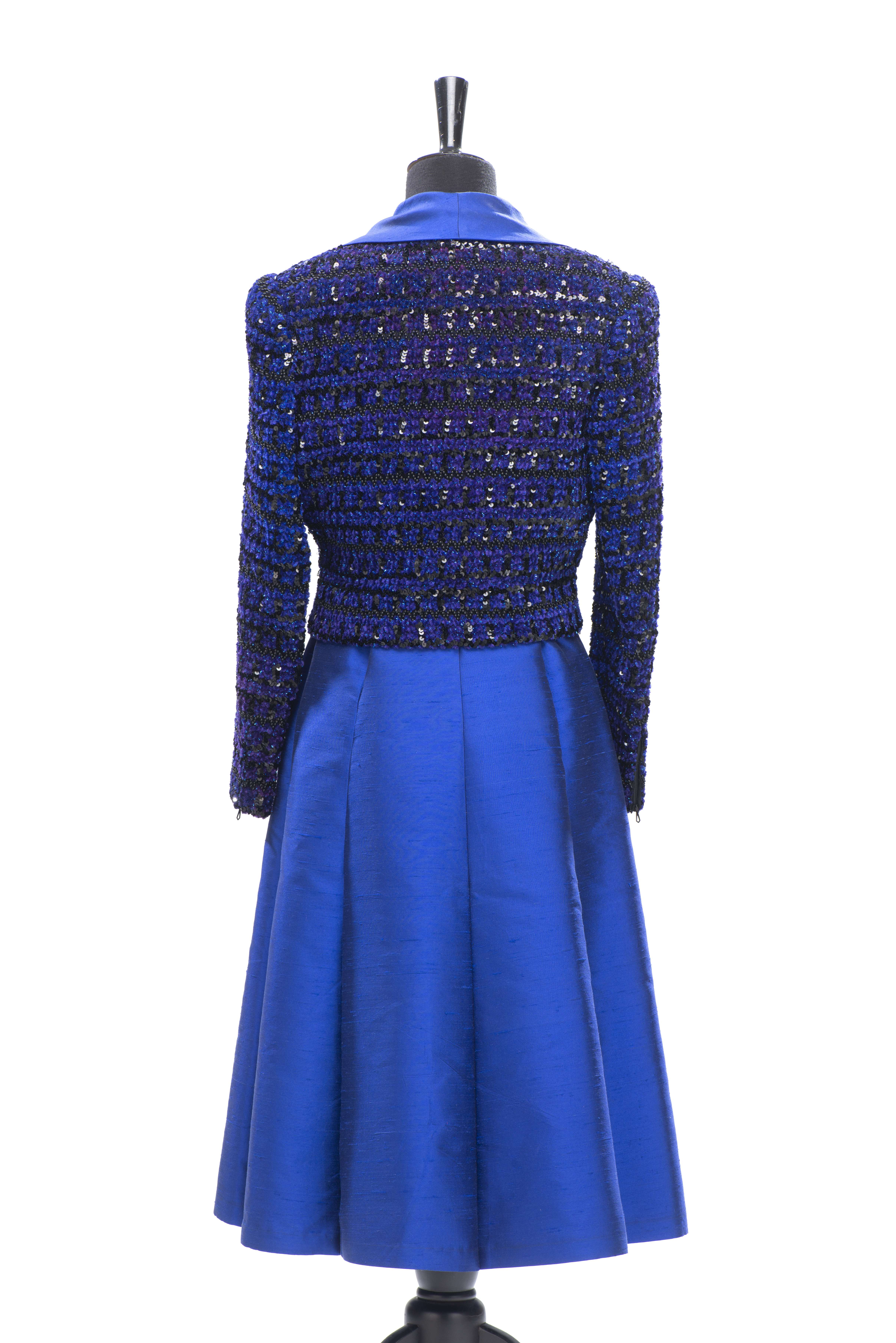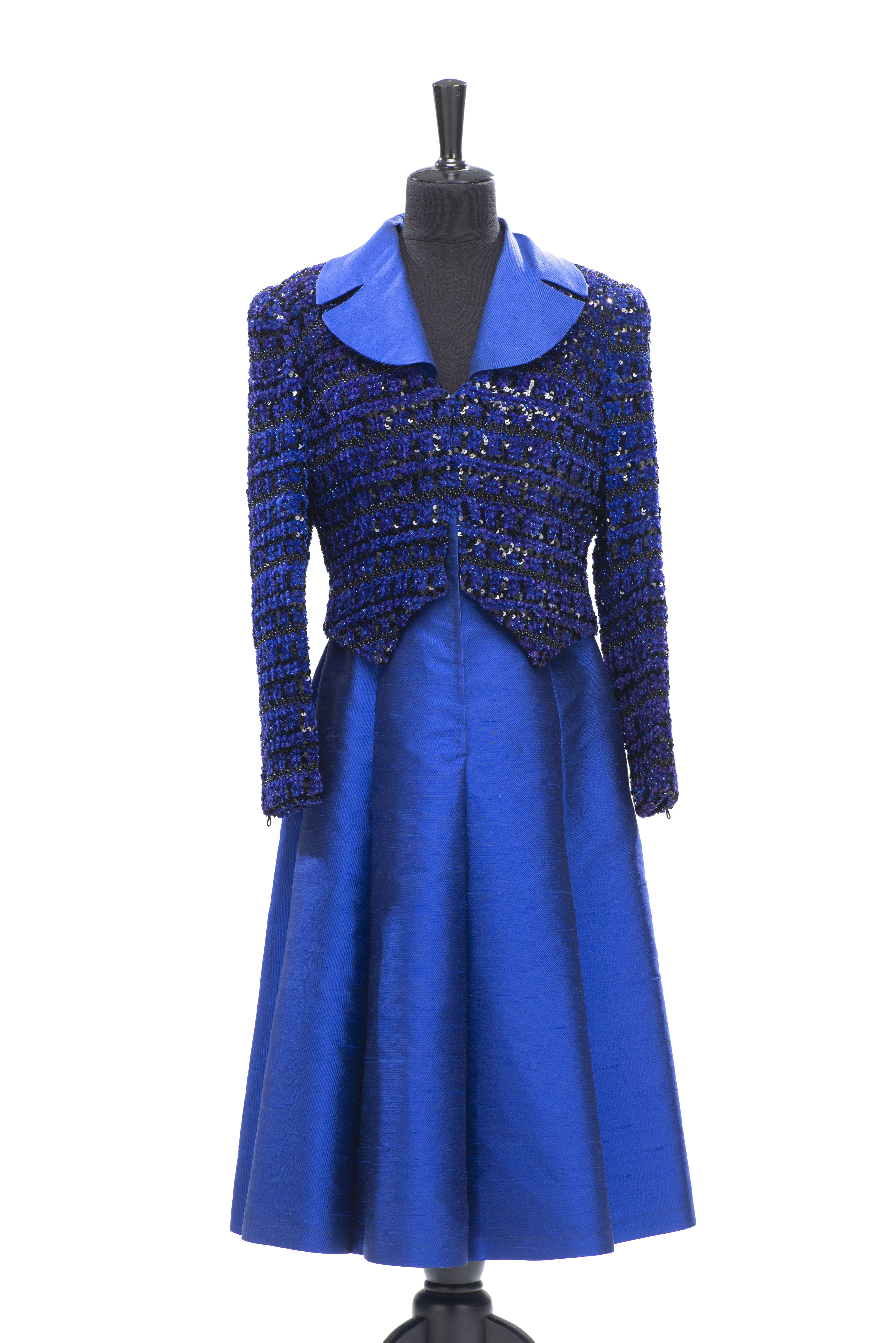 Robe en satin bleu et veste de soirée à séquins bleu et noir