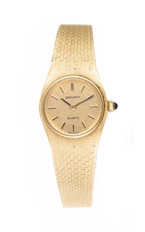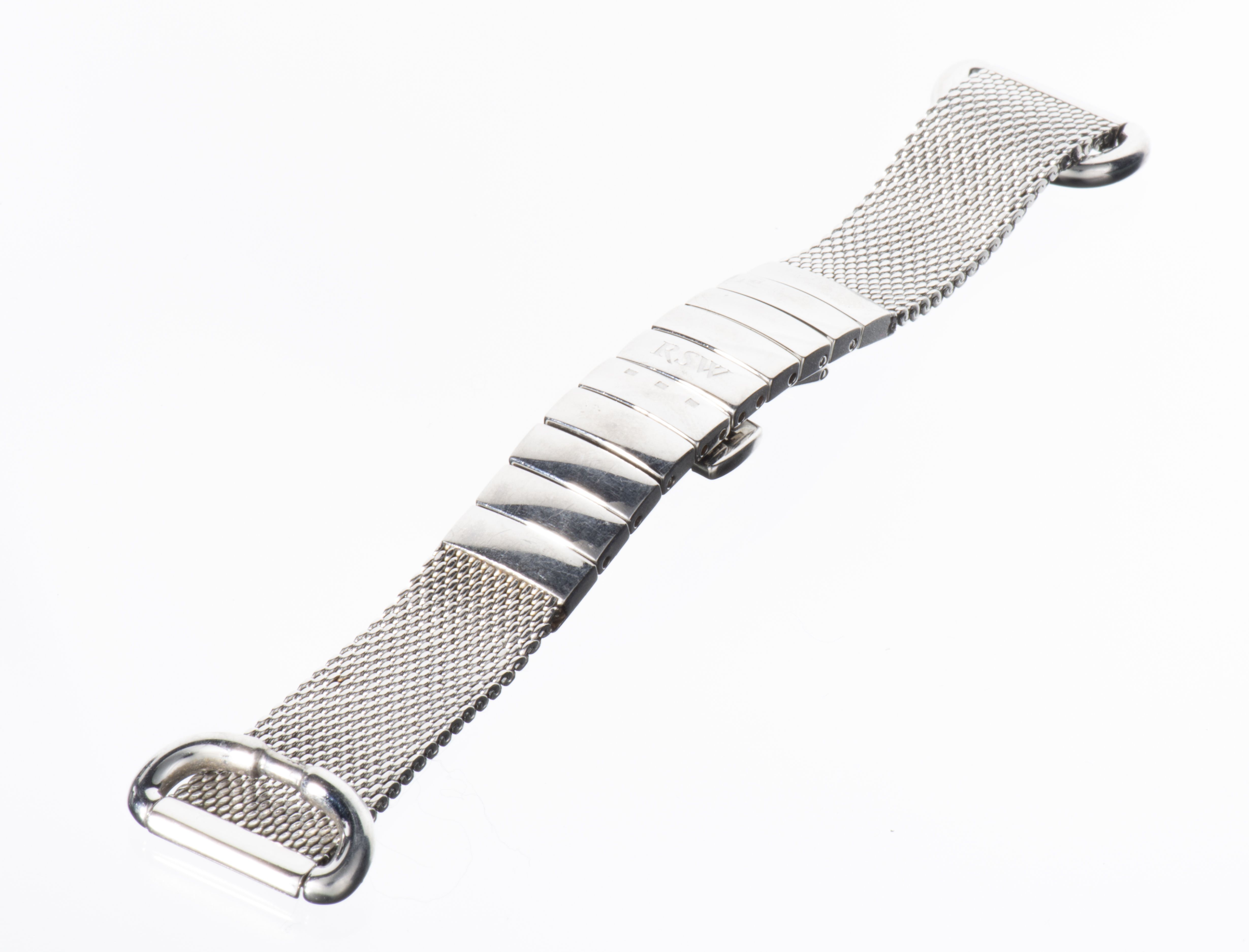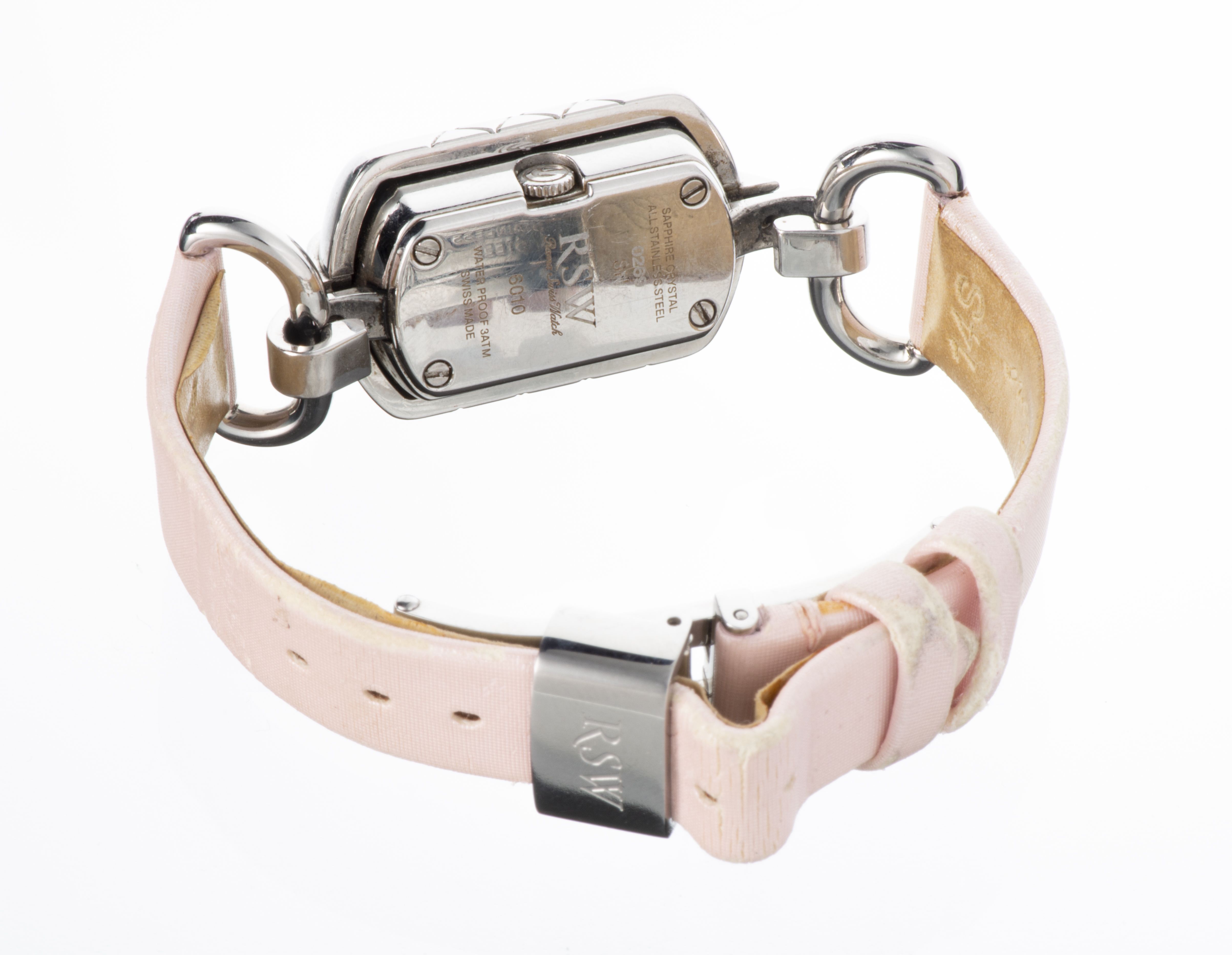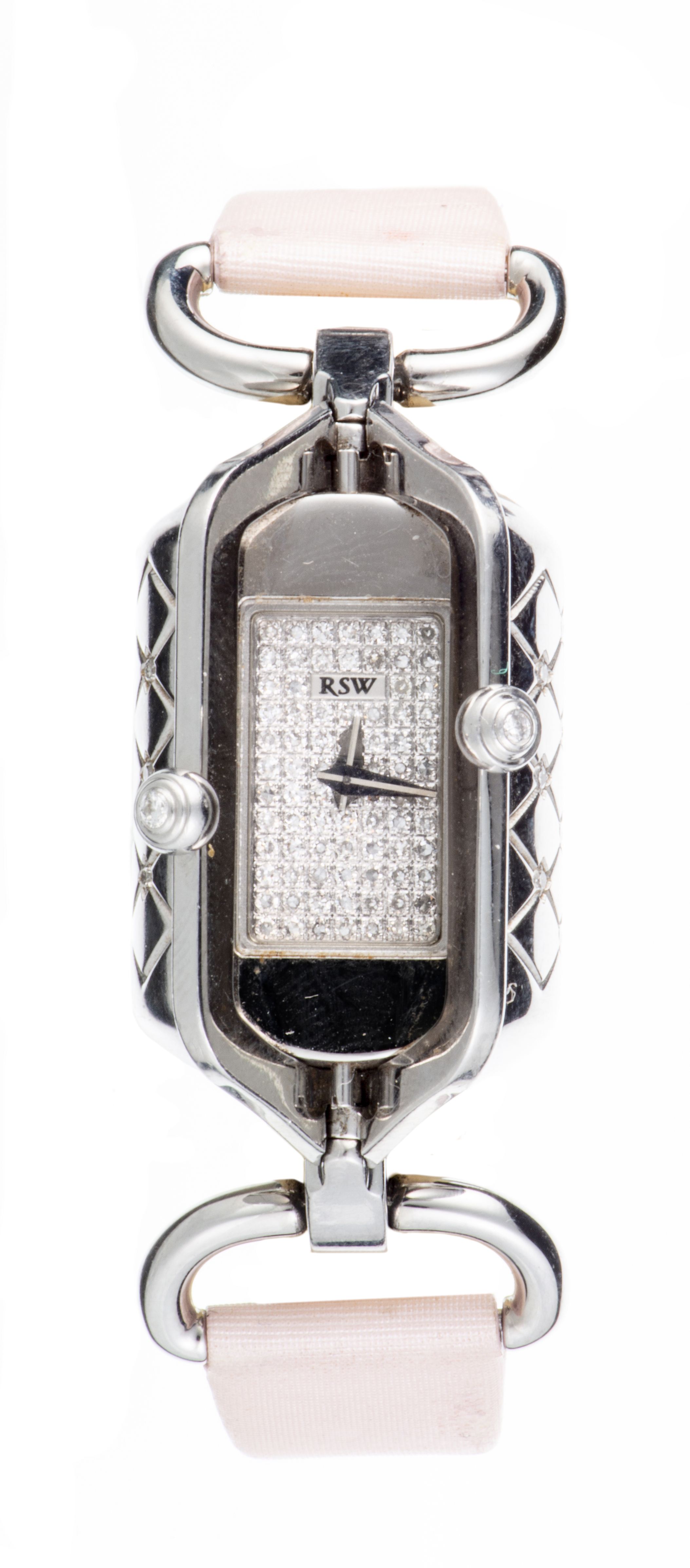 RSW, montre de dame à système en acier, cadran pavage diamants et bracelet en tissu rose, bracelet en acier en supplément. Dans son coffret d'origine