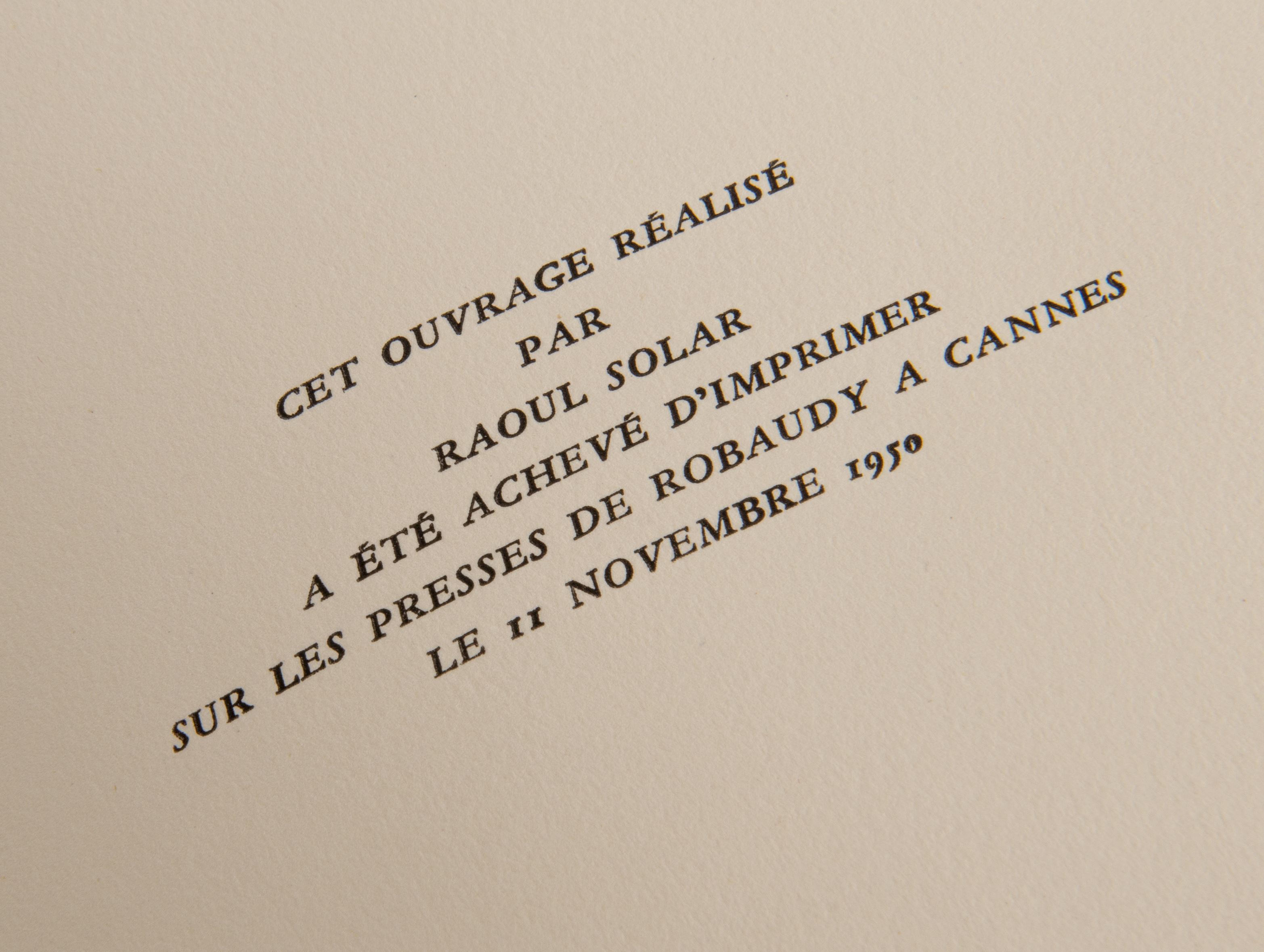 Presses de Robaudy à Cannes le 11 nov. 1950. Couverture gravée sur bois par Henri Jadoux.