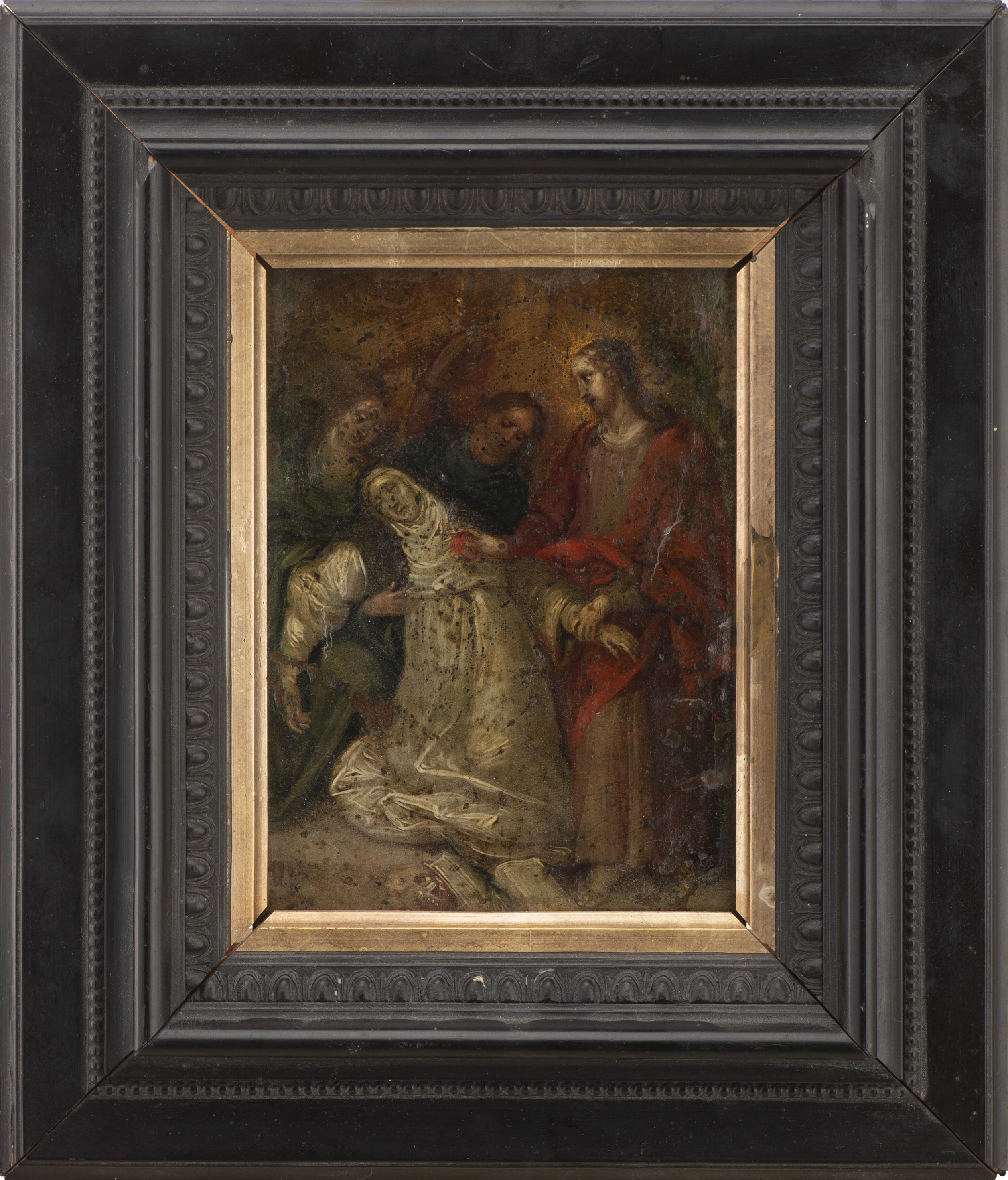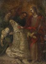 Anonyme, "Sainte Catherine de Sienne échangeant son cœur avec le Christ", huile sur cuivre, ns, inscriptions illisibles au dos. Ecole allemande.