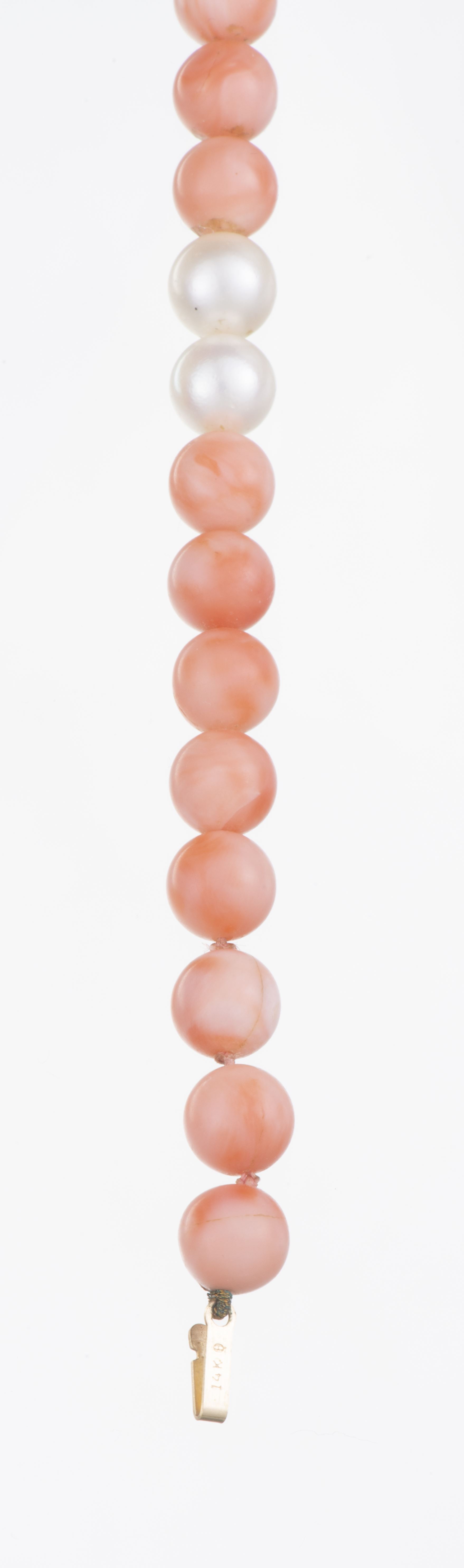 Sautoir de corail rose avec 60 perles de corail de 8 mm et 23 perles de culture japonaises de 8 mm. Fermoir boule en or jaune .585.