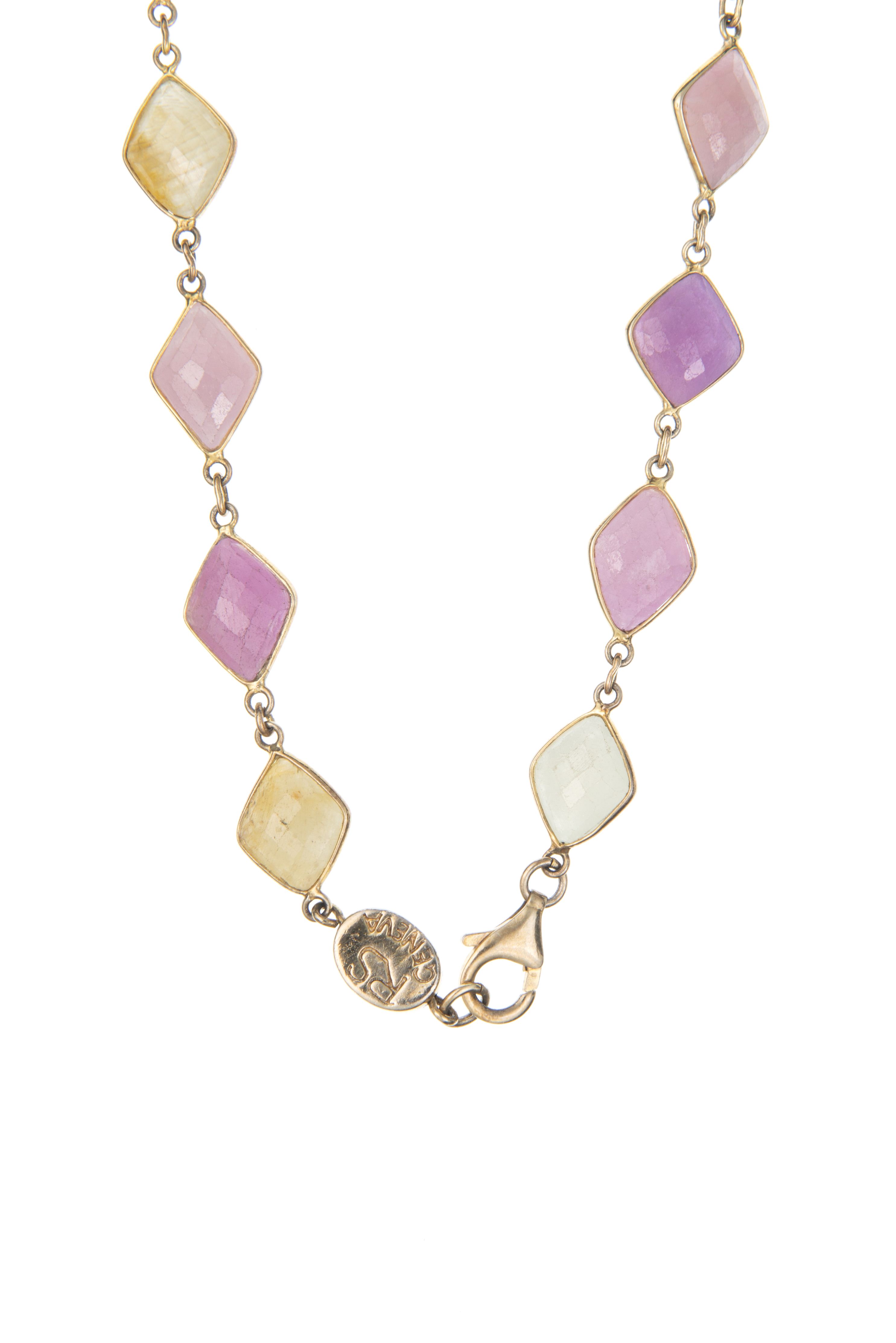 Sautoir en vermeil .925 signé Régine S. serti de quarente-quatre saphirs multicolores en forme de losanges facettés